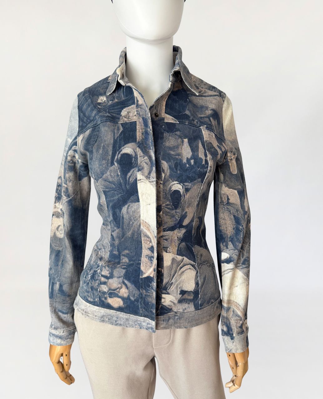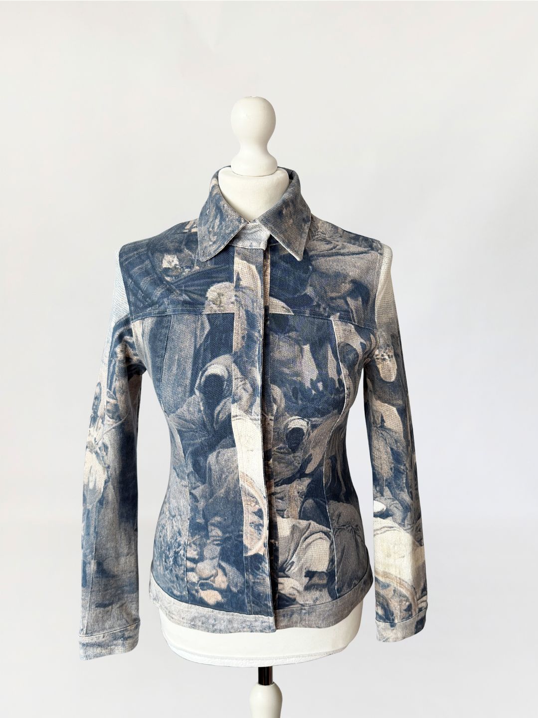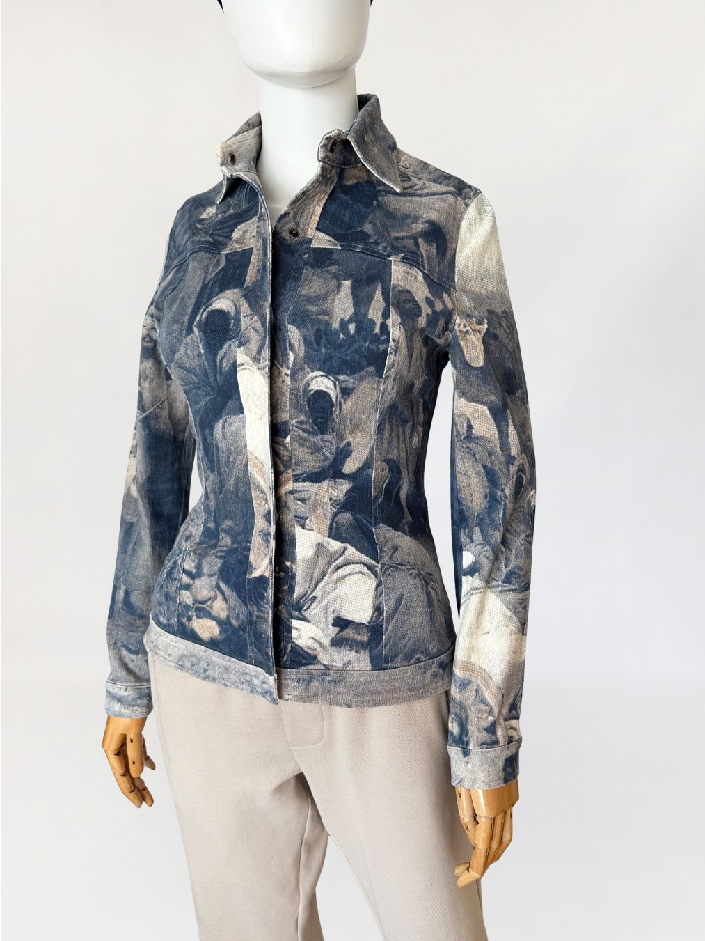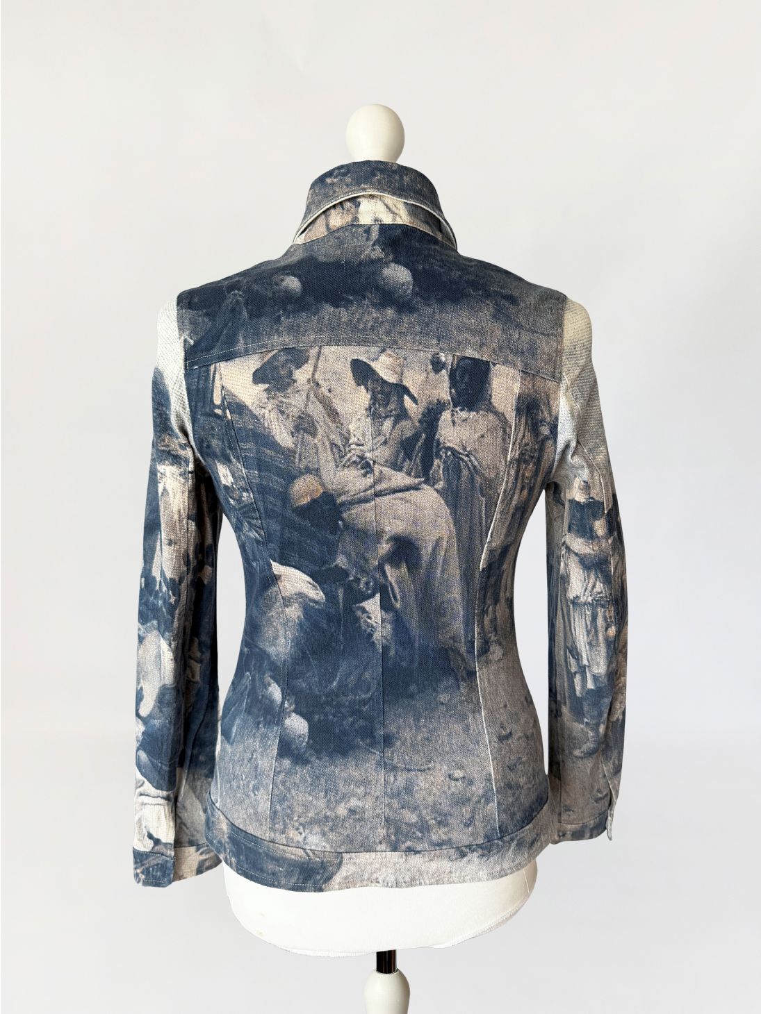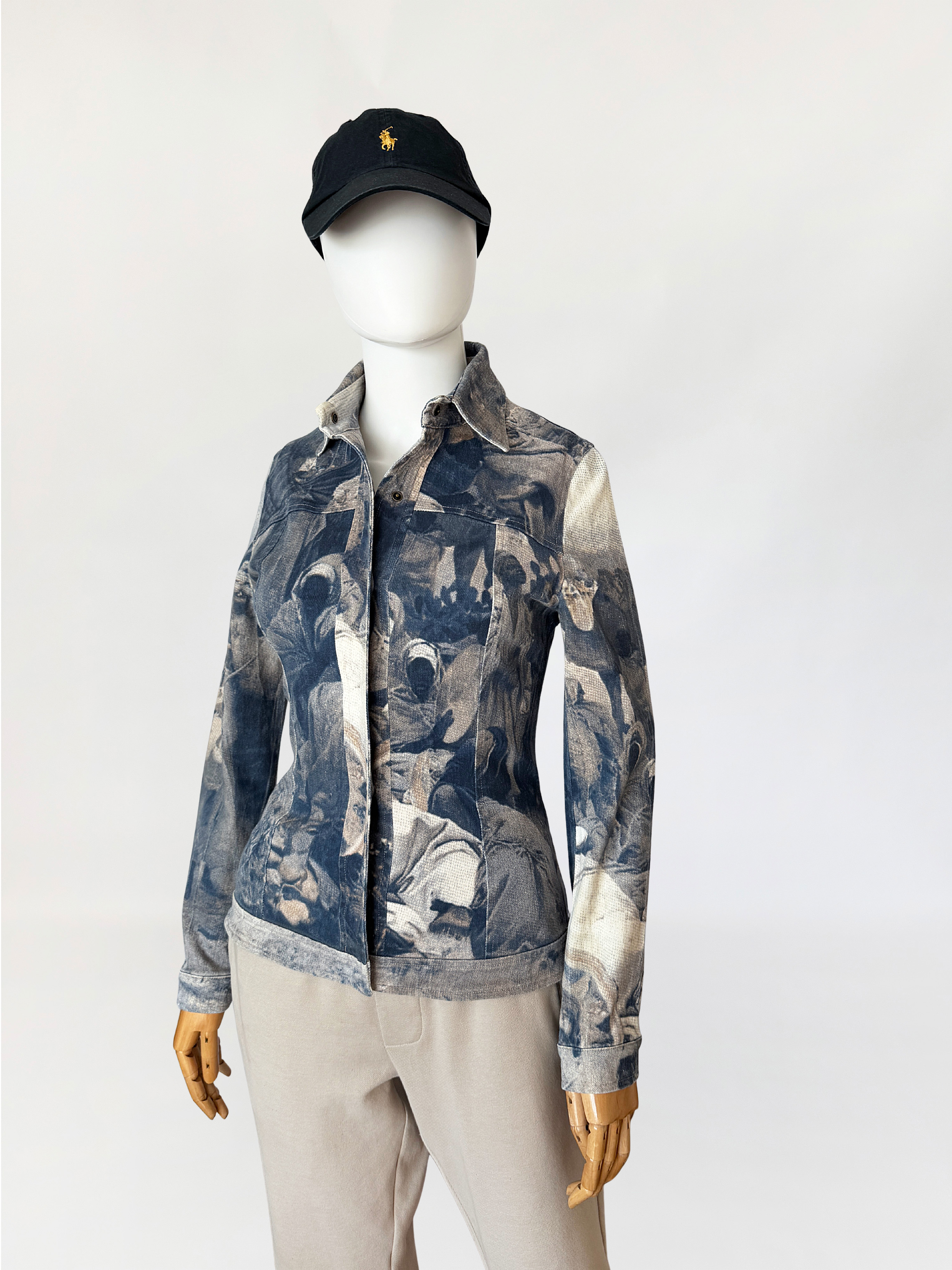 Kurtka vintage włoskiej marki segmentu premium D.Exterior. Wykonana z lekkiego jeansu z dodatkiem elastanu, w nadruki na całości tkaniny. Motyw oparty na scenie z udziałem ludzkich postaci, z sylwetkami i elementami otoczenia. Kompozycja ma miękko rozmyty, lekko przygaszony charakter, z widoczną strukturą tkaniny przenikającą przez nadruk (przypomina kolekcje od Alexandra McQueena z końca lat 90-tych). Krótki, dopasowany fason, z klasycznymi długimi rękawami. U góry nieduży kołnierz. Zapięcie kryte pod listwą, prowadzone centralnie na całej długości. Tył z karczkiem oraz profilującymi cięciami.