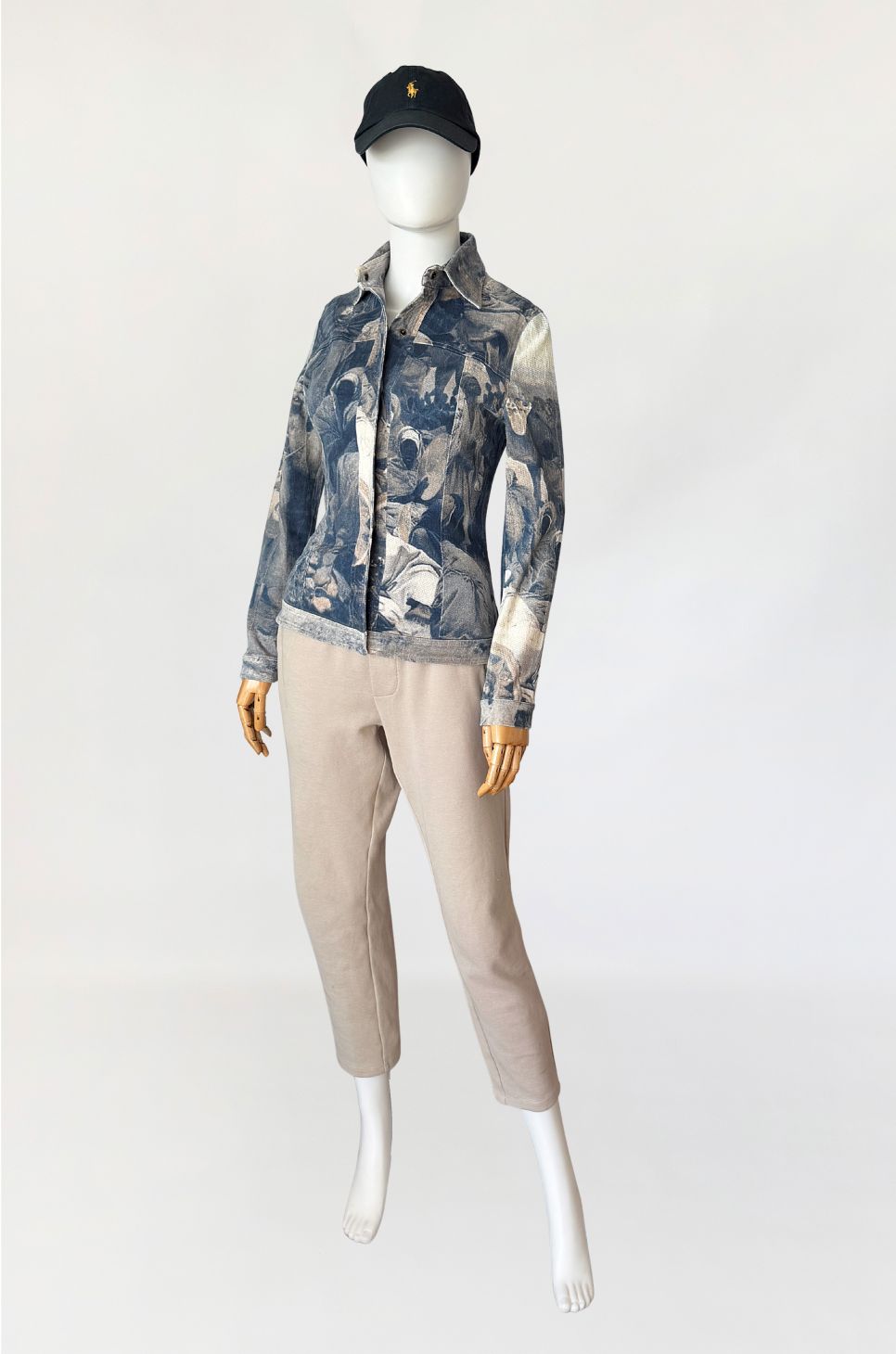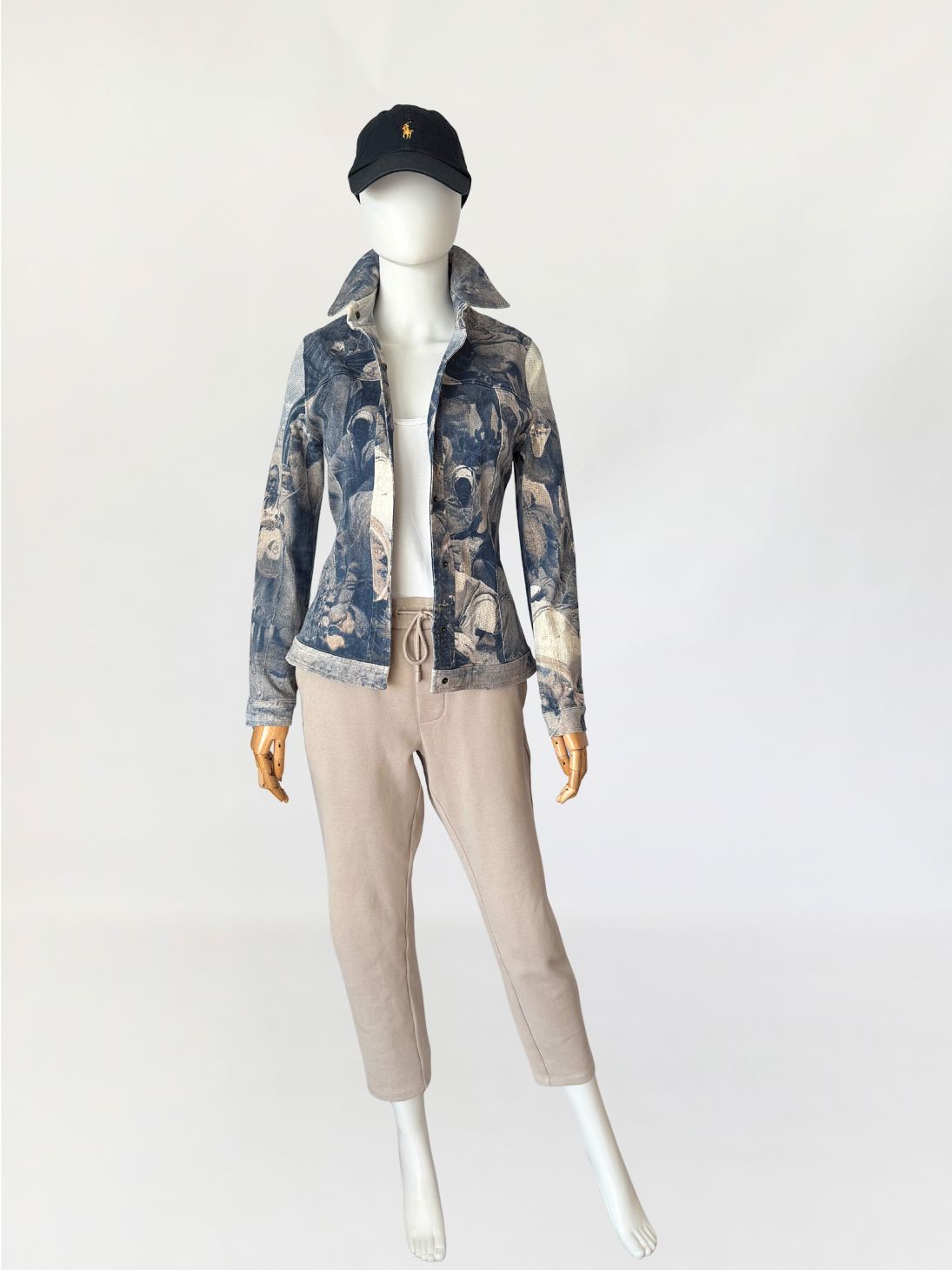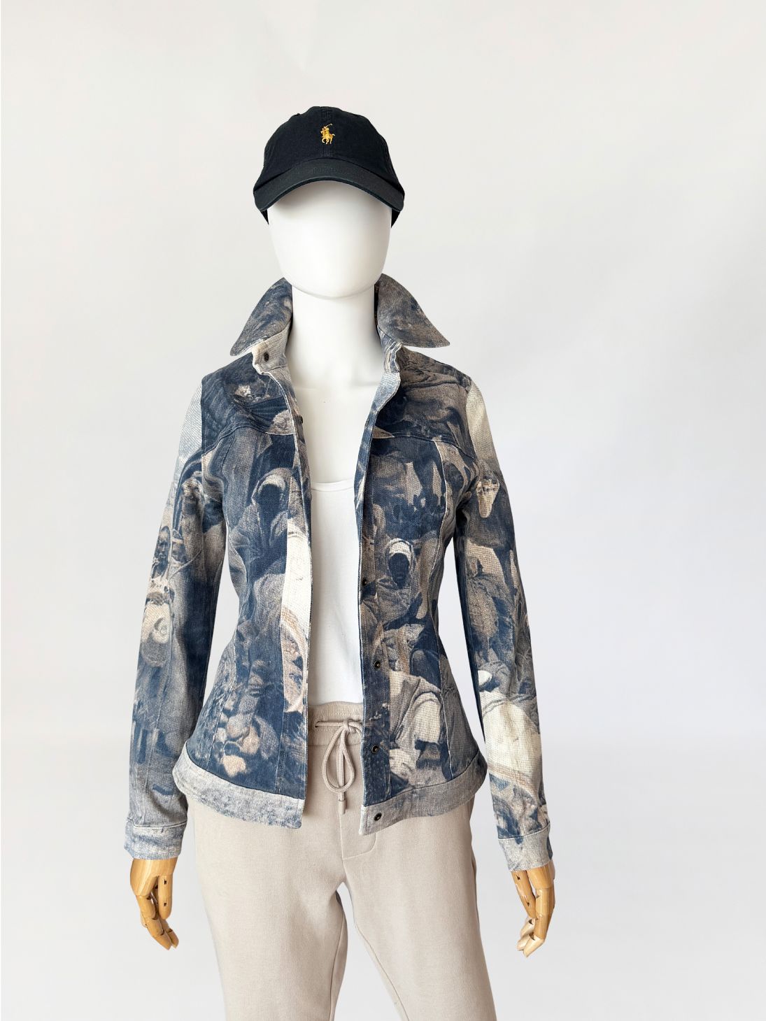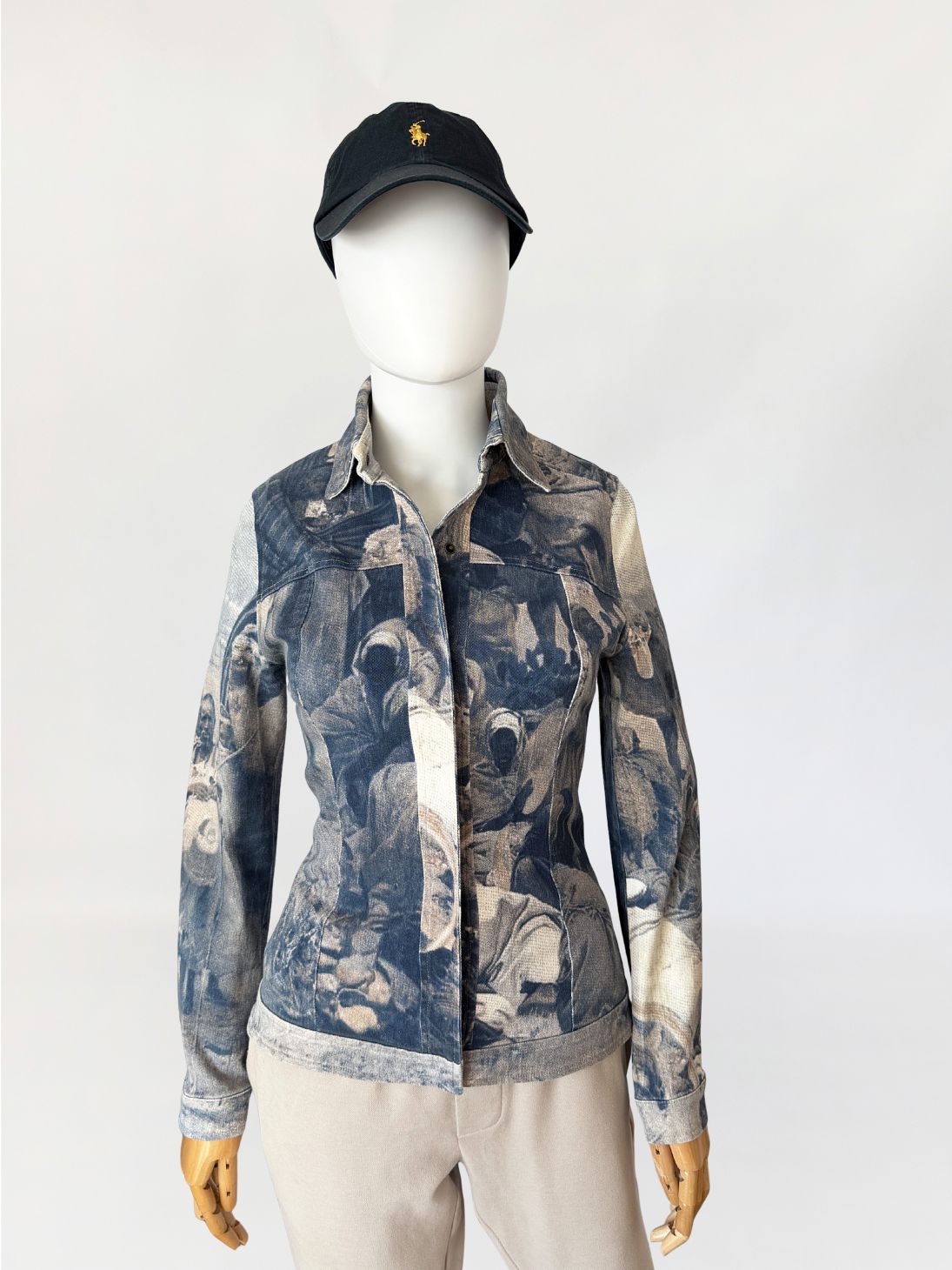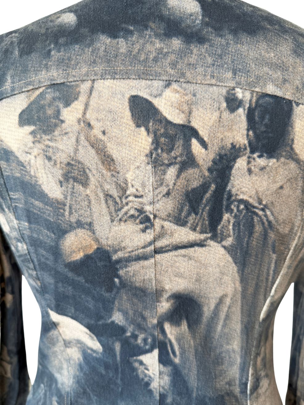 Kurtka vintage włoskiej marki segmentu premium D.Exterior. Wykonana z lekkiego jeansu z dodatkiem elastanu, w nadruki na całości tkaniny. Motyw oparty na scenie z udziałem ludzkich postaci, z sylwetkami i elementami otoczenia. Kompozycja ma miękko rozmyty, lekko przygaszony charakter, z widoczną strukturą tkaniny przenikającą przez nadruk (przypomina kolekcje od Alexandra McQueena z końca lat 90-tych). Krótki, dopasowany fason, z klasycznymi długimi rękawami. U góry nieduży kołnierz. Zapięcie kryte pod listwą, prowadzone centralnie na całej długości. Tył z karczkiem oraz profilującymi cięciami.