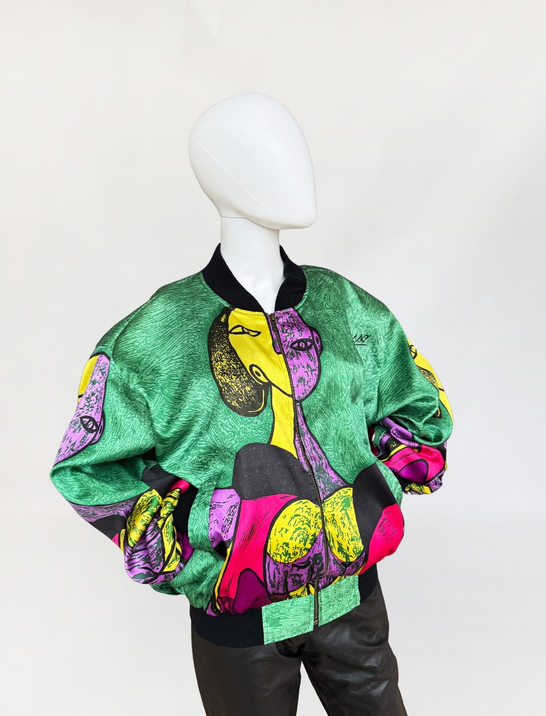 Kultowy, kolekcjonerski bomber Picasso. Uszyty z delikatnej satynowej tkaniny w kolorowe kubistyczne wzory. Fason oversize, unisex. U dołu elastyczny ściągacz. Po bokach wsuwane kieszenie. Od wewnątrz na podszewce. Rzadki egzemplarz o unikatowym deseniu. Zachowany w bardzo dobrym stanie.