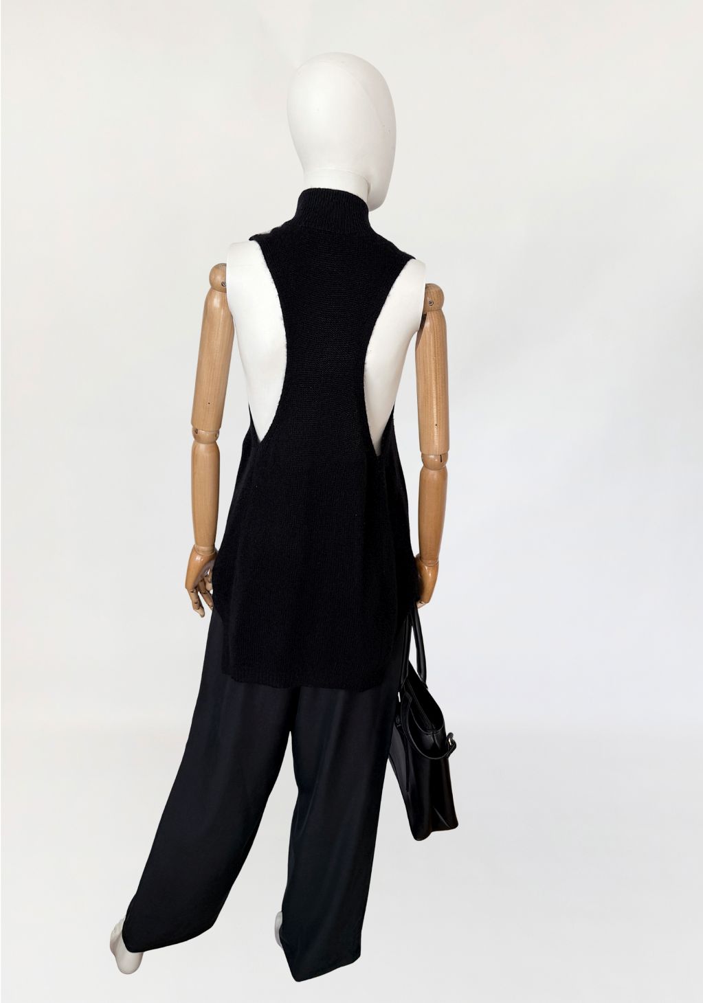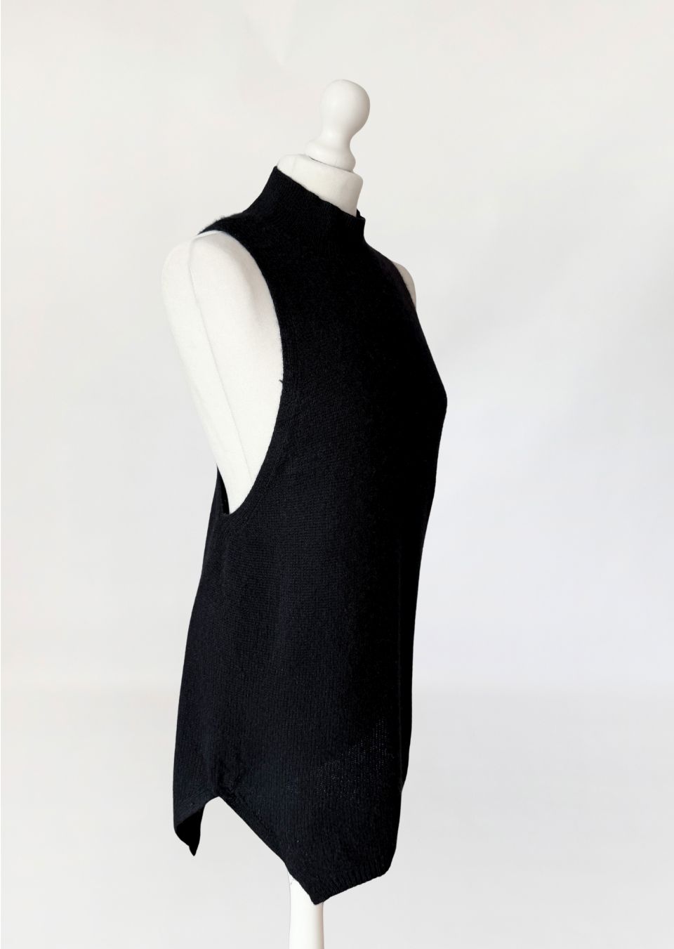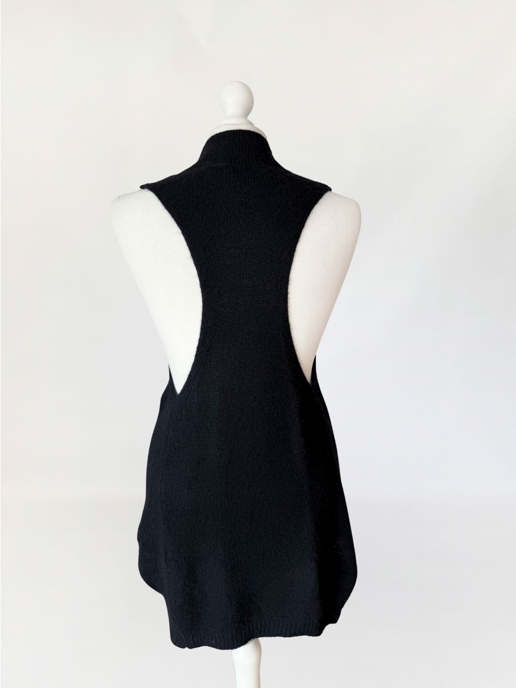 Minimalistyczny sweter - top, wykonany z kaszmiru w czarnym kolorze. Model o wydłużonej formie. Fason bez rękawów, z zabudowanym dekoltem typu stójka oraz głęboko wyciętymi pachami w konstrukcji inspirowanej krojem bokserki, z mocno odsłoniętą linią pleców. Cena sklepowa ok 1300 zł