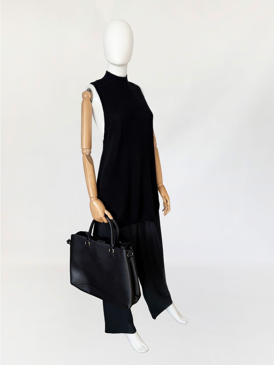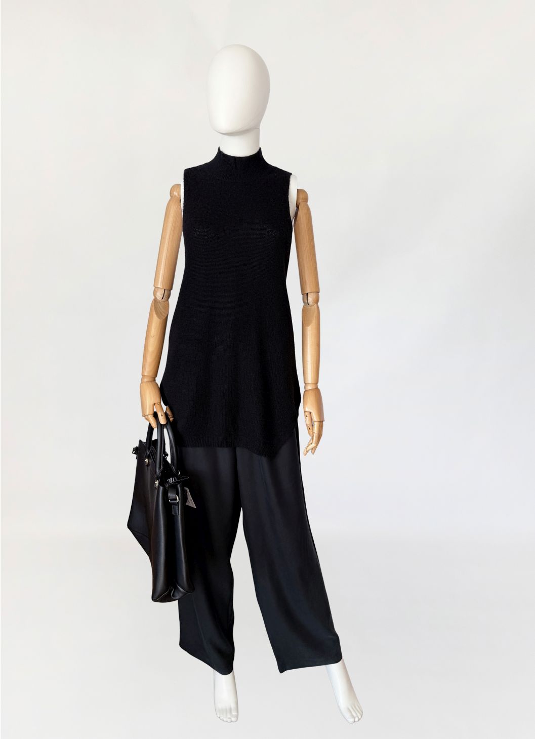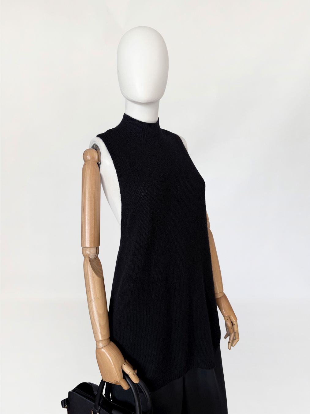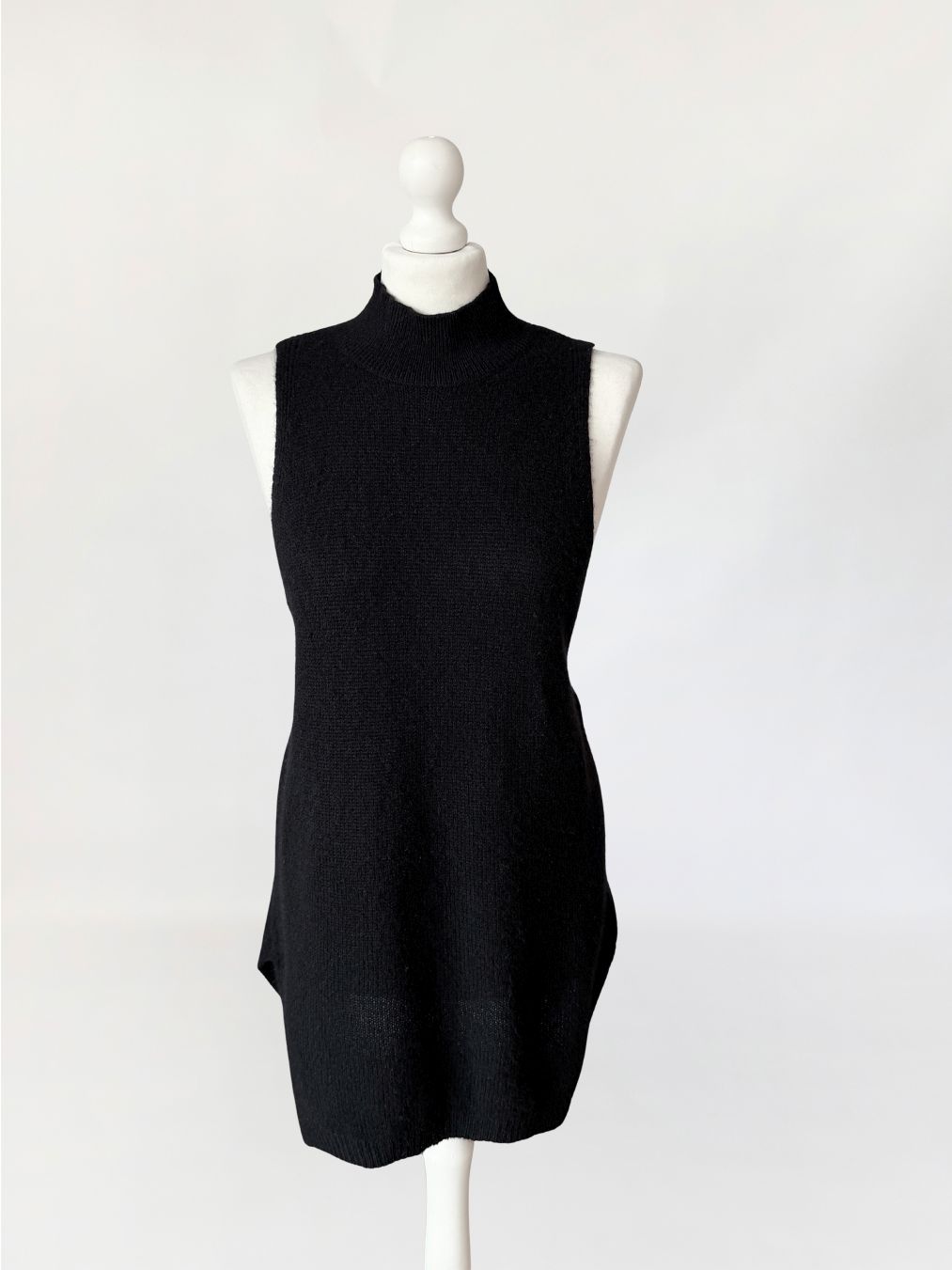 Minimalistyczny sweter - top, wykonany z kaszmiru w czarnym kolorze. Model o wydłużonej formie. Fason bez rękawów, z zabudowanym dekoltem typu stójka oraz głęboko wyciętymi pachami w konstrukcji inspirowanej krojem bokserki, z mocno odsłoniętą linią pleców. Cena sklepowa ok 1300 zł