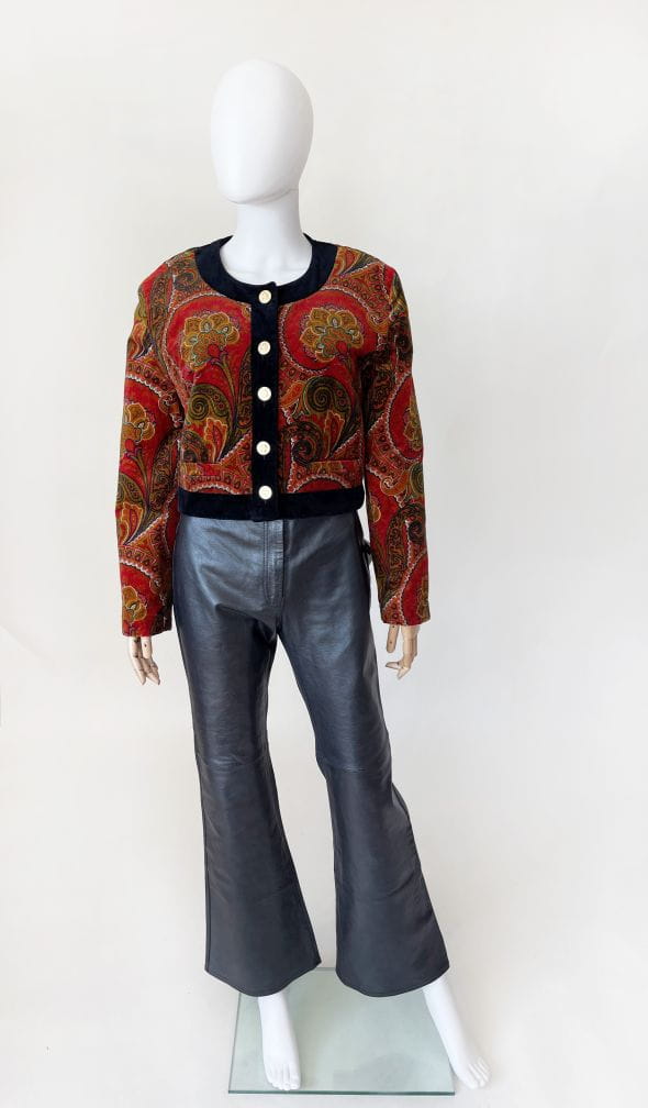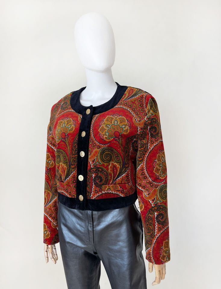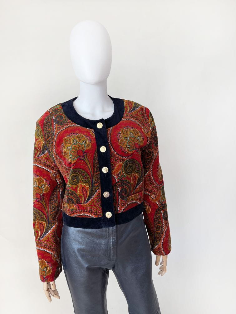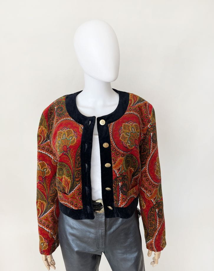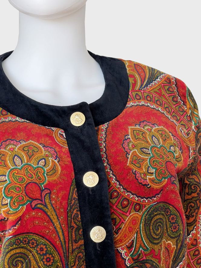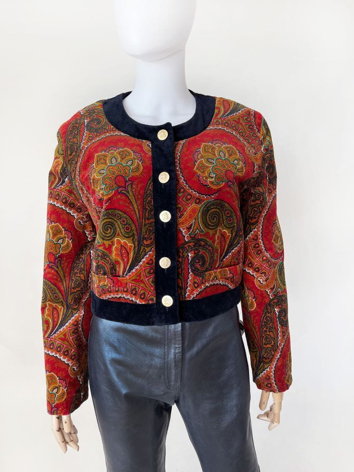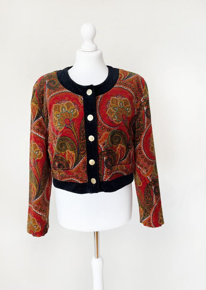Pudełkowa bomberka true vintage marki Betty Barclay. Wykonana ze szlachetnego aksamitu w piękne barwne wzory: mandale, paisley i drobne folkowe motywy. Zapinana na duże złote guziki z grawerem aniołów. Krótki fason z okrągłym dekoltem i przeszyciami karo tworzącymi efekt pikowania tkaniny. Rzadki okaz nie do kupienia w regularnej sprzedaży.