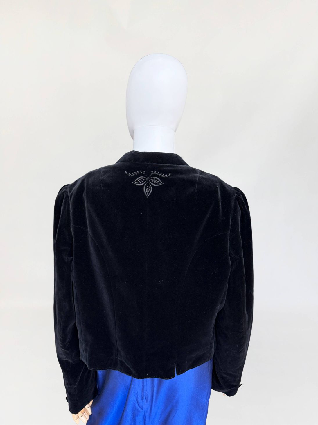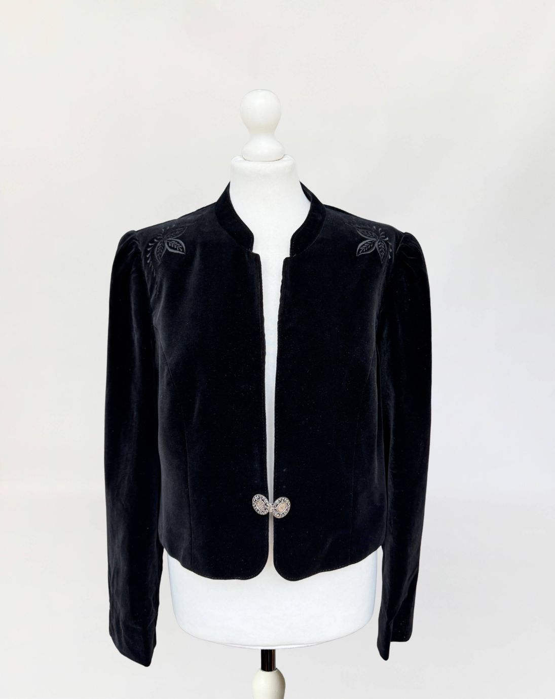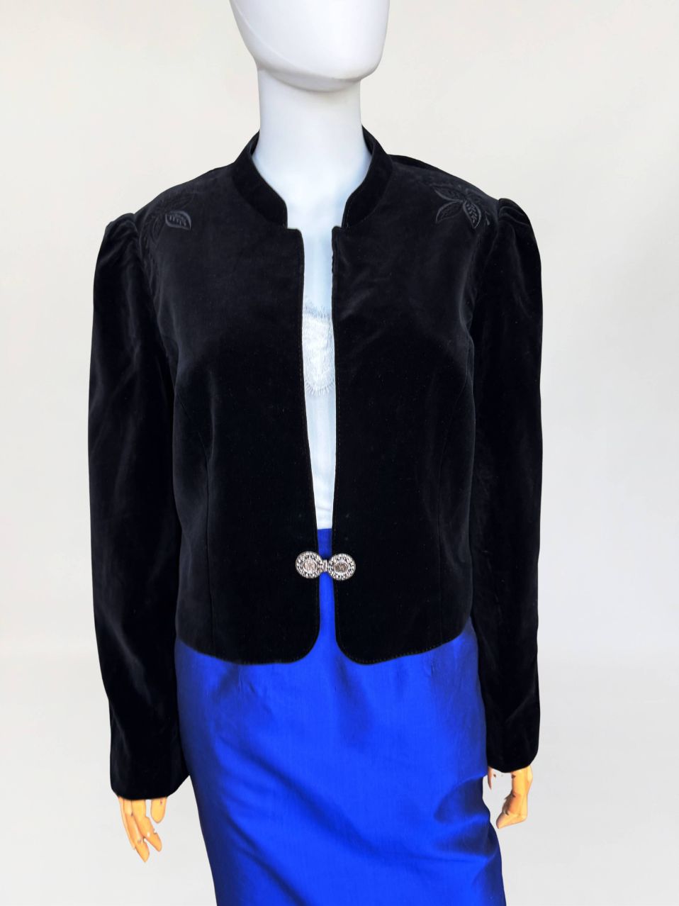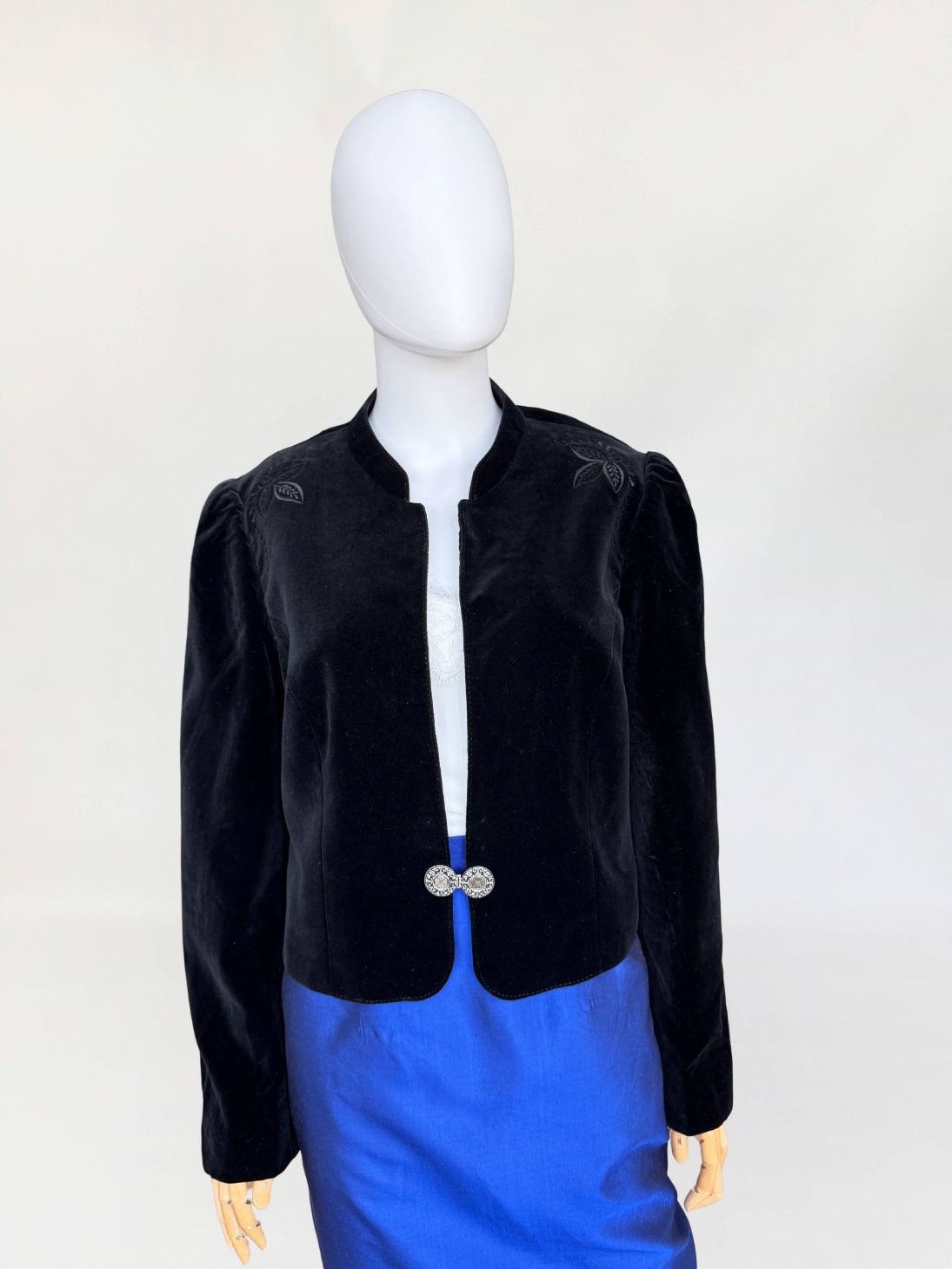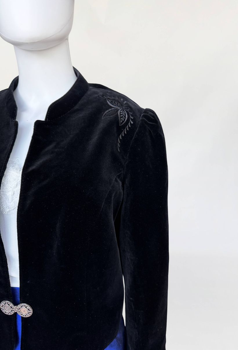 Austriacki żakiet vintage z lat 80-tych wykonany ze szlachetnego, miękkiego aksamitu w klasycznej czerni. Długie rękawy, lekko bufiaste w ramionach. Front zapinany na metalowy szamerunek. W górnej części, na wysokości obojczyków i karku, umieszczone subtelne aplikacje haftowane.