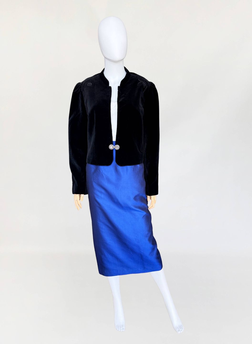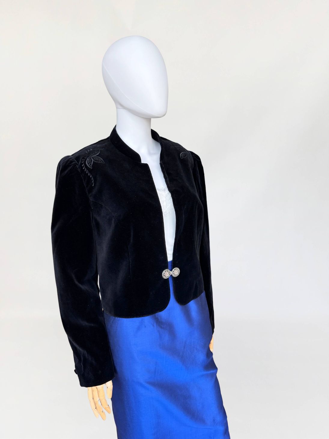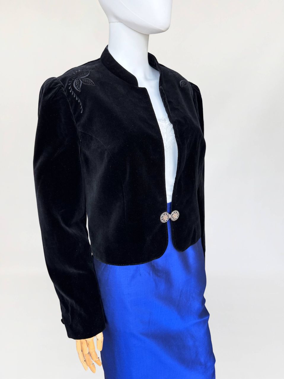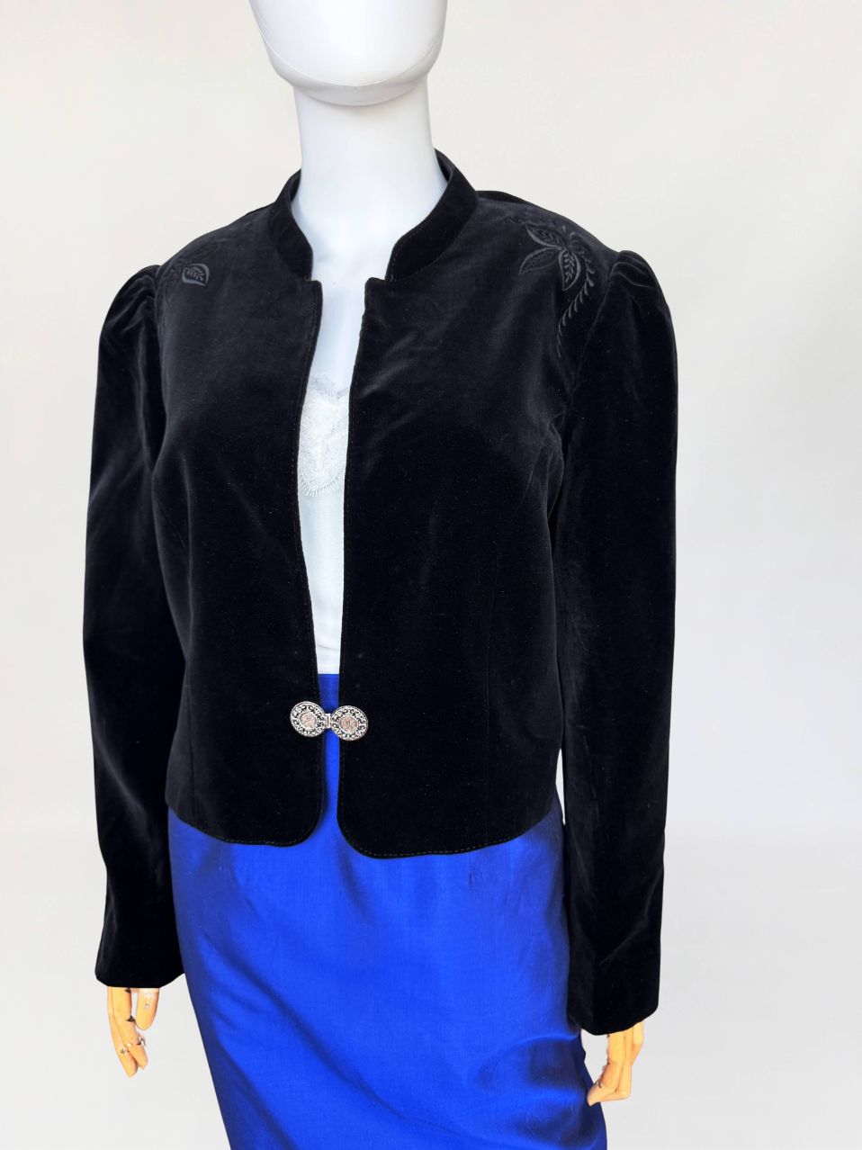 Austriacki żakiet vintage z lat 80-tych wykonany ze szlachetnego, miękkiego aksamitu w klasycznej czerni. Długie rękawy, lekko bufiaste w ramionach. Front zapinany na metalowy szamerunek. W górnej części, na wysokości obojczyków i karku, umieszczone subtelne aplikacje haftowane.