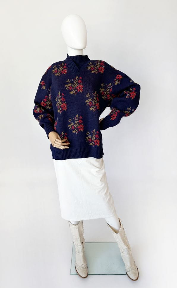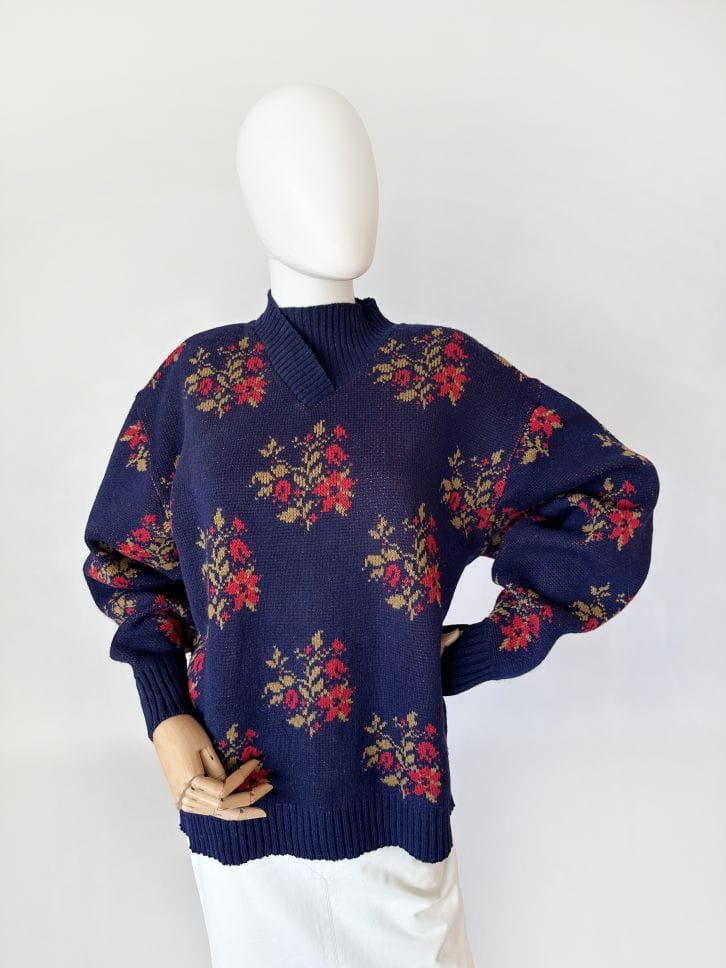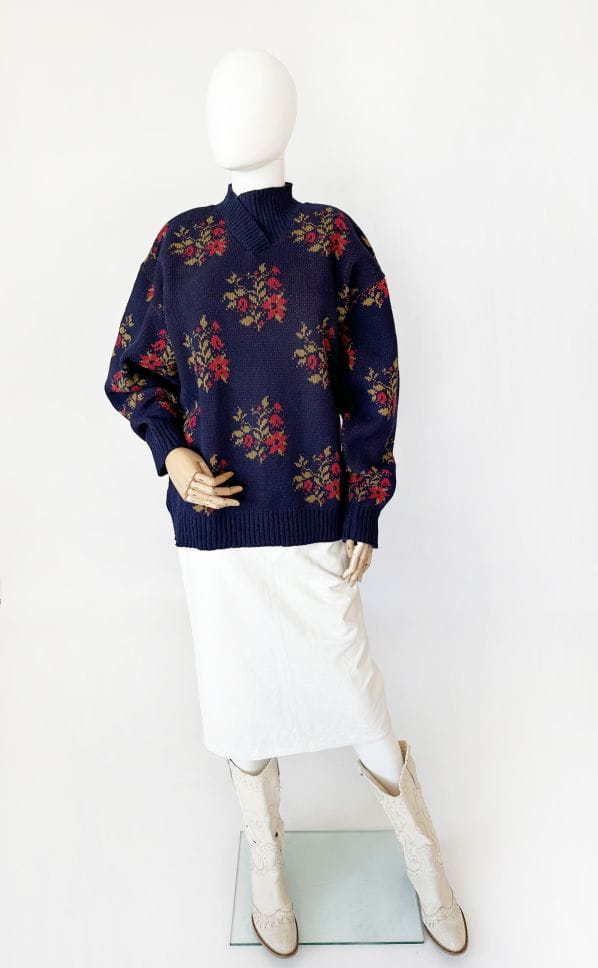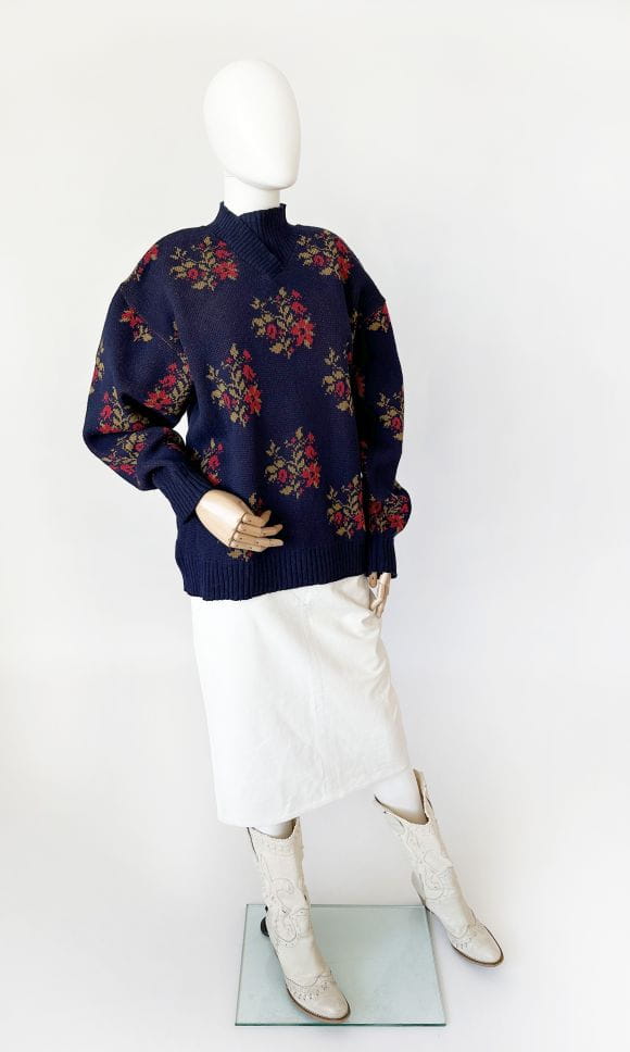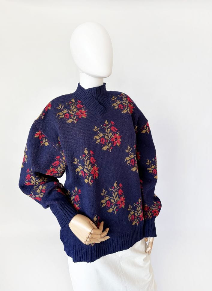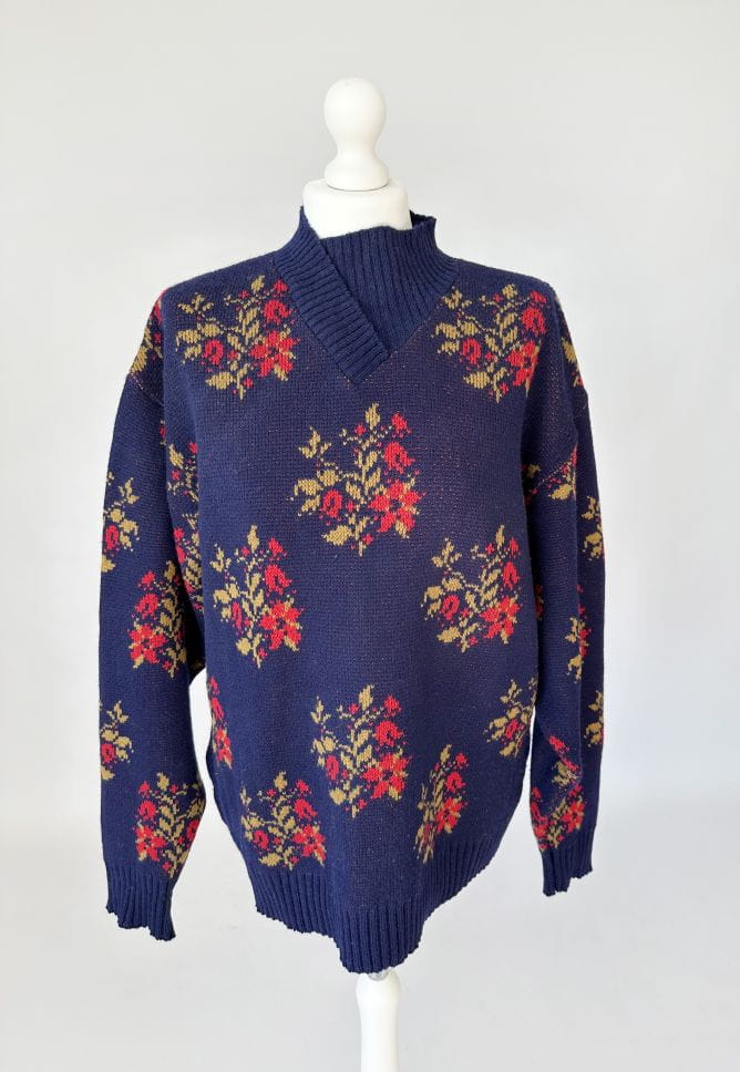 Sweter vintage projektu renomowanej islandzkiej marki Alafoss. Wykonany w całości z certyfikowanej wełny dziewiczej. Oversize'owy fason z klasycznie wszytymi rękawami i zabudowanym dekoltem w formie kopertowej stójki. Na całości regularne kwiatowe wzory.