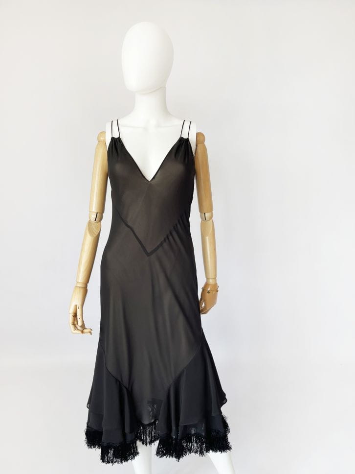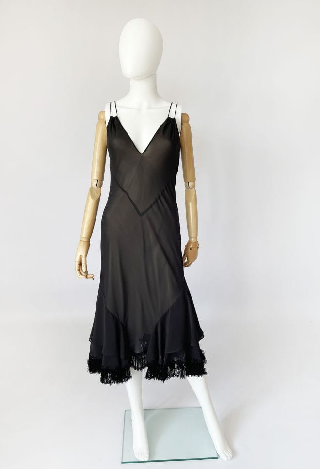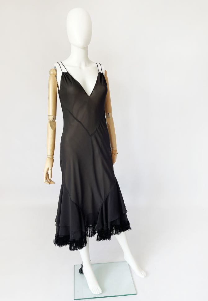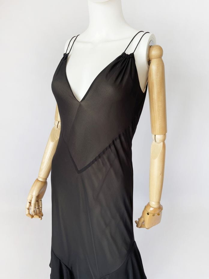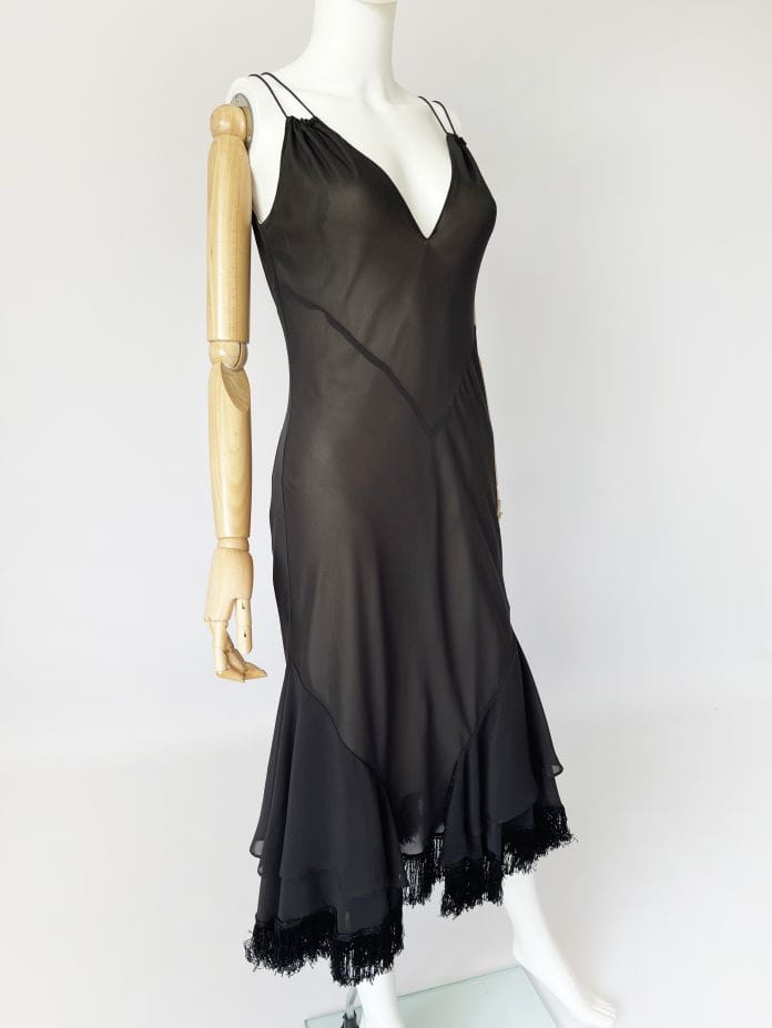 Koktajlowo-wieczorowa sukienka luksusowej marki Amanda Wakeley. Sukienkę uszyto z ultra lekkiej tkaniny, która otula ciało jak druga skóra. Delikatna podszewka w odcieniu nude doskonale współgra z lekko transparentną ciemną tkaniną wierzchnią. Prosty, swobodny fason, który lekko rozkłada się na samym dole za sprawą falbaniastych wstawek. Góra na podwójnych ramiączkach z dekoltem "V", wyciętym w identyczny sposób także na plecach .Pomimo swojej minimalistycznej formy robi wrażenie, bo właśnie prostota jest jej największym atutem. Żeby nie było jednak nazbyt klasycznie, projektantka pokusiła się o elegancki detal w postaci gęstych frędzli, którymi wykończono dół sukienki. Amanda Wakeley to luksusowa brytyjska marka, która powstała w 1990 roku. Jej projekty nosiła księżna Diana i królowa Jordanii Rania, a także m.in Angelina Jolie, Beyonce i Scarlett Johansson. Twórczyni kultowej marki - Amanda Wakeley, otrzymała w 2010 order Imperium Brytyjskiego (OBE) za zasługi dla brytyjskiej mody. Ceny sukienek na topowych platformach typu Outnet sięgają kilku tysięcy euro, a na rynku wtórnym będą rosły ze względu na to że marka jest w trakcie likwidacji.