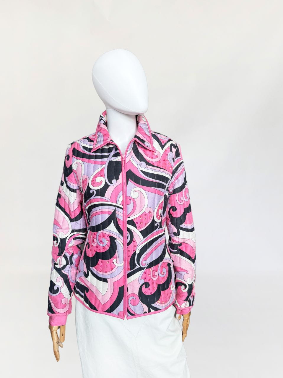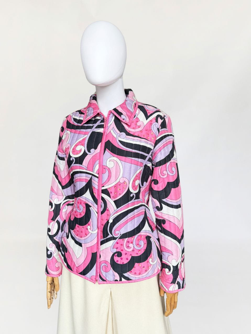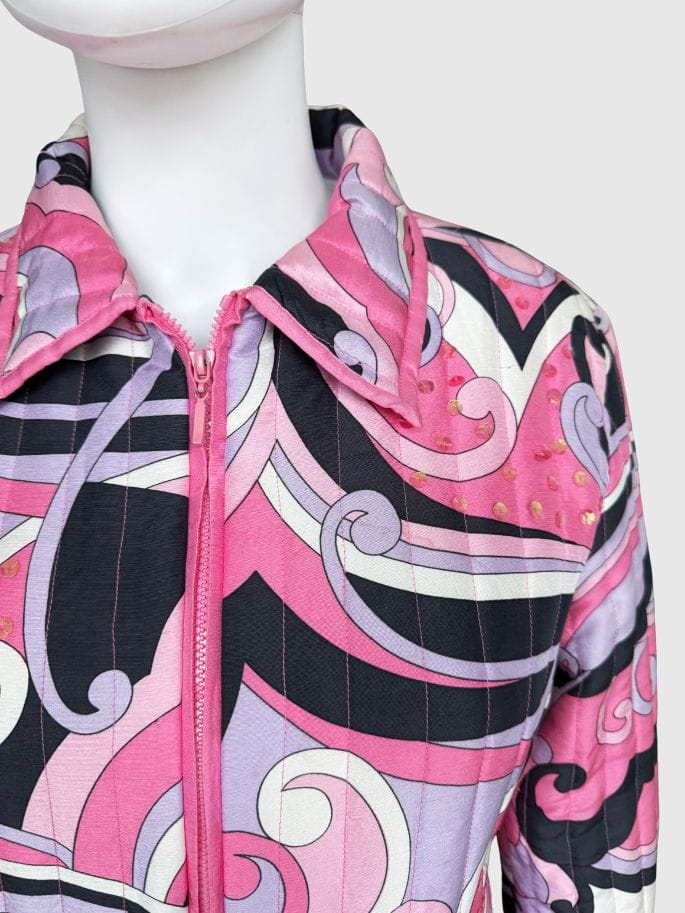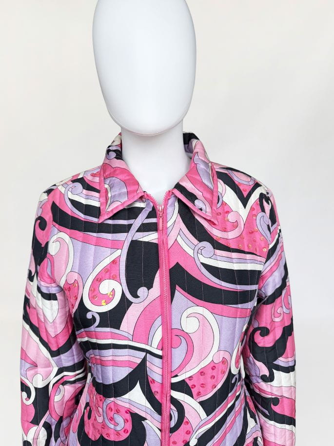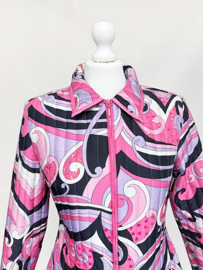 Lekka pikowana kurtka marki Anne Carson. Wykonana z jedwabnej tkaniny w kolorowe wzory w stylu Pucci'ego. Taliowoany fason z długimi rękawami i niedużym kołnierzem. Dyskretne zdobienia z cekinów.