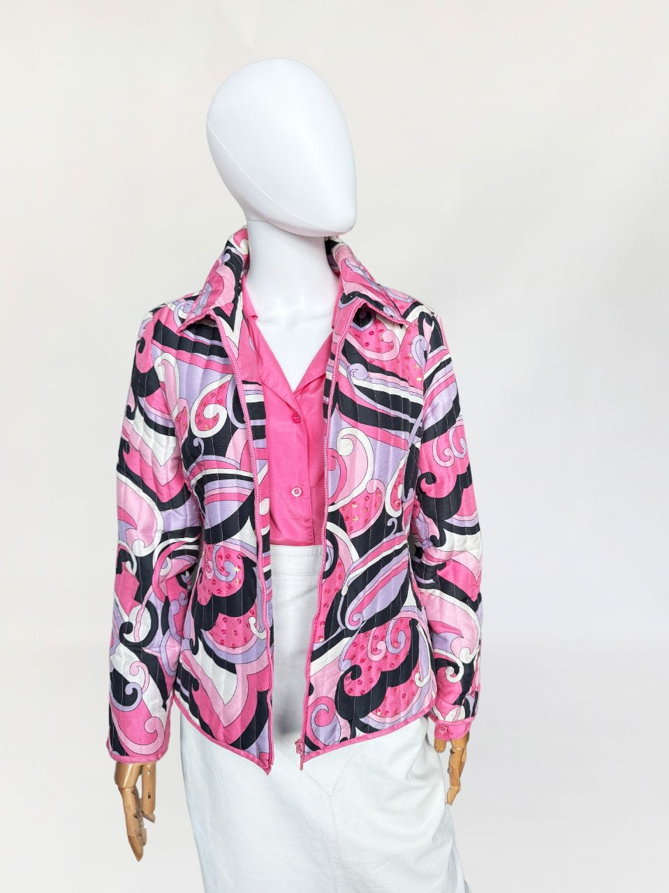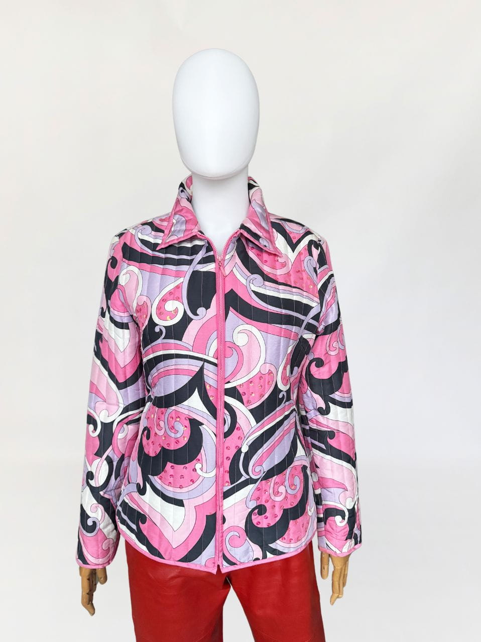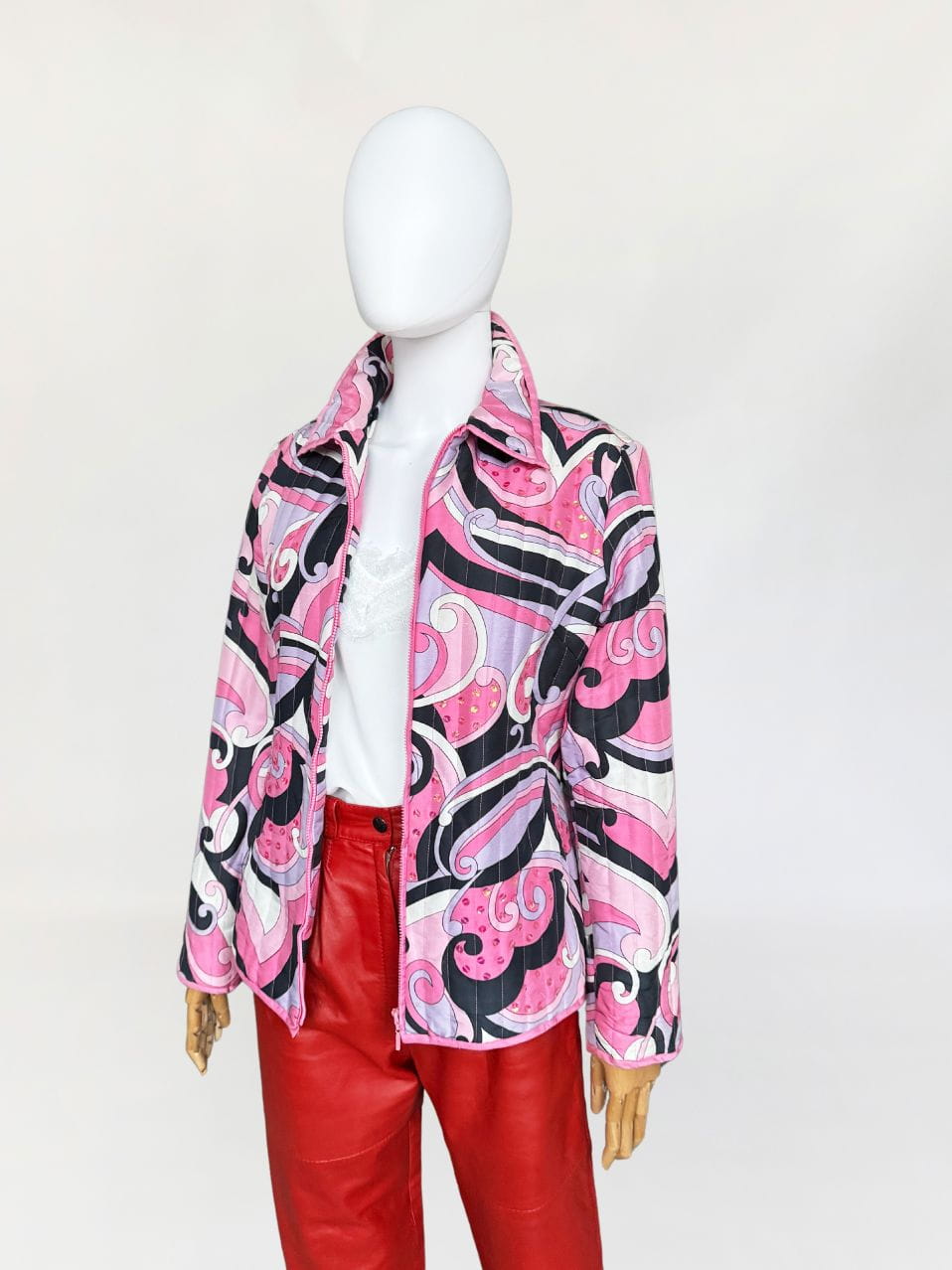 Lekka pikowana kurtka marki Anne Carson. Wykonana z jedwabnej tkaniny w kolorowe wzory w stylu Pucci'ego. Taliowoany fason z długimi rękawami i niedużym kołnierzem. Dyskretne zdobienia z cekinów.