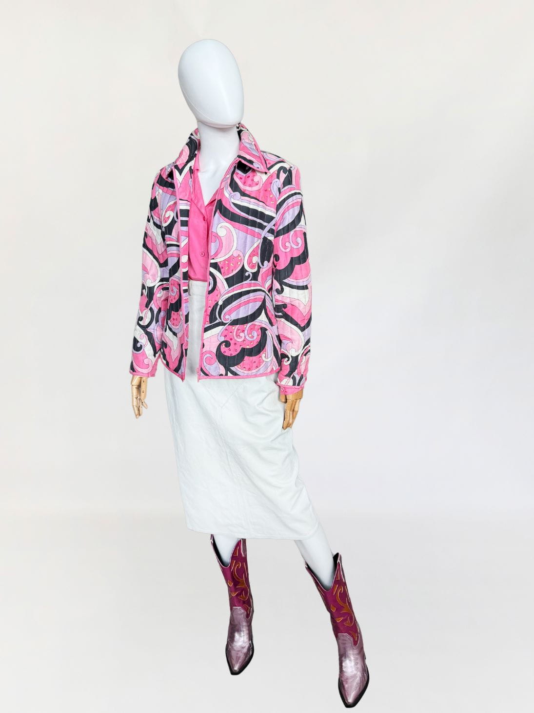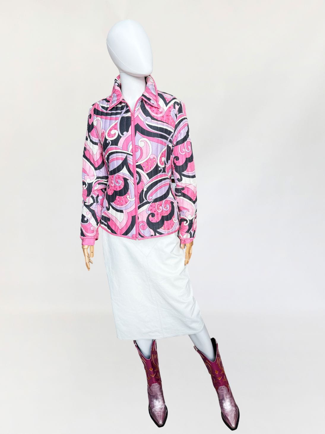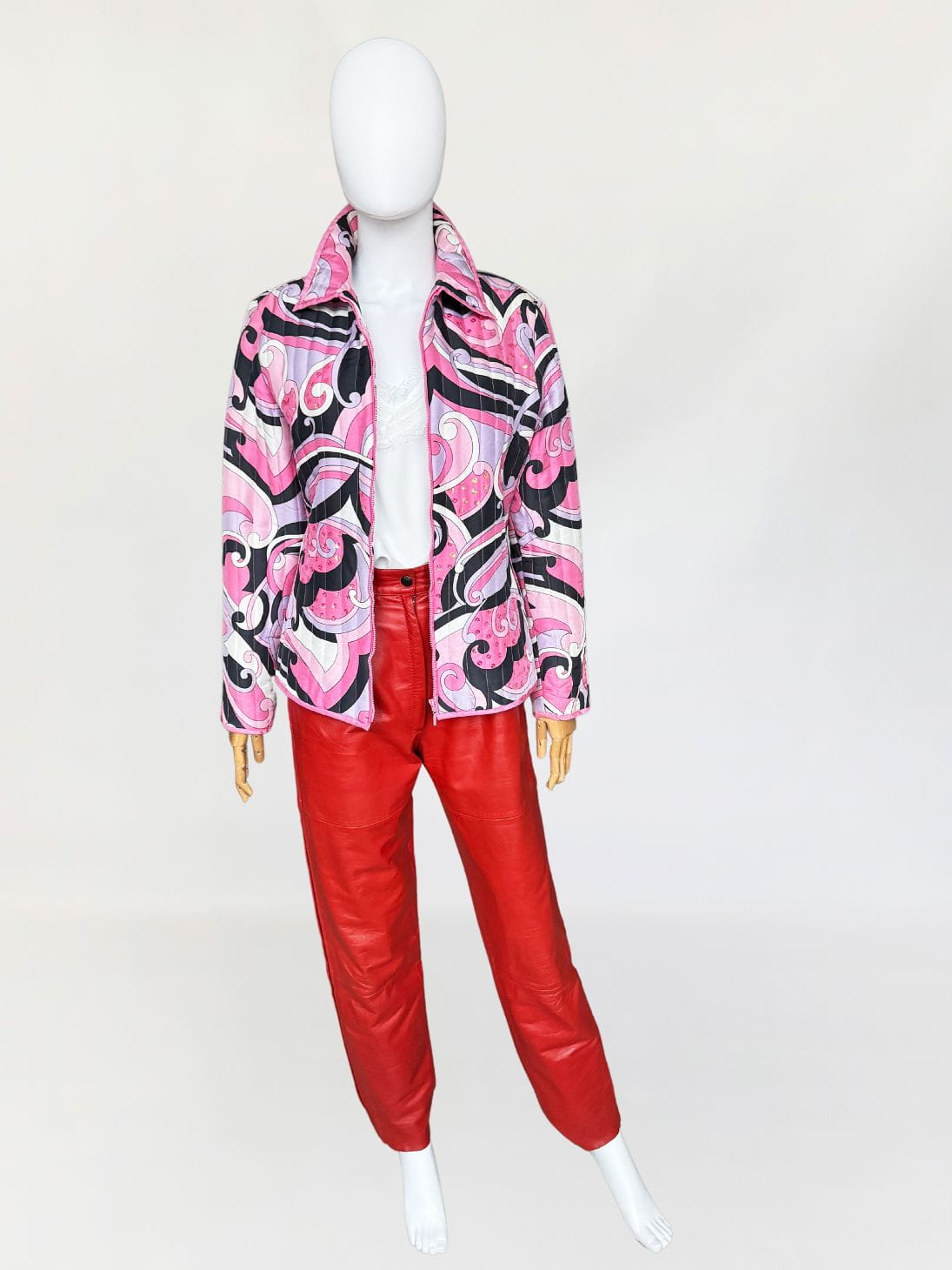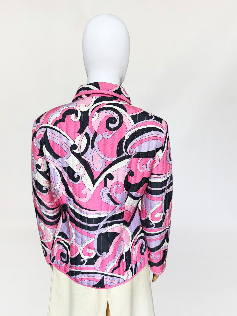 Lekka pikowana kurtka marki Anne Carson. Wykonana z jedwabnej tkaniny w kolorowe wzory w stylu Pucci'ego. Taliowoany fason z długimi rękawami i niedużym kołnierzem. Dyskretne zdobienia z cekinów.