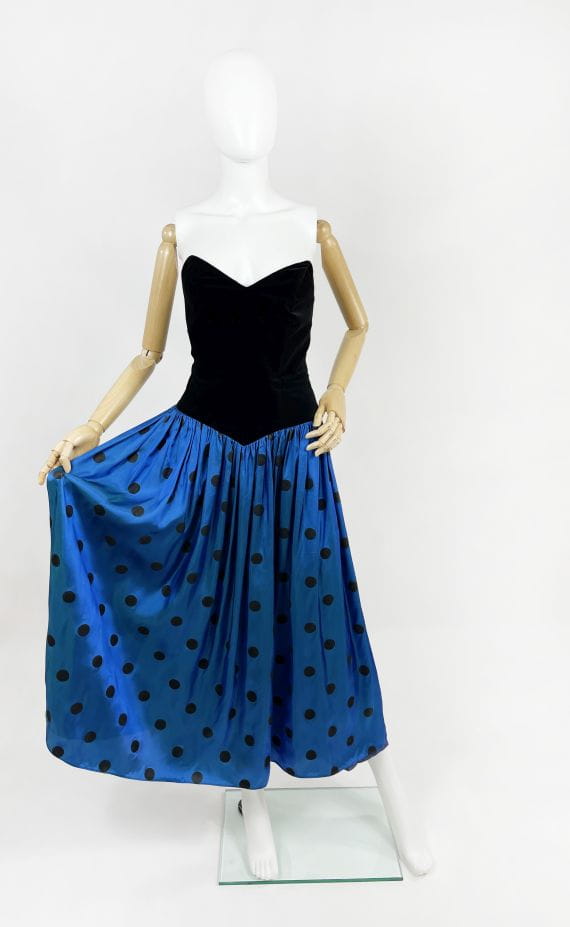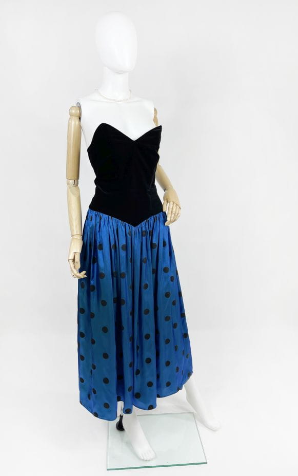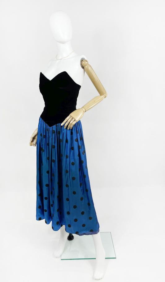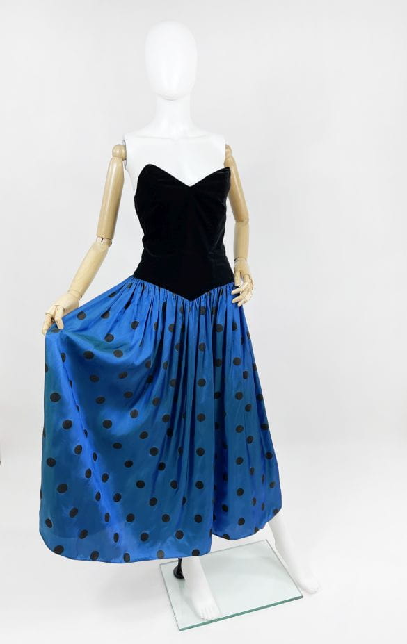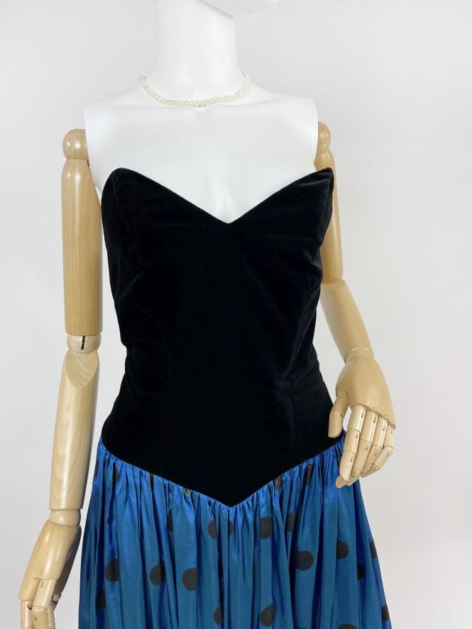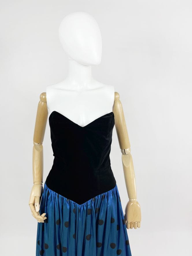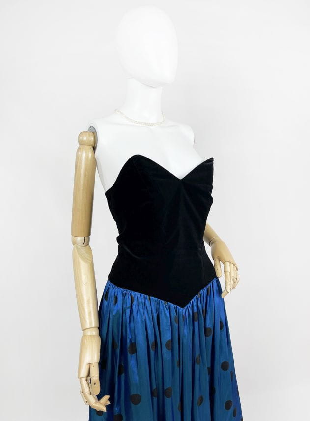 Zjawiskowa fancy dress vintage z lat 80-tych marki Augustat. Gorsetowa welurowa góra usztywniana fiszbinami. Doskonale podkreśla talię i dekolt. Dolna partia mocno rozłożysta o deseniu w grochy. Kwintesencja lat 80-tych! Model z podszewką.