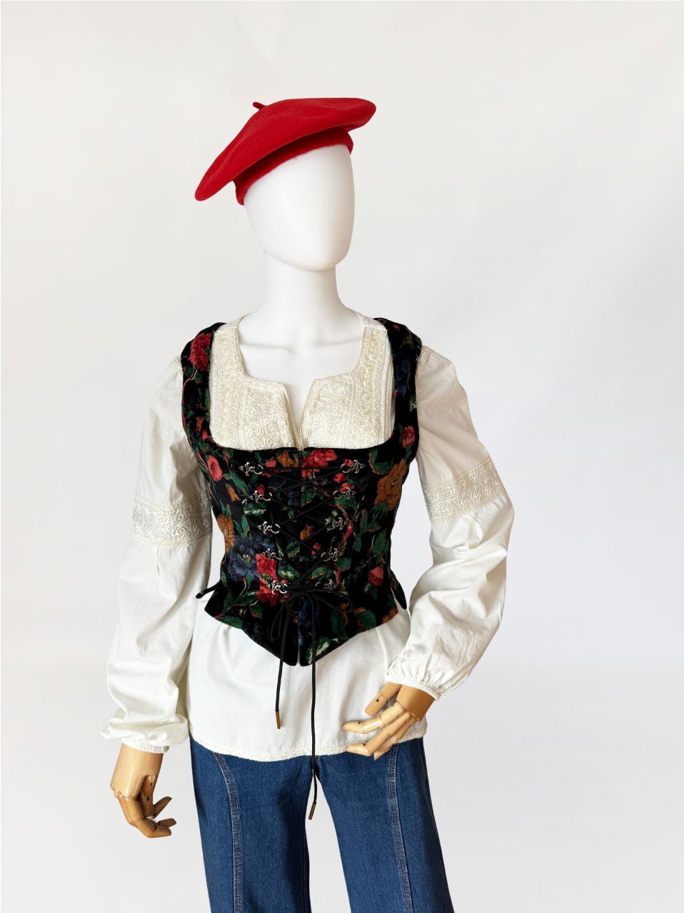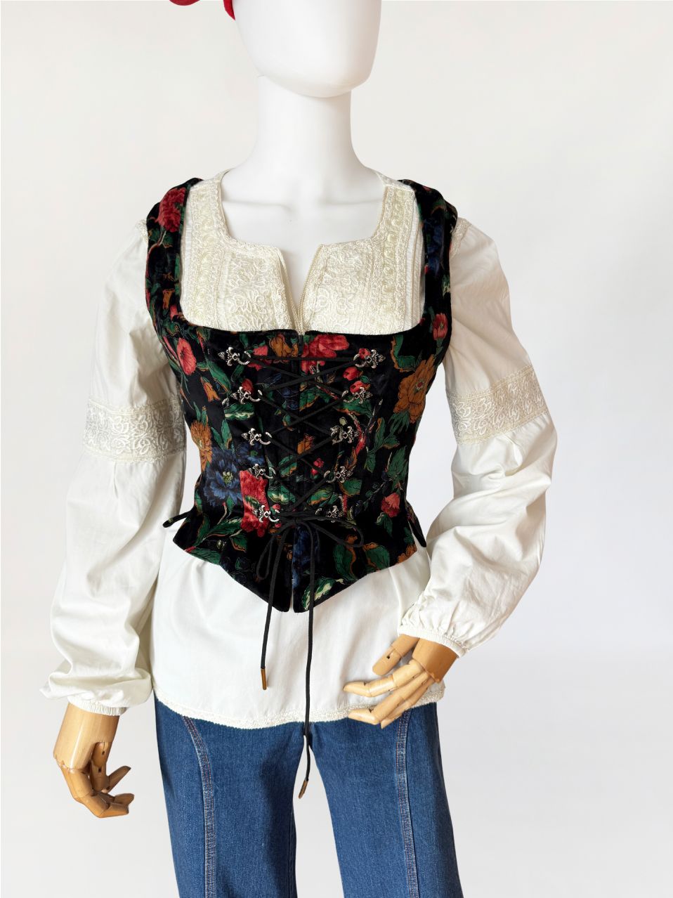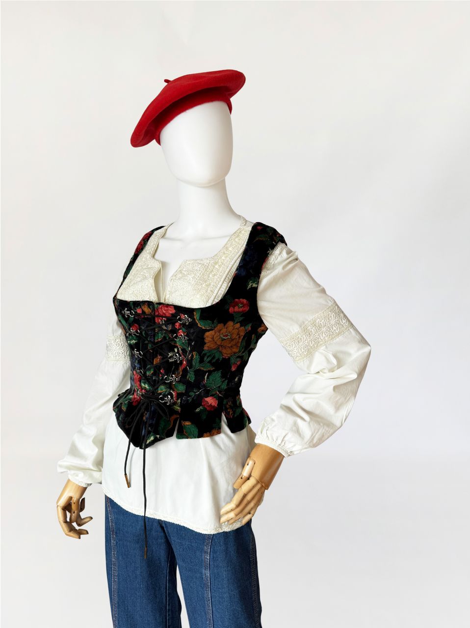Austriacki gorset vintage wykonany z aksamitnej tkaniny w kwiatowe wzory. Front ze sznurowaniem (w komplecie nie ma rzemyka), dzięki któremu dokładniej dostosujesz obwód do swojej sylwetki, dodatkowo zasuwany na zamek.