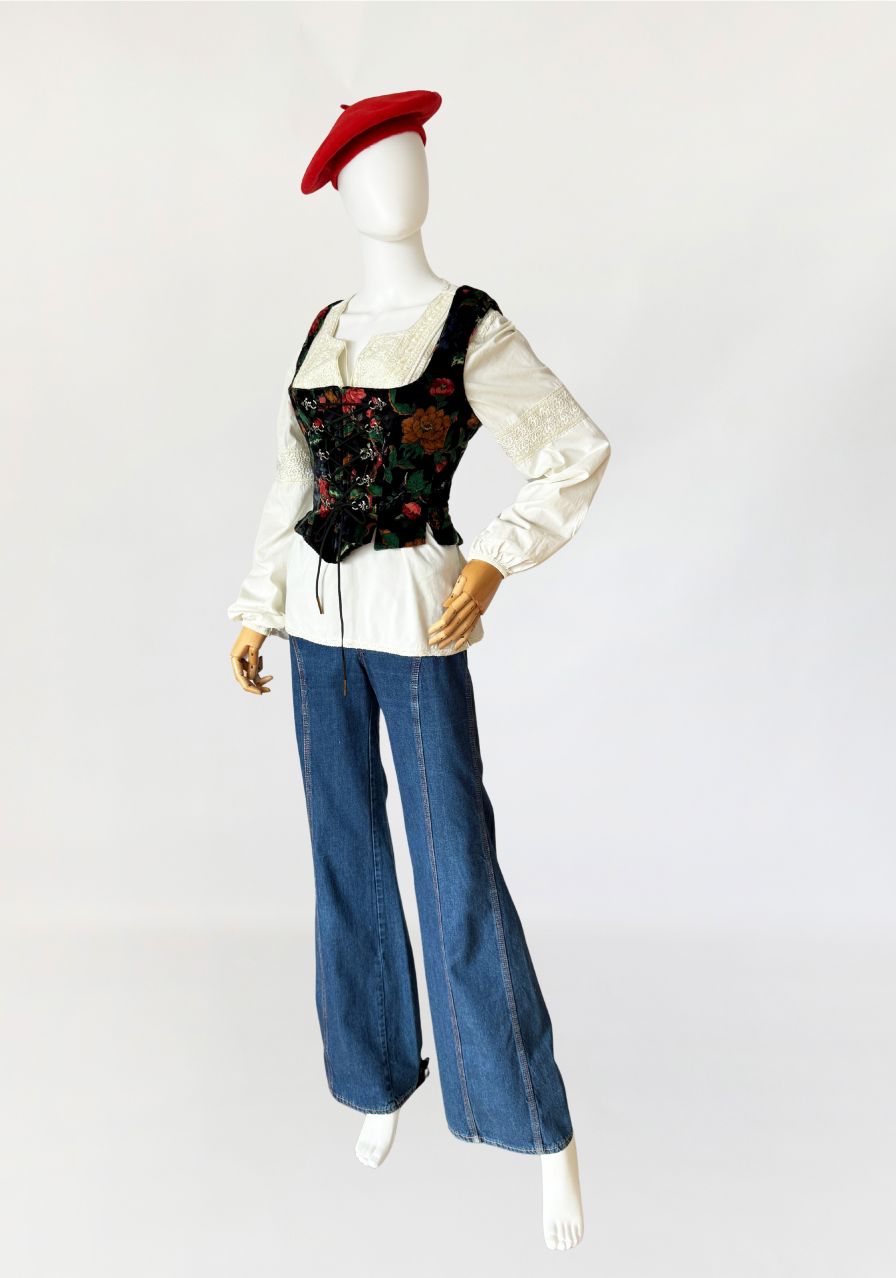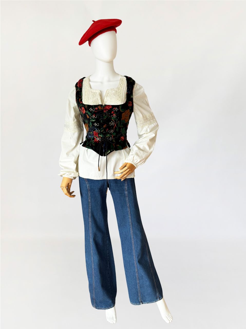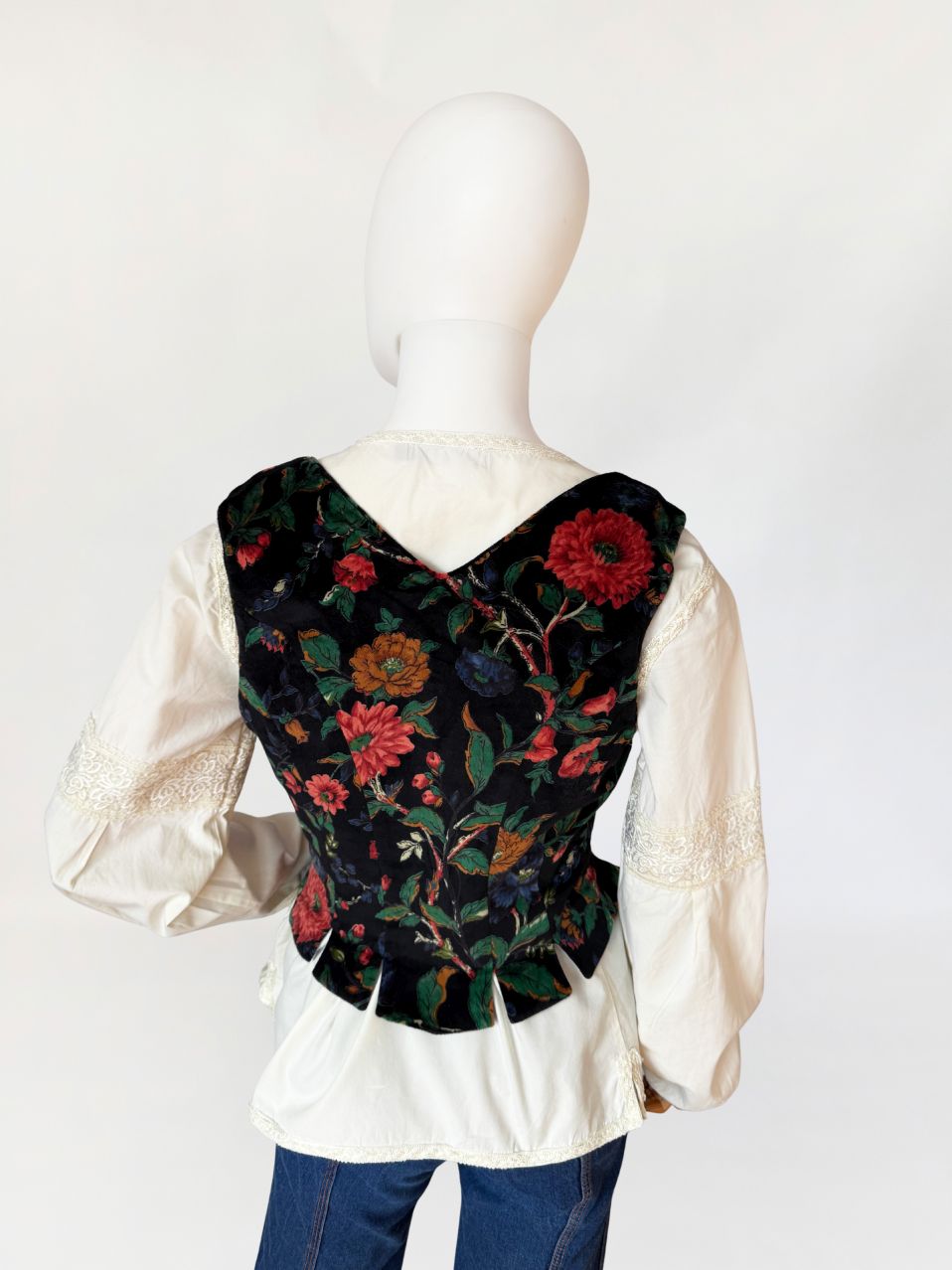 Austriacki gorset vintage wykonany z aksamitnej tkaniny w kwiatowe wzory. Front ze sznurowaniem (w komplecie nie ma rzemyka), dzięki któremu dokładniej dostosujesz obwód do swojej sylwetki, dodatkowo zasuwany na zamek.