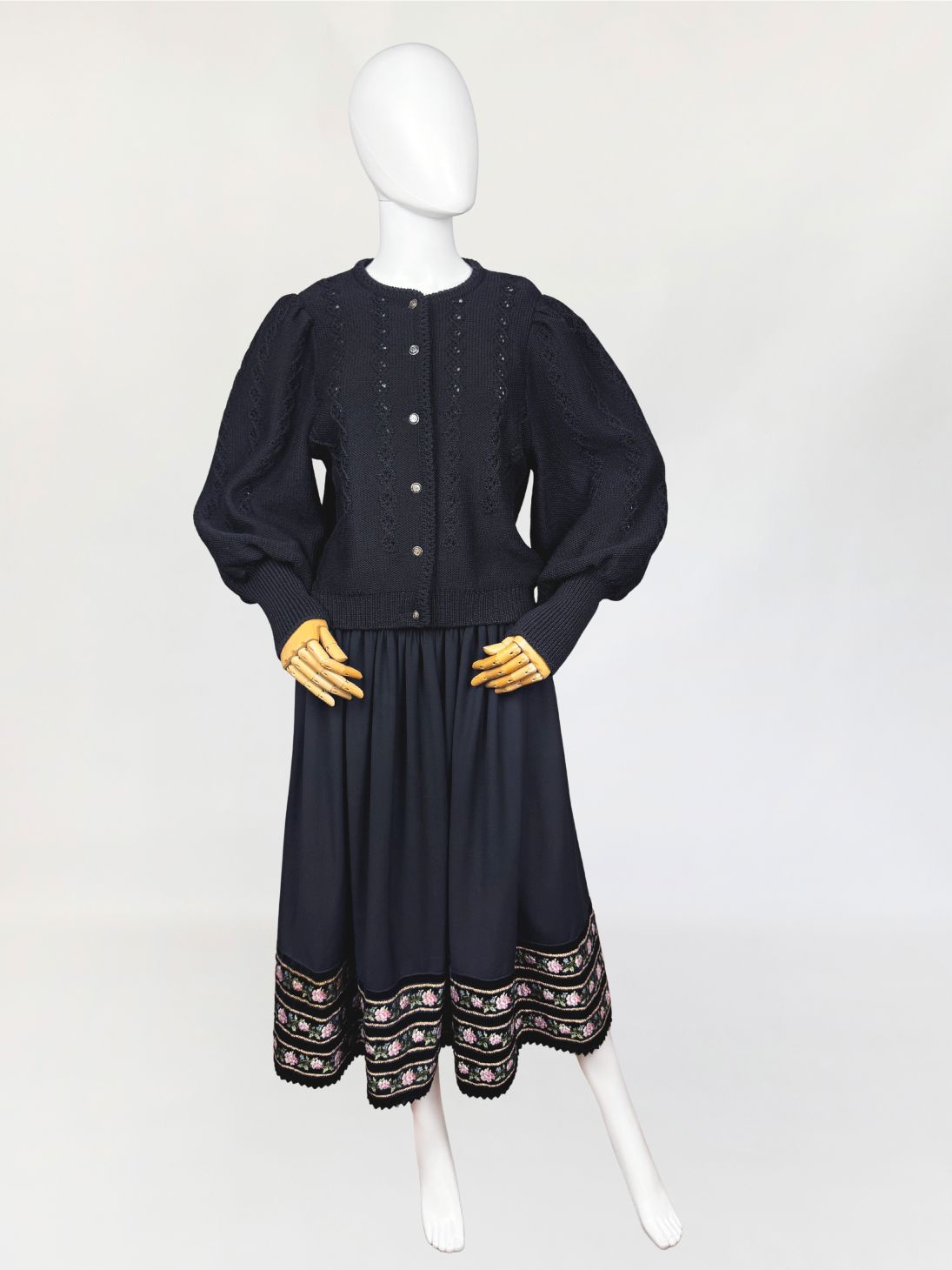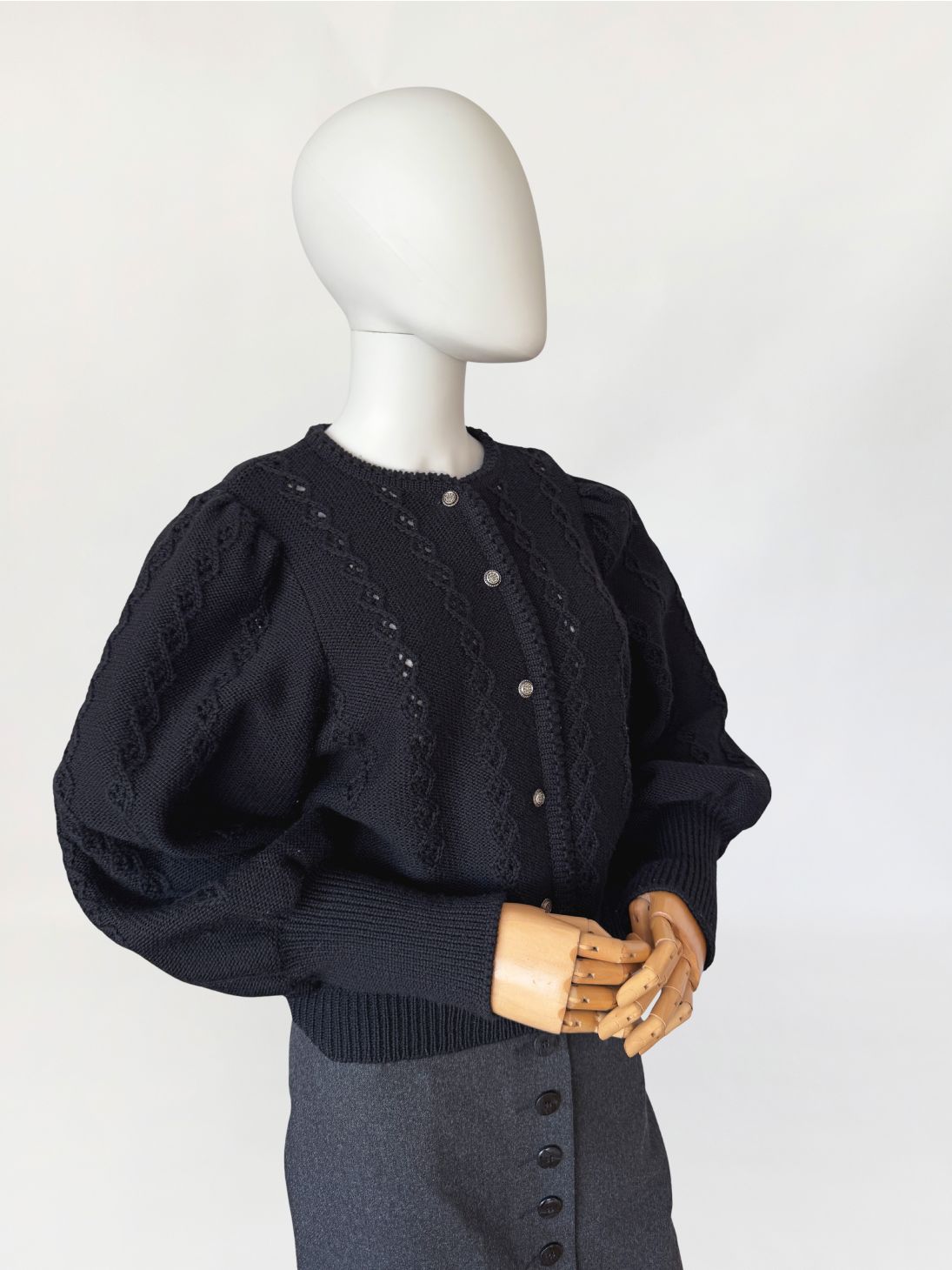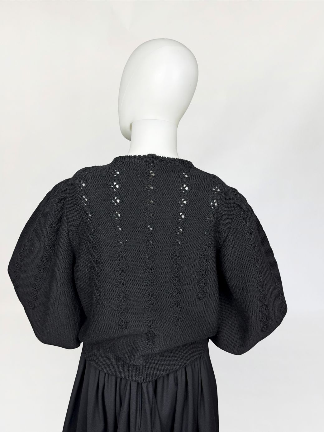 Austriacki sweter vintage wykonany z wełnianej przędzy w głębokim, czarnym odcieniu, o wyraźnie dekoracyjnej, rzemieślniczej strukturze. Model o krótkiej linii, zakończony ściągaczem w pasie. Korpus zdobiony pionowymi pasami warkoczowych splotów przeplatanych delikatnymi ażurowymi prześwitami, tworzącymi rytmiczny, regularny wzór. Dekolt okrągły, wykończony gładkim ściągaczem. Front zapinany na niewielkie, metalowe guziki. Rękawy długie, bufiaste w górnej partii, z wyraźnym marszczeniem przy główce i zwężane ku dołowi, zakończone wysokimi, dopasowanymi mankietami. Tył gładki z kontynuacją pionowego rytmu splotów. Wełna dziewicza, o zwartej, sprężystej strukturze.