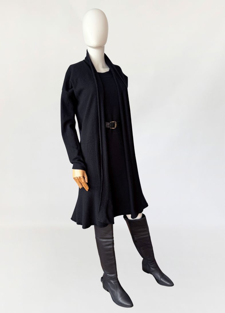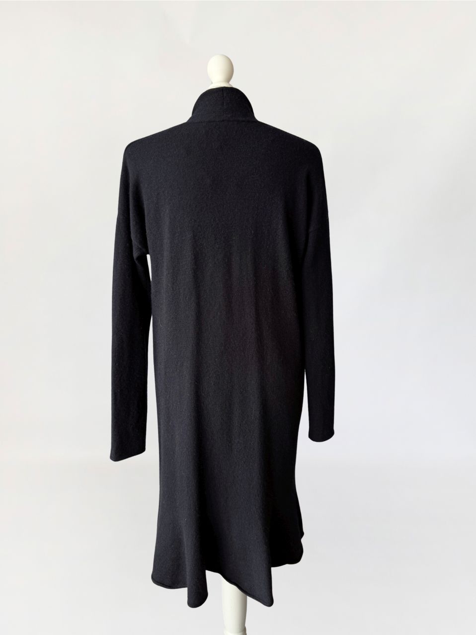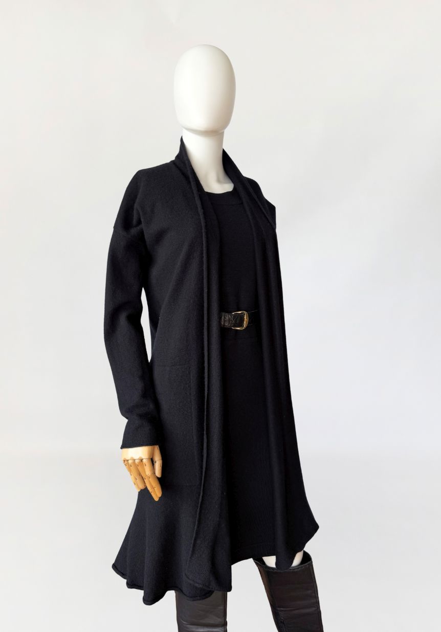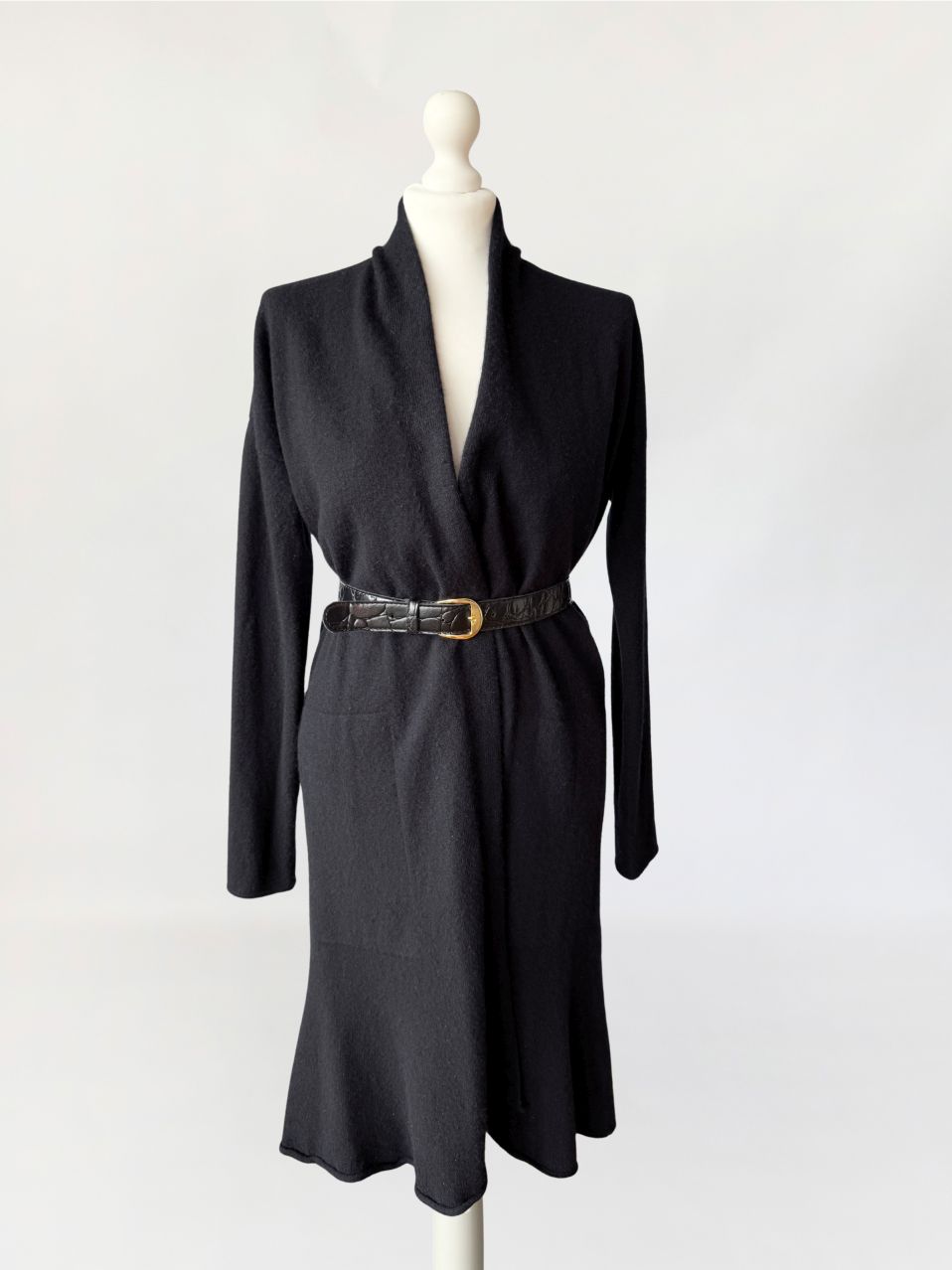 Luksusowy długi kardigan marki Banana Republic wykonany w 100% z kaszmiru, przędzy pochodzącej z legendarnej szkockiej monofaktury Todd&Duncan, jednej z najstarszych i najbardziej cenionych przędzalni świata, specjalizującej się w kaszmirze od 1867 roku. Model o prostym, minimalistycznym kroju typu open front, z miękko opadającymi połami. Dzianina jest wyjątkowo miękka i puszysta w dotyku, charakterystyczna dla kaszmiru z najwyższej półki.