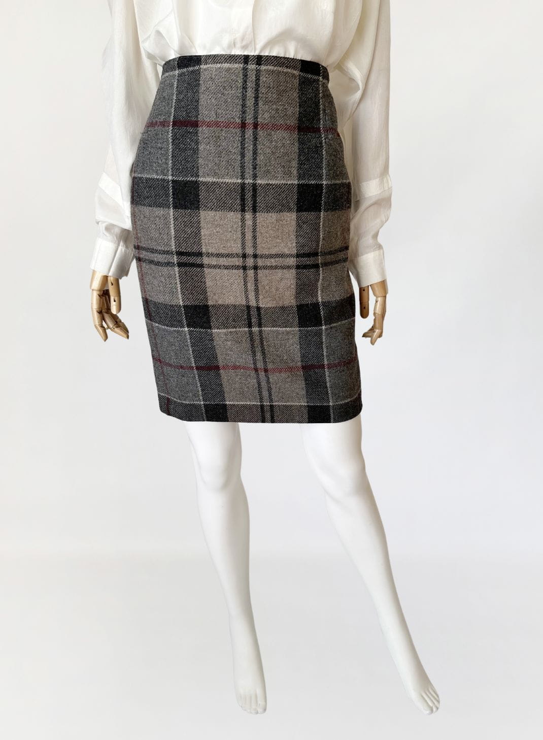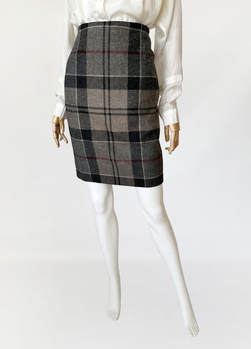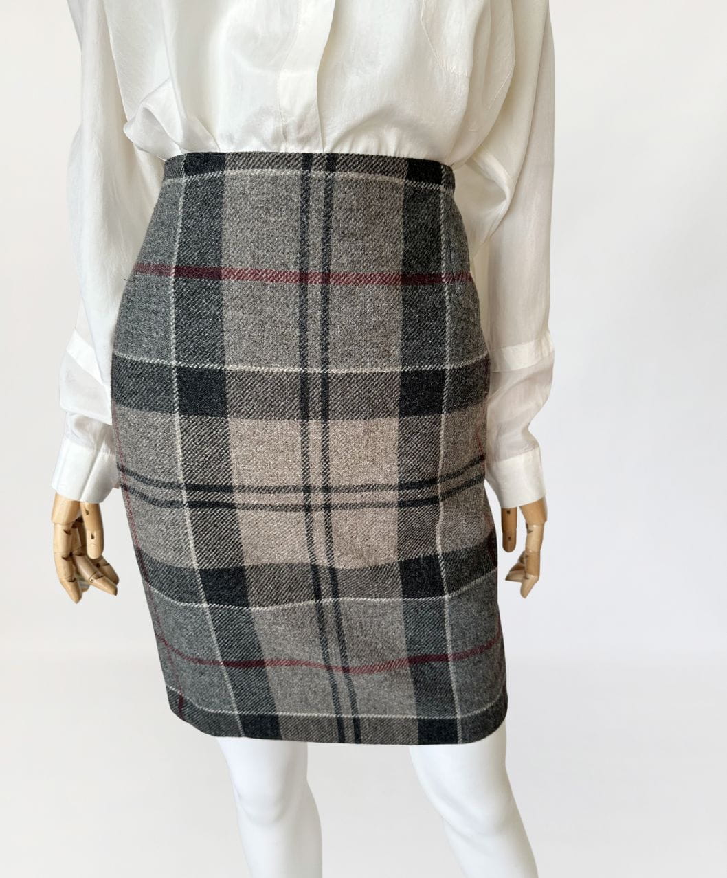 Ołówkowa spódnica kultowej brytyjskiej marki Barbour. Wykonana z wełnianej tkaniny o deseniu w kratę w odcieniach szarości i bordo.