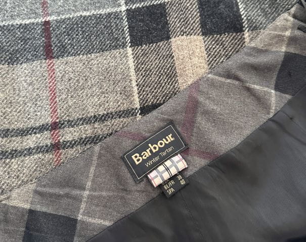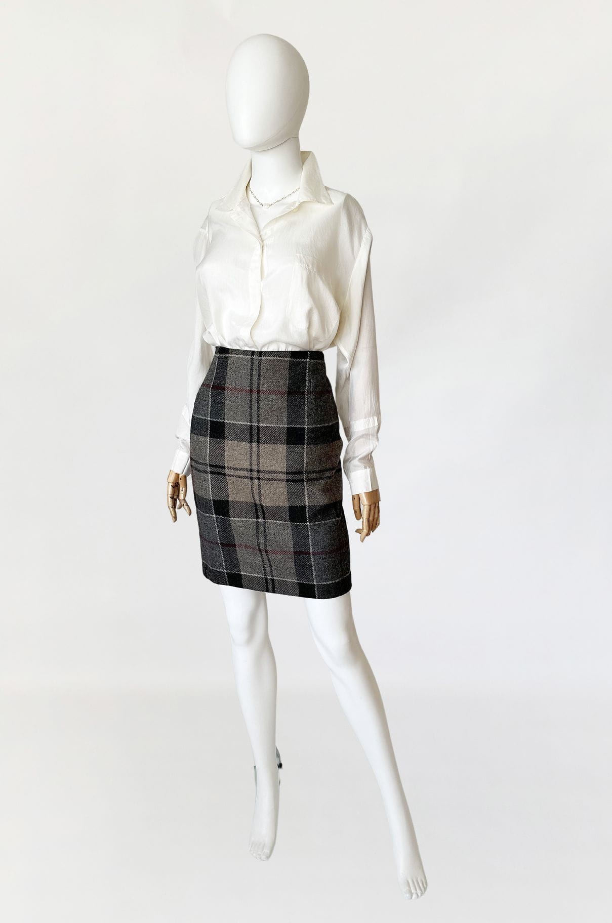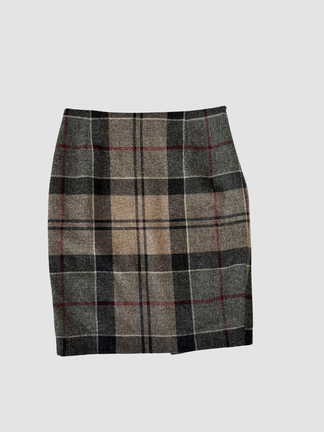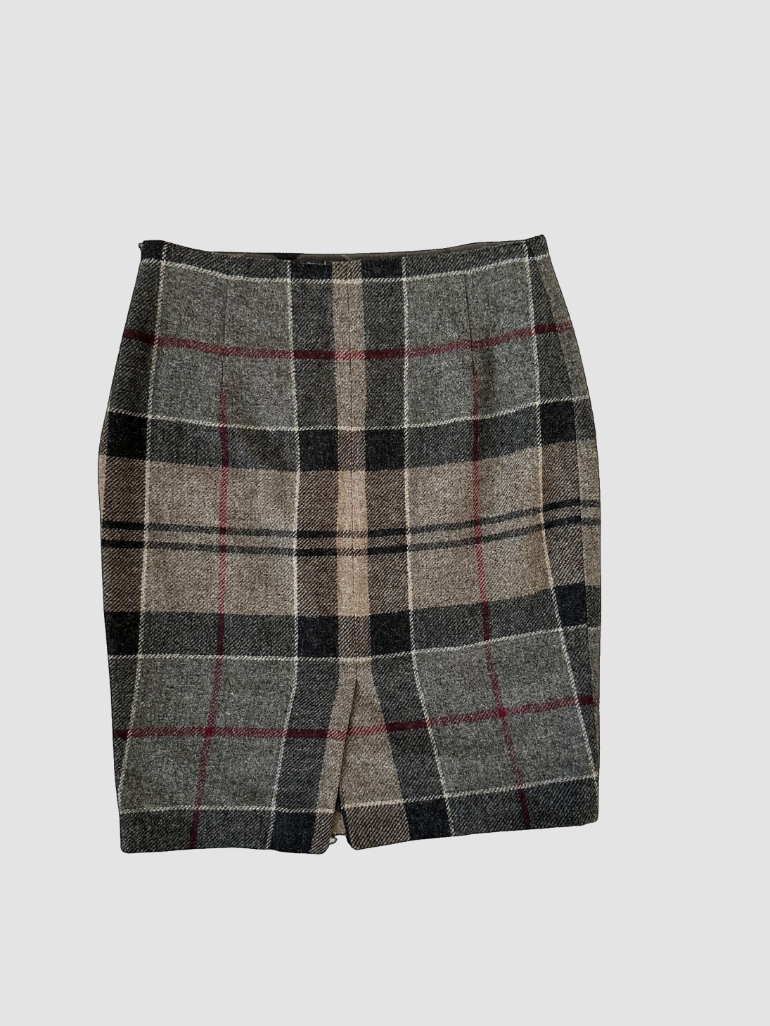Ołówkowa spódnica kultowej brytyjskiej marki Barbour. Wykonana z wełnianej tkaniny o deseniu w kratę w odcieniach szarości i bordo.