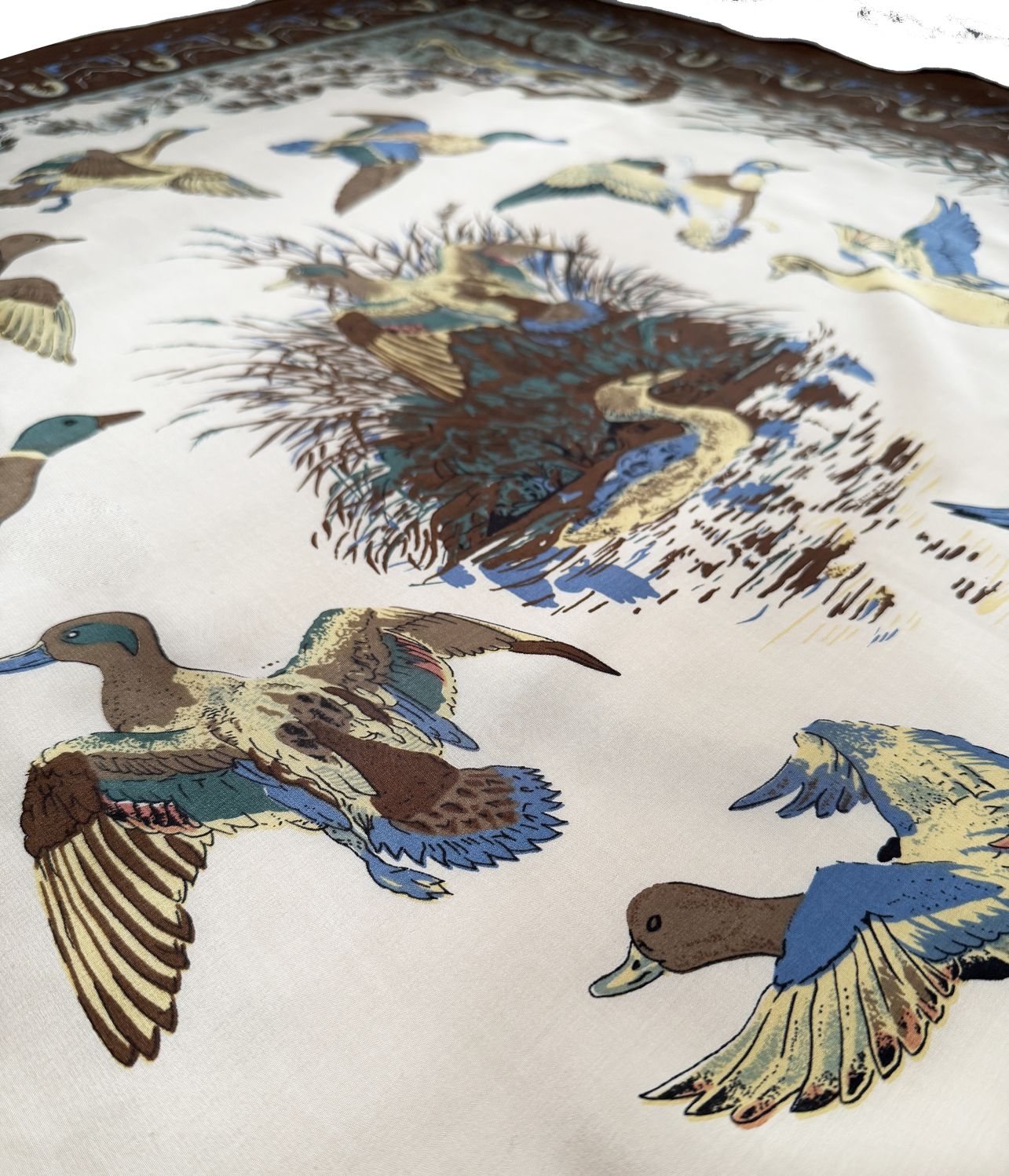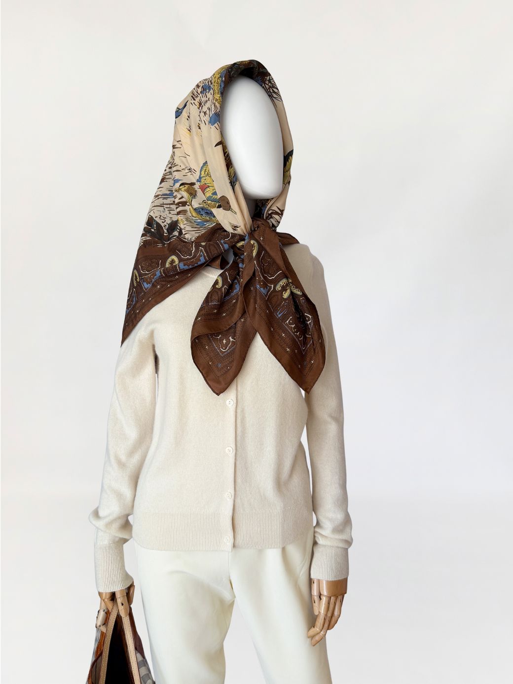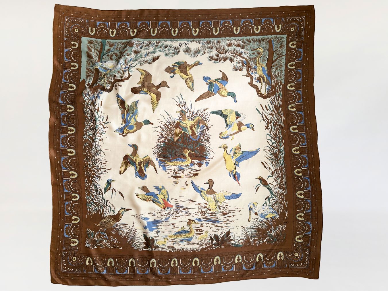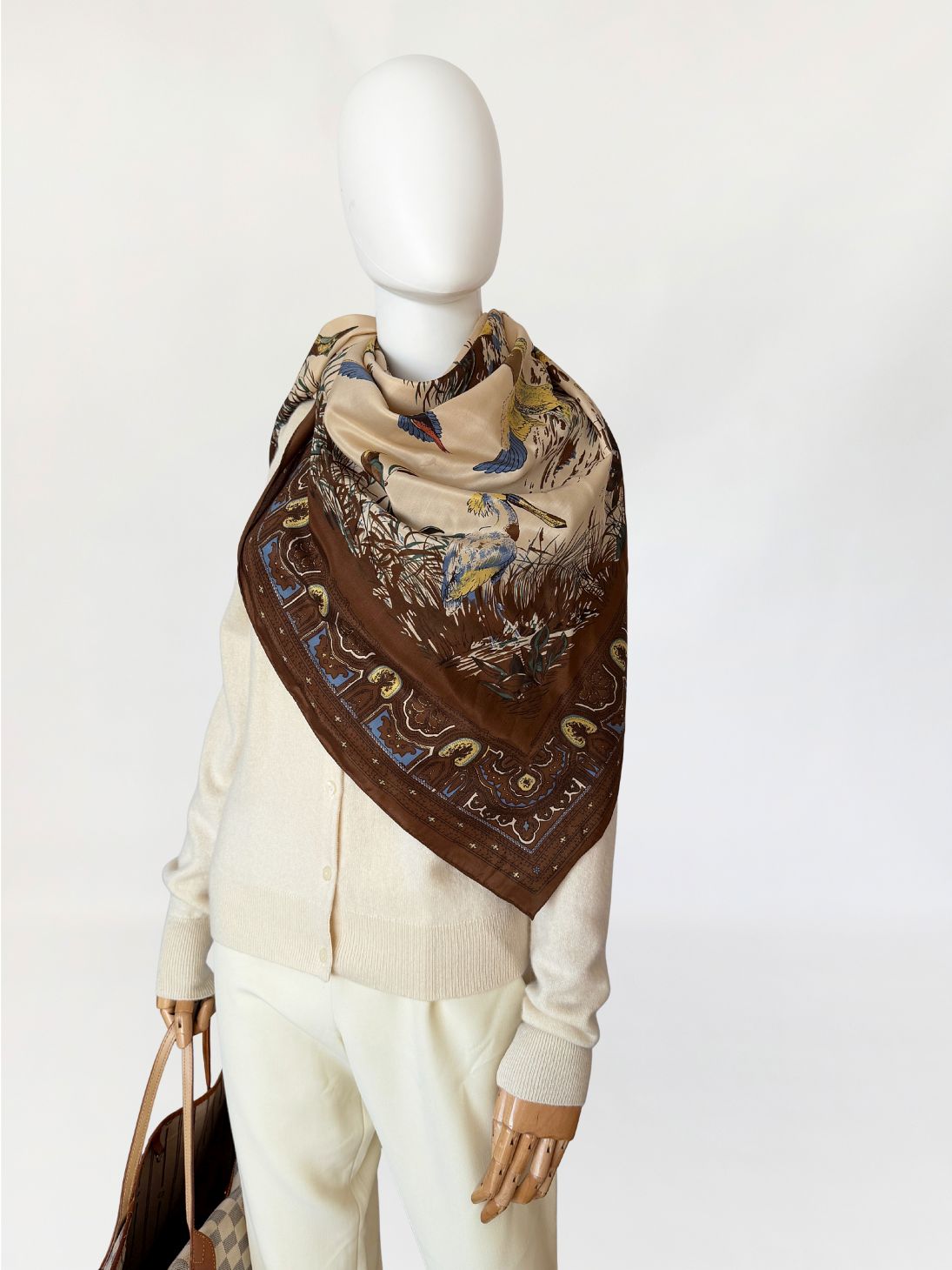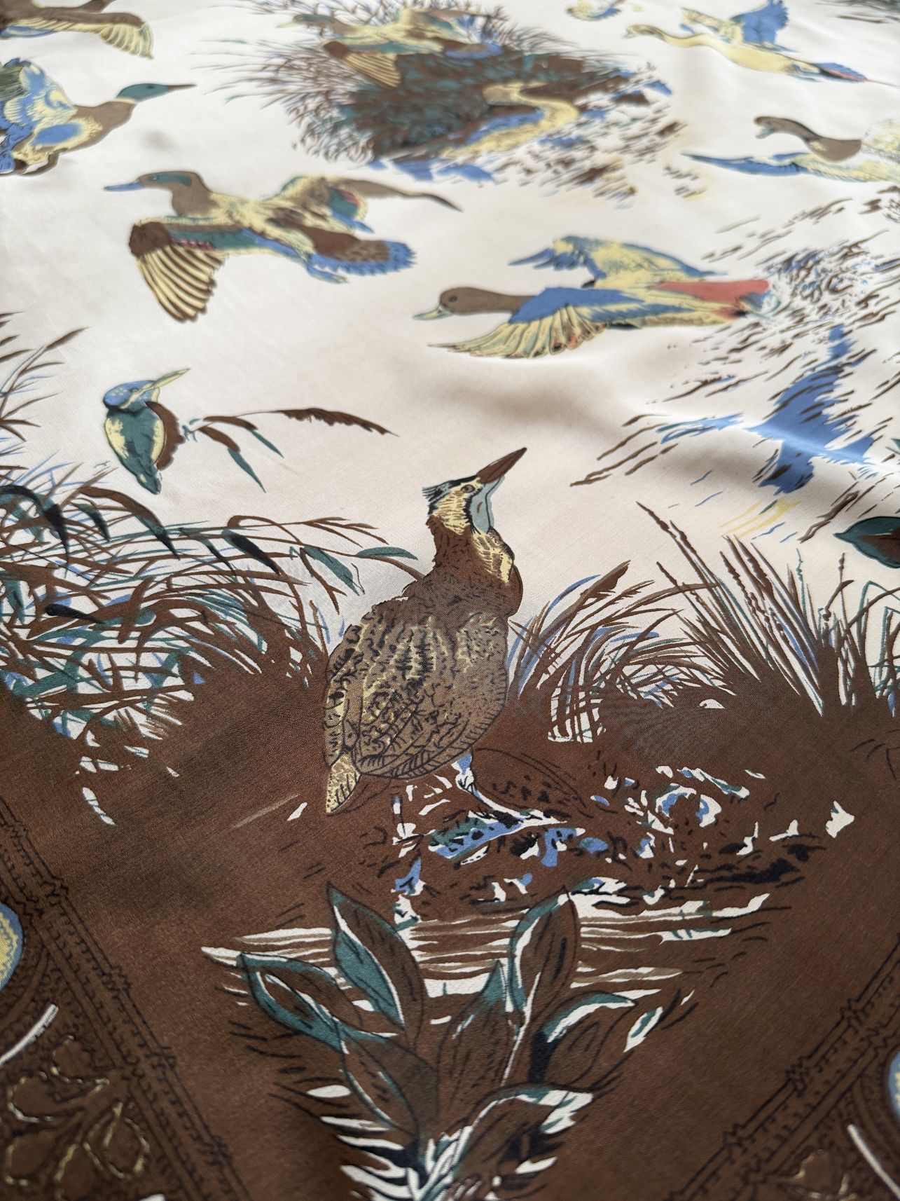 Apaszka vintage w formacie XXL, wykonana z naturalnego jedwabiu. Bardzo duży, efektowny model o rozbudowanej kompozycji ilustracyjnej. Podobną stylistykę znajdziemy w modelach od Hermes. Centralną część zajmuje scena przedstawiająca dzikie ptactwo wodne w ruchu – kaczki i ptaki brodzące ukazane w locie oraz na tafli wody, w otoczeniu roślinności bagiennej. Kompozycja utrzymana w naturalistycznym, malarskim stylu, z bogatą paletą barw: odcienie beżu, brązu i ochry zestawione z akcentami błękitu, zieleni i żółci. Tło w ciepłym, jasnym odcieniu kremowym. Całość zamknięta szeroką, dekoracyjną bordiurą w tonacji brązu z detalami w kolorze błękitu i złota, o charakterze ornamentalnym inspirowanym motywami klasycznymi. Narożniki uzupełnione roślinnymi akcentami, które płynnie łączą się z główną sceną.
