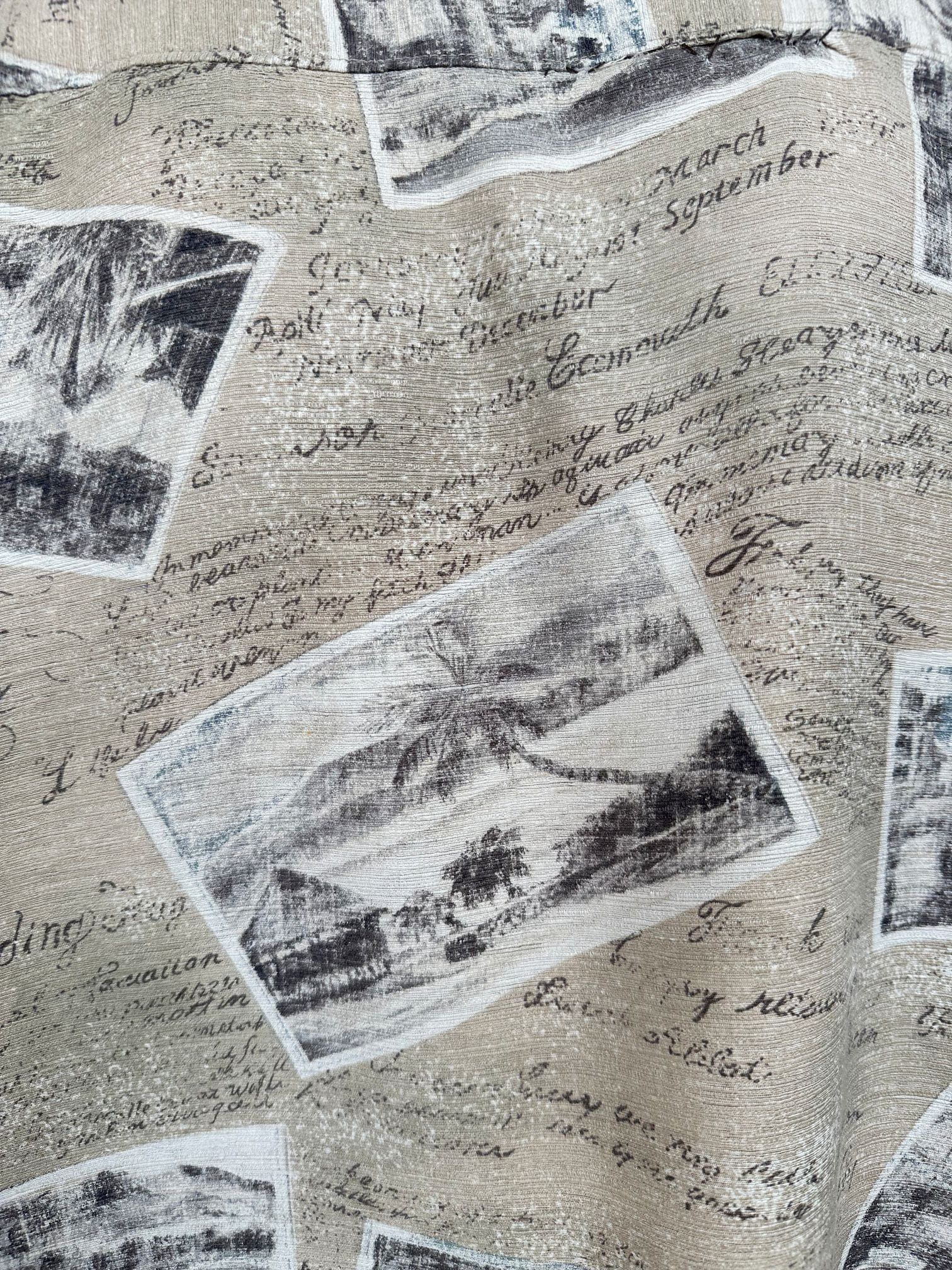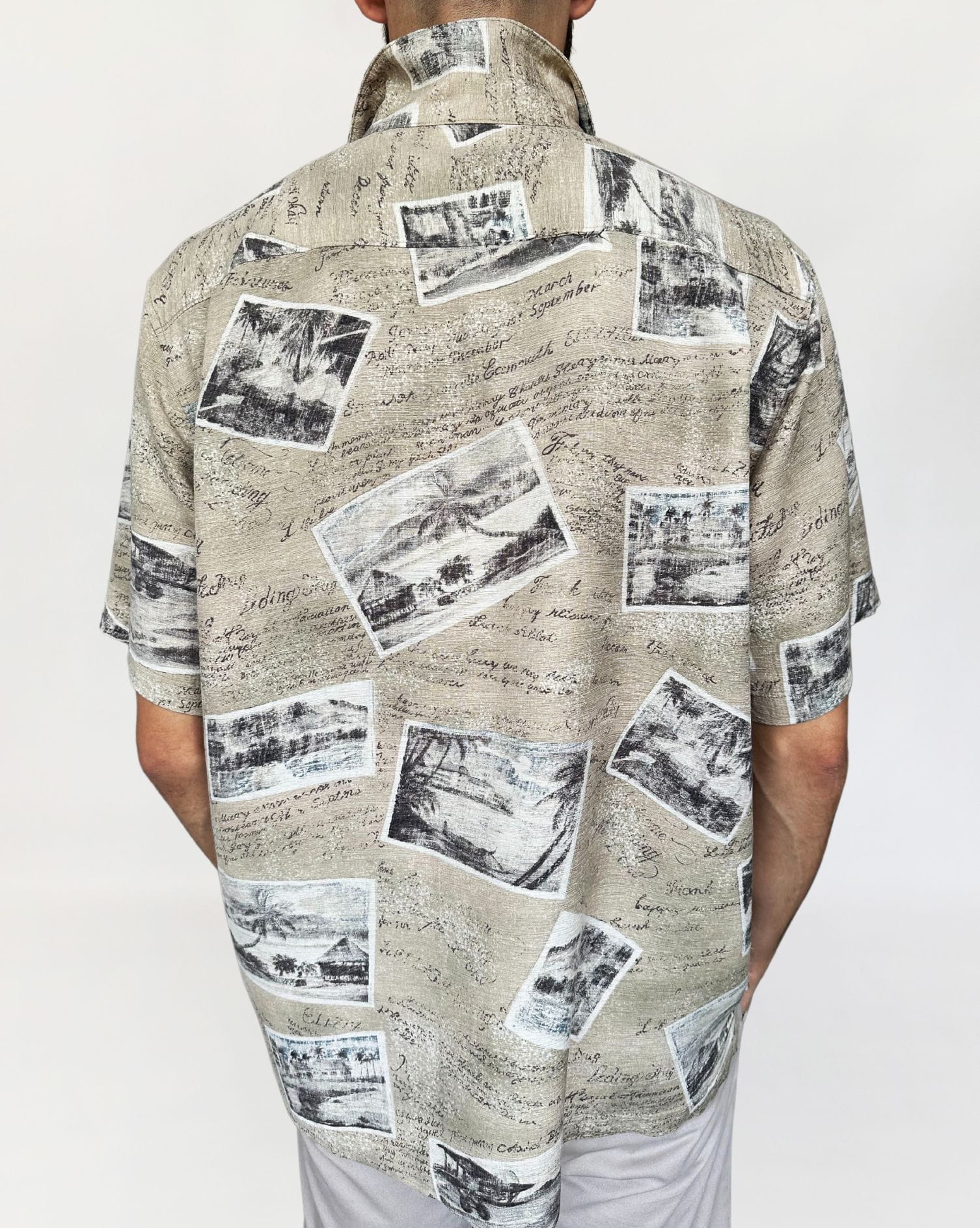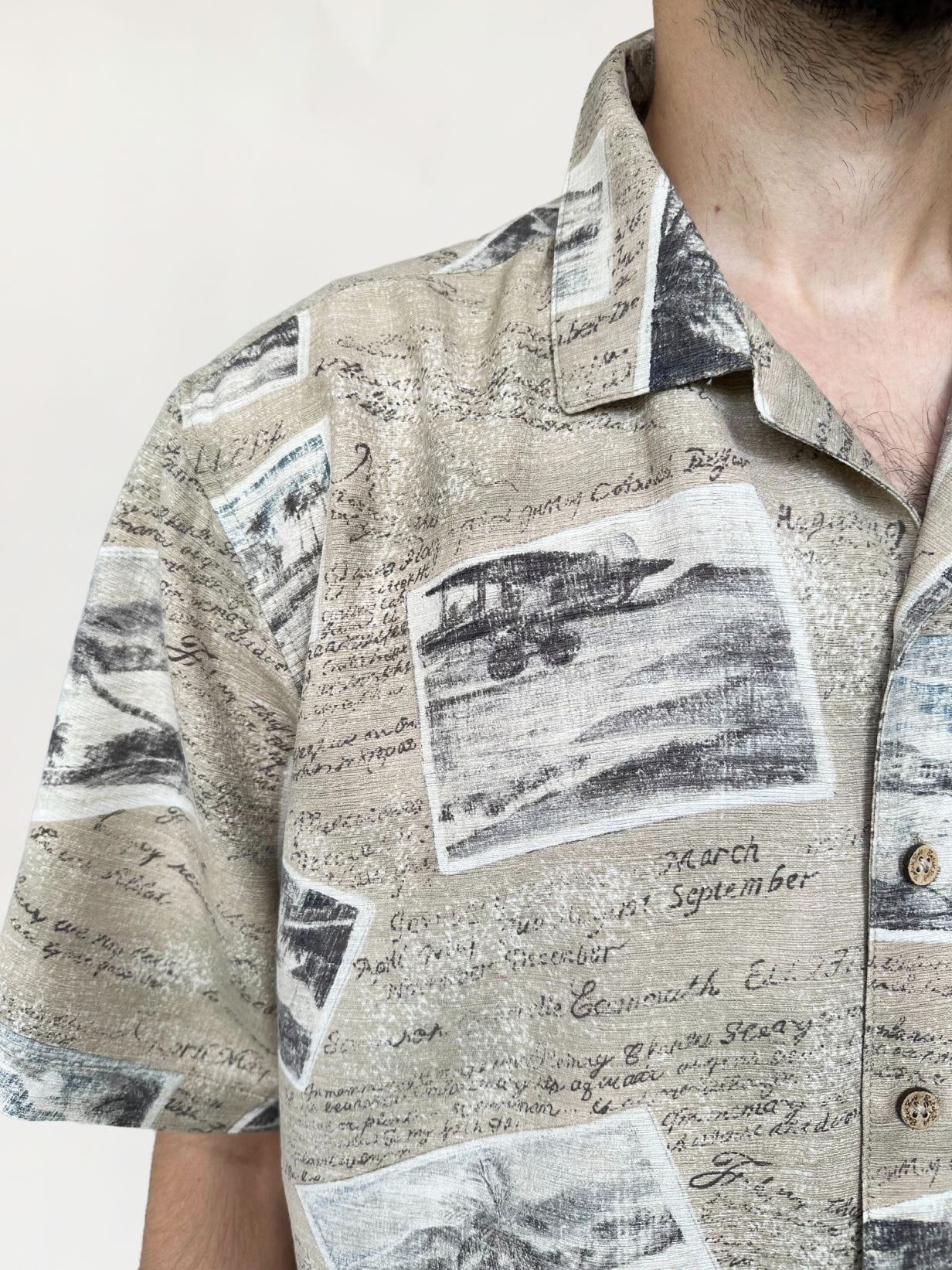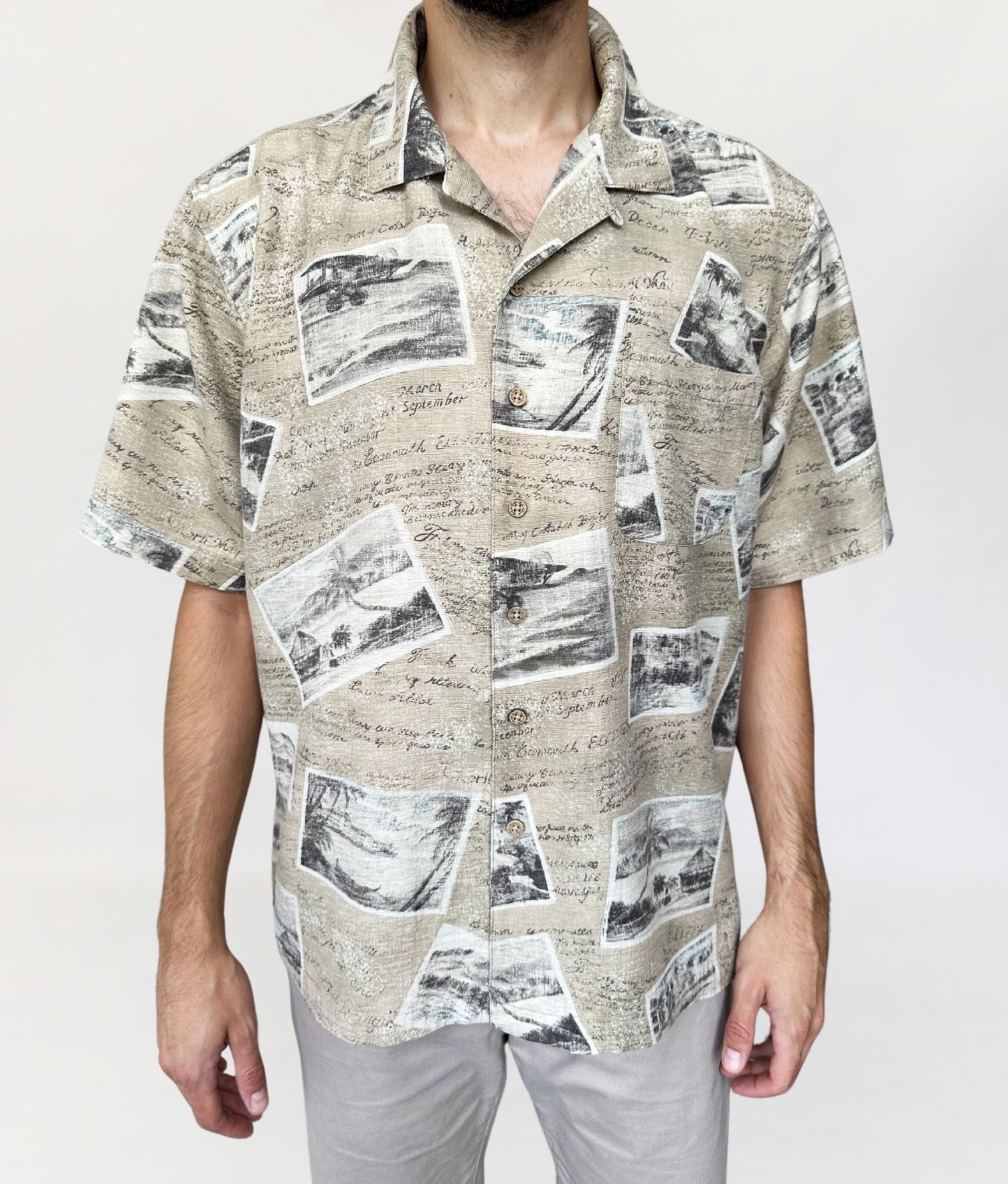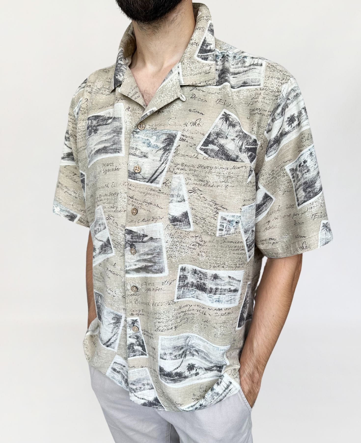 Koszula vintage jak z serialu "Gliniarz i Prokurator", projekt marki Batik Bay. Wykonana z lekko teksturowanej mocnej jedwabnej tkaniny. Deseń w retro wzory, wakacyjne pocztówki. Zapinana na logowane guziki z kokosa.