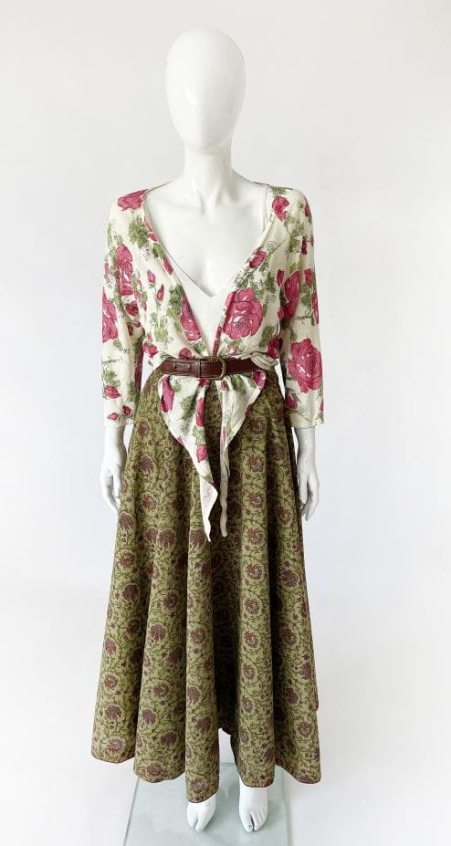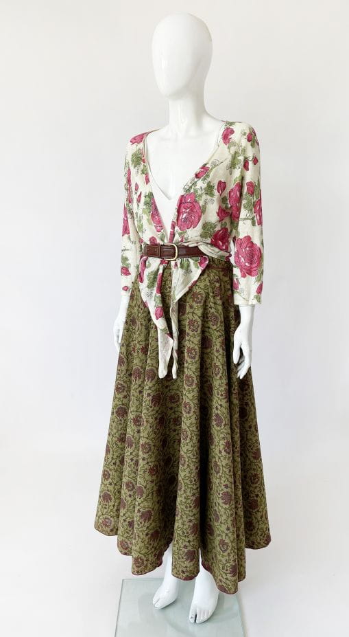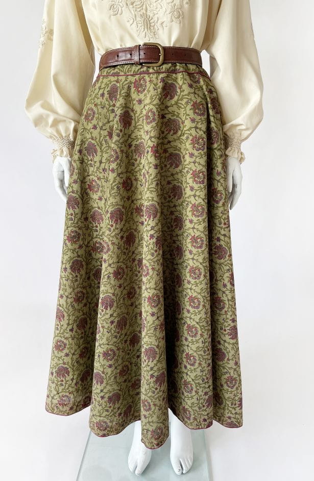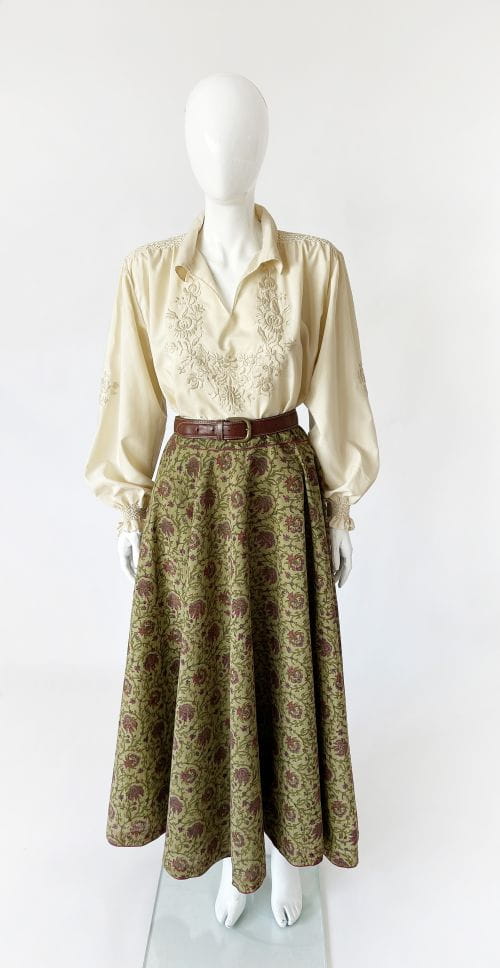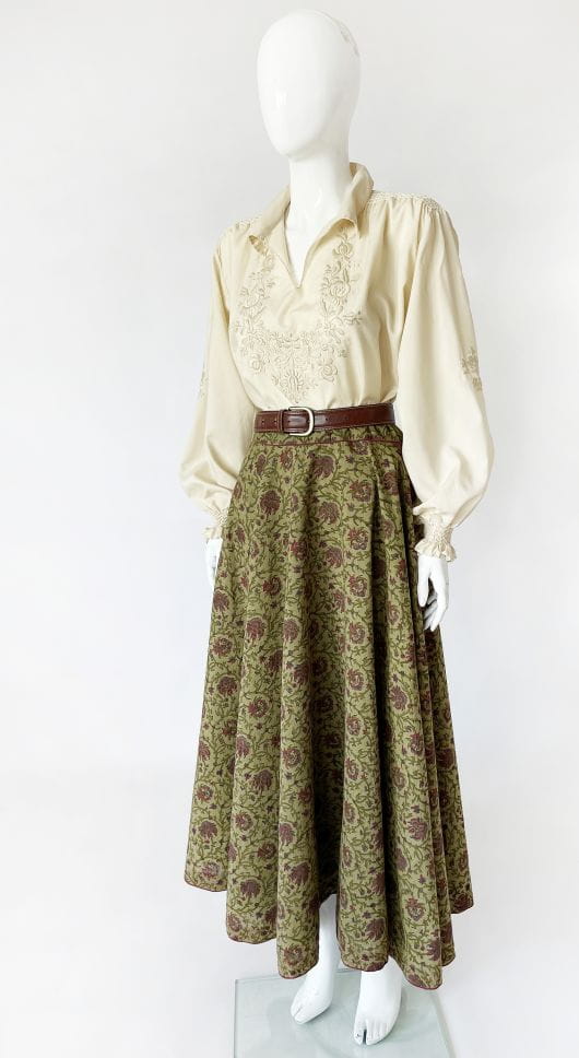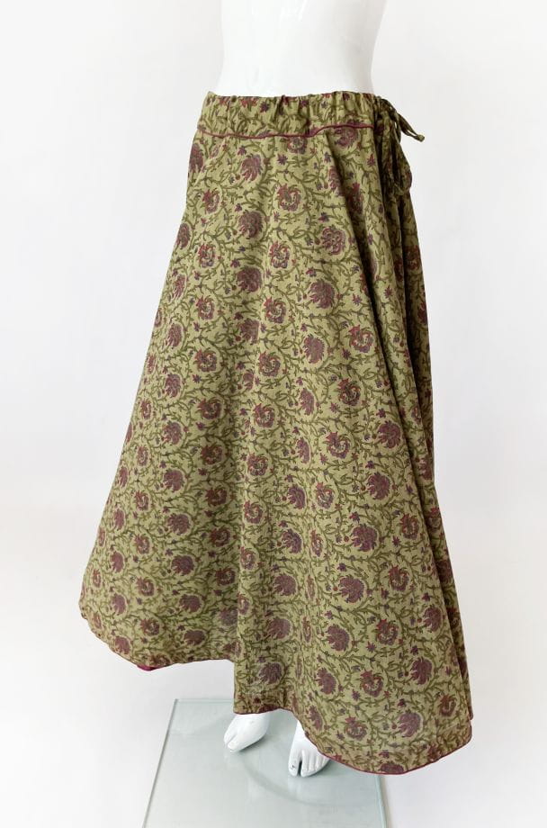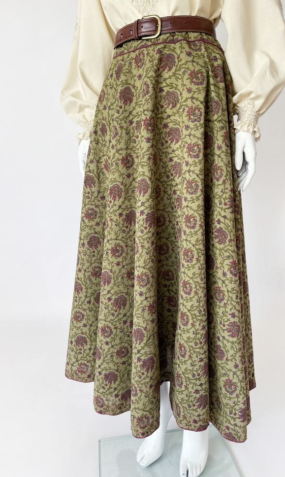 Przepiękna spódnica księżniczki elfów :) Wykonana z bawełnianej tkaniny we wzory. Mocno rozkloszowany, rozłożysty fason. Zasuwana na zamek, pas dodatkowo ściągany sznureczkiem - można dzięki temu łatwo dostosować go do obwodu. Indyjski model vintage. Nie ma podszewki.