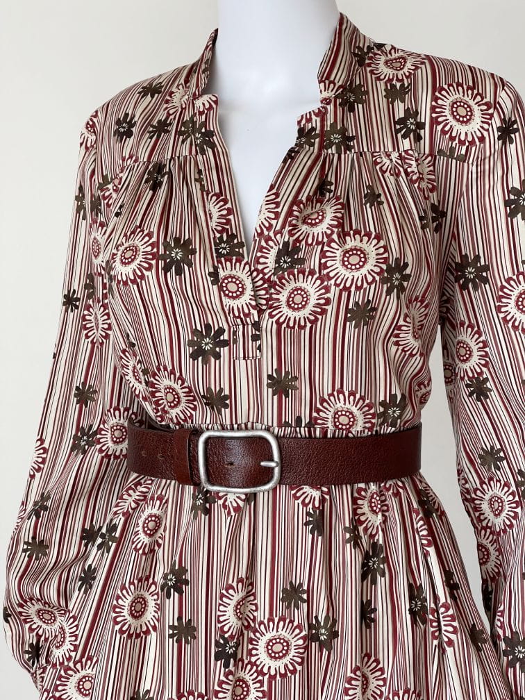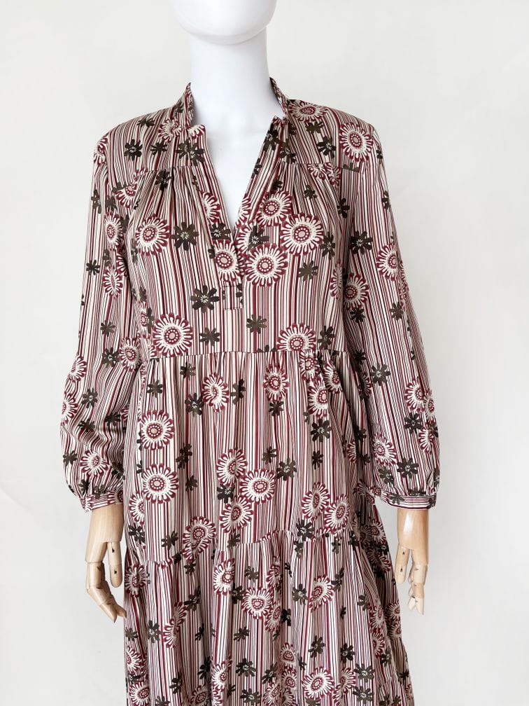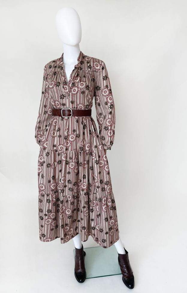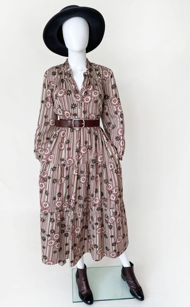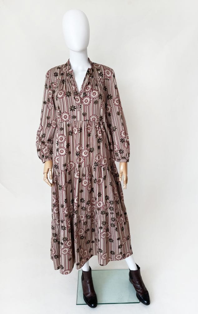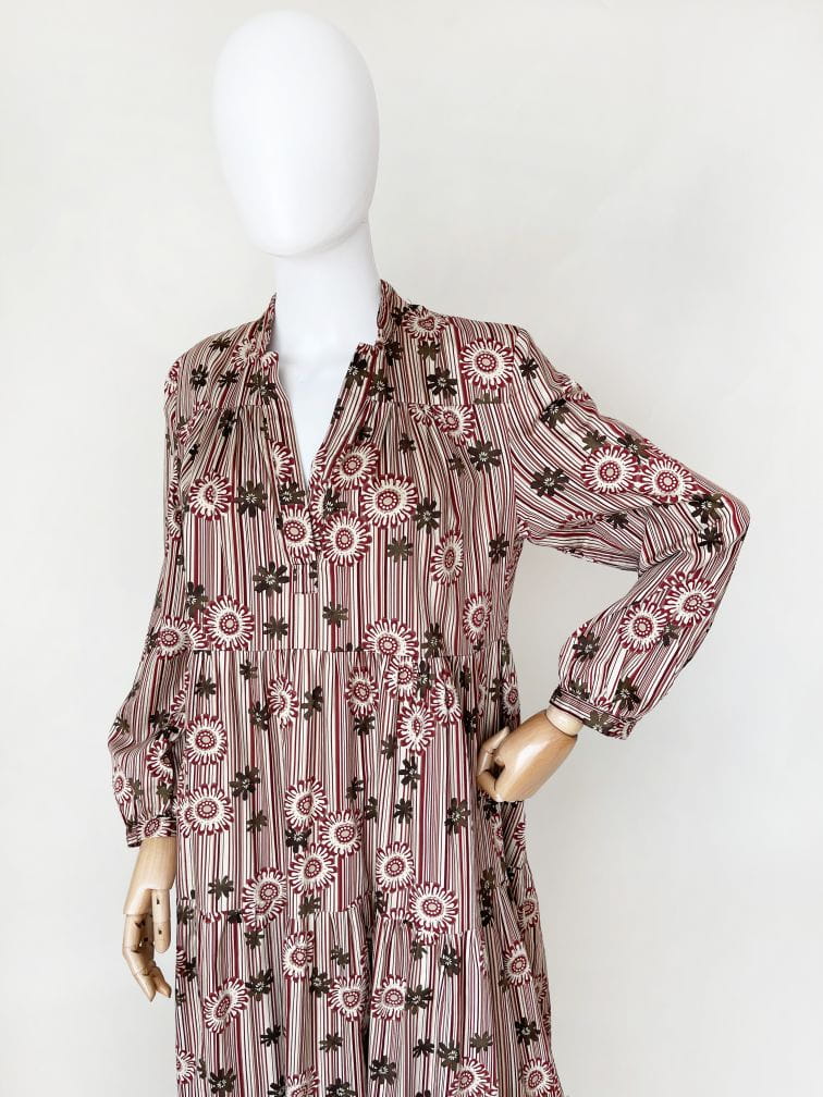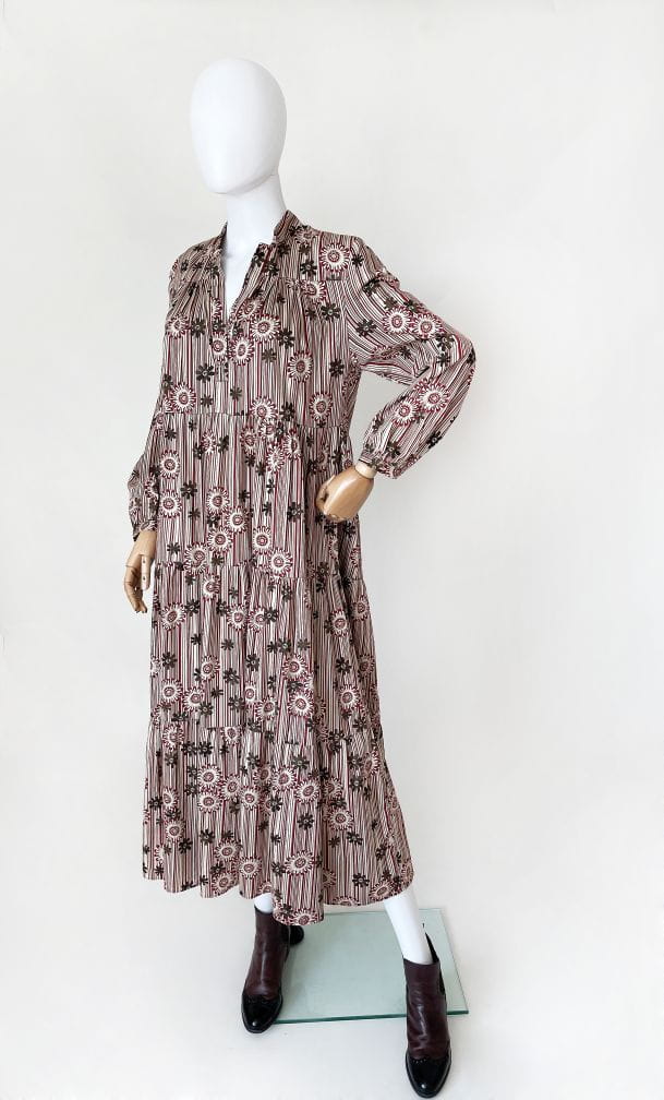 Bawełniana sukienka maxi o wzorzystym deseniu w kolorach jesieni. Rozłożysty fason, który poszerza się od pach do samego dołu. Długie rękawy.