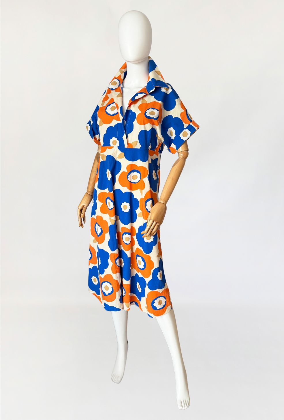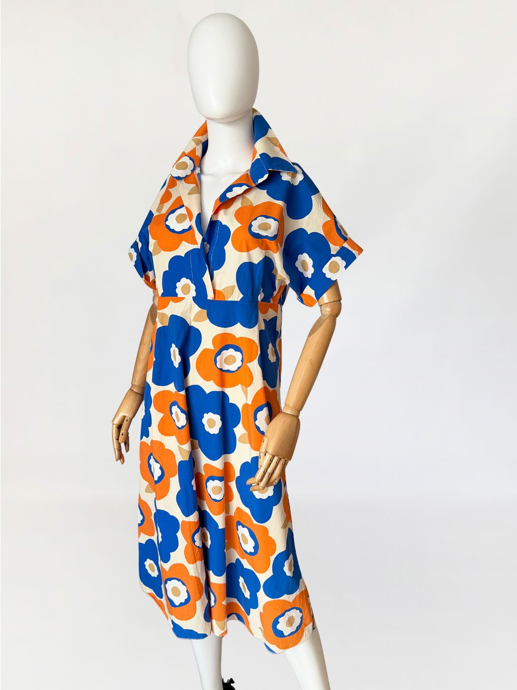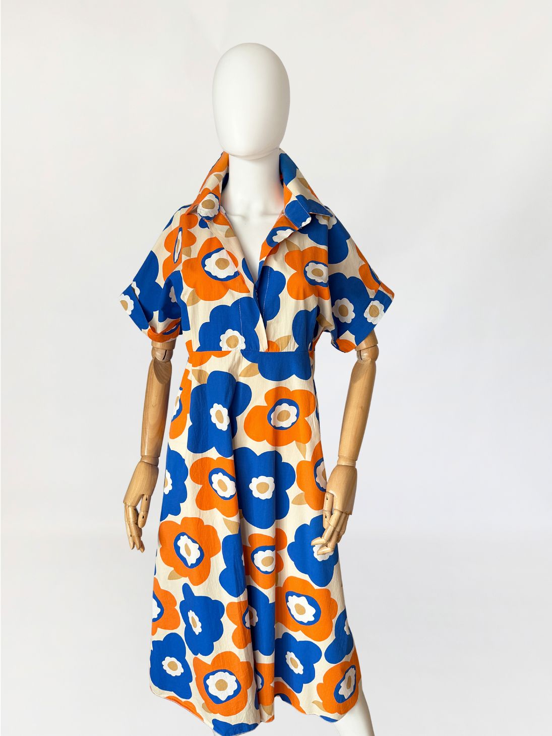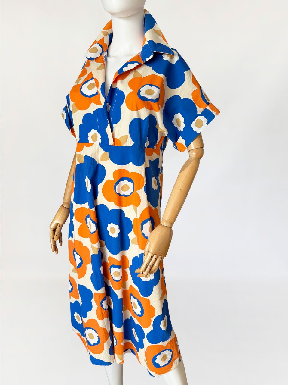 Sukienka wykonana z bawełnianej popeliny pokryta wielkoformatowym nadrukiem kwiatowym w stylu Marimekko (brak metek) w żywej, kontrastowej kolorystyce kobaltu i pomarańczu, z dodatkiem beżu. Góra o konstrukcji kopertowej z głębokim dekoltem w kształcie litery V. Wyraźnie zaznaczony, szeroki kołnierz o wydłużonych wyłogach. Rękawy krótkie, o luźnej formie, wszyte nisko, bez mankietów. Talia odcięta pod linią biustu, z poziomym pasem konstrukcyjnym. Dół rozkloszowany, o swobodnej objętości.