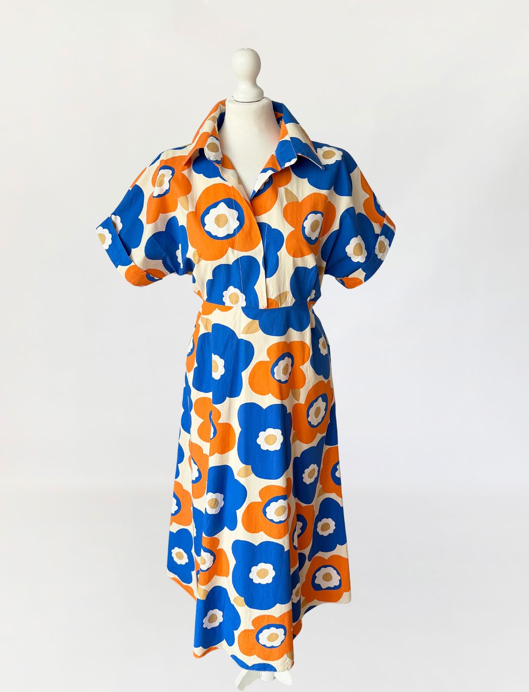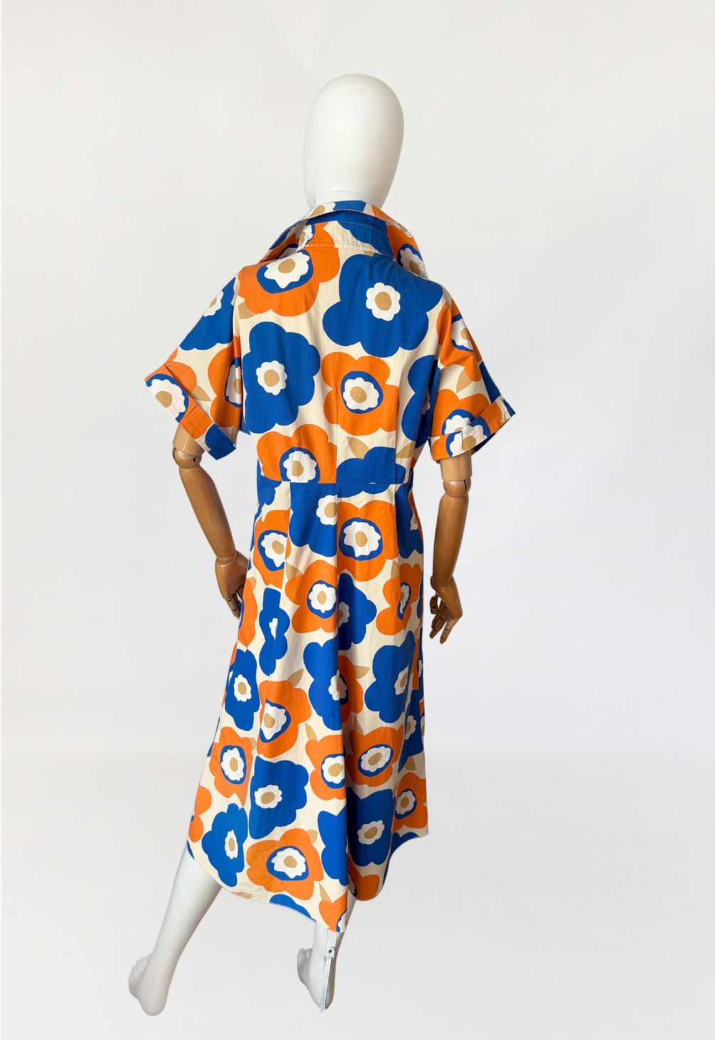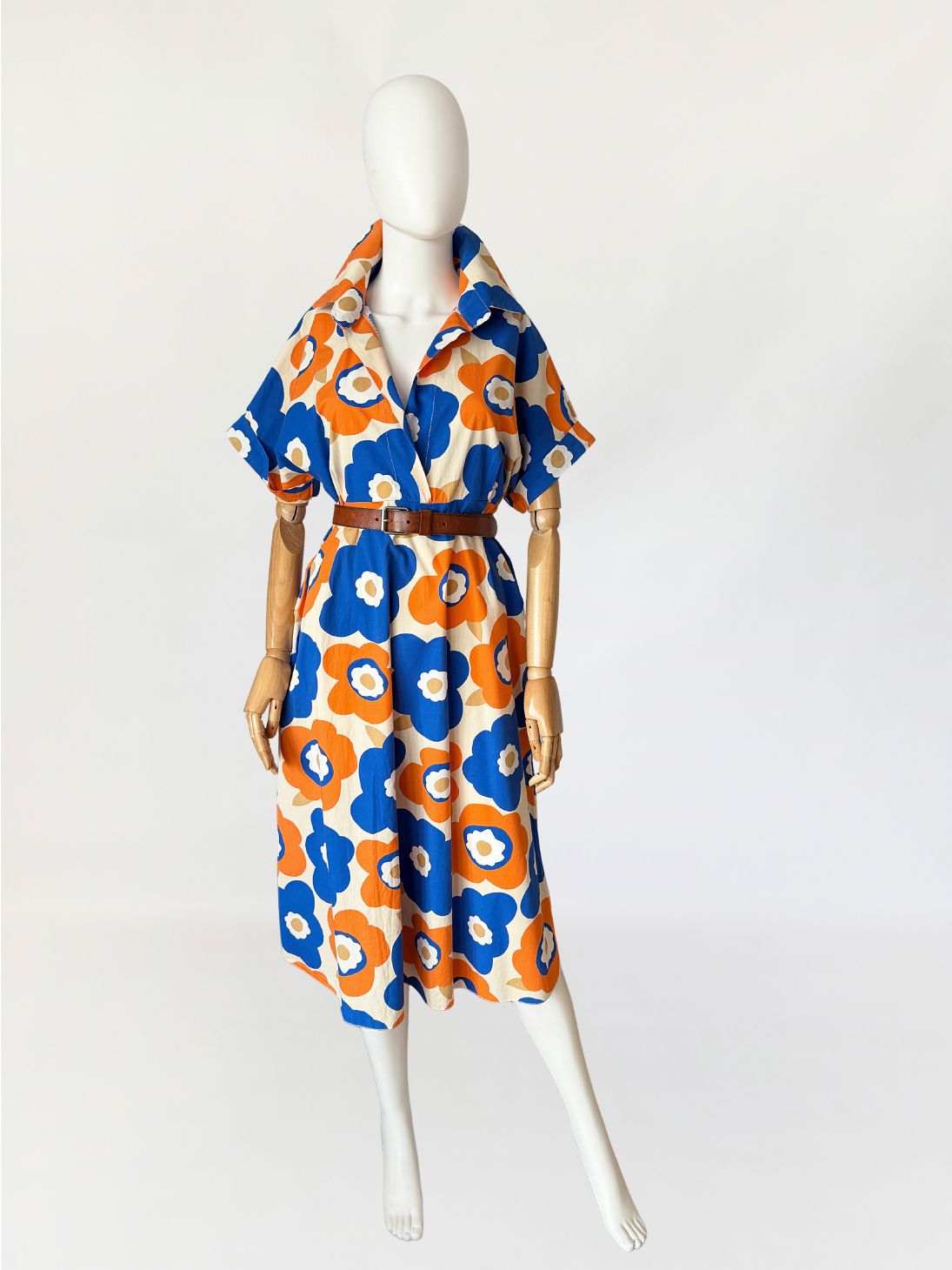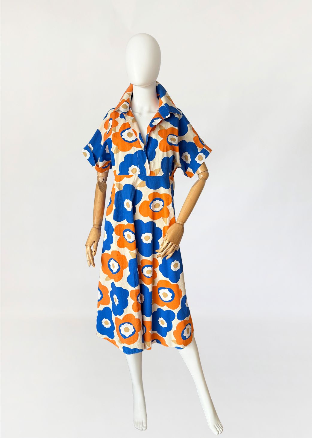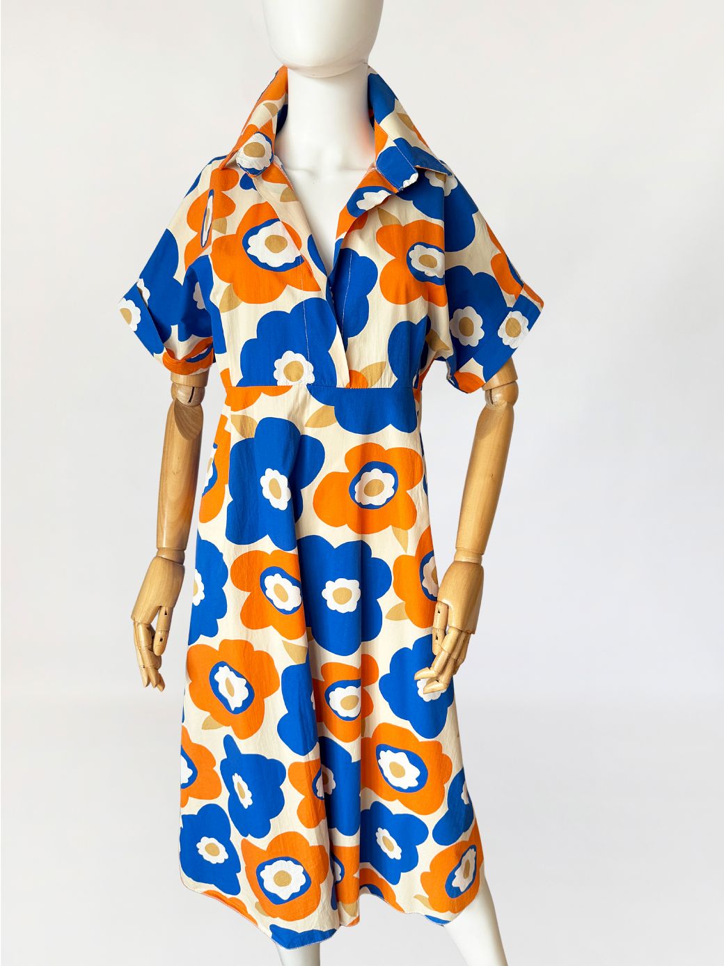 Sukienka wykonana z bawełnianej popeliny pokryta wielkoformatowym nadrukiem kwiatowym w stylu Marimekko (brak metek) w żywej, kontrastowej kolorystyce kobaltu i pomarańczu, z dodatkiem beżu. Góra o konstrukcji kopertowej z głębokim dekoltem w kształcie litery V. Wyraźnie zaznaczony, szeroki kołnierz o wydłużonych wyłogach. Rękawy krótkie, o luźnej formie, wszyte nisko, bez mankietów. Talia odcięta pod linią biustu, z poziomym pasem konstrukcyjnym. Dół rozkloszowany, o swobodnej objętości.
