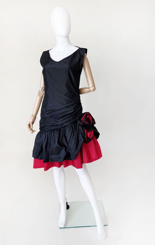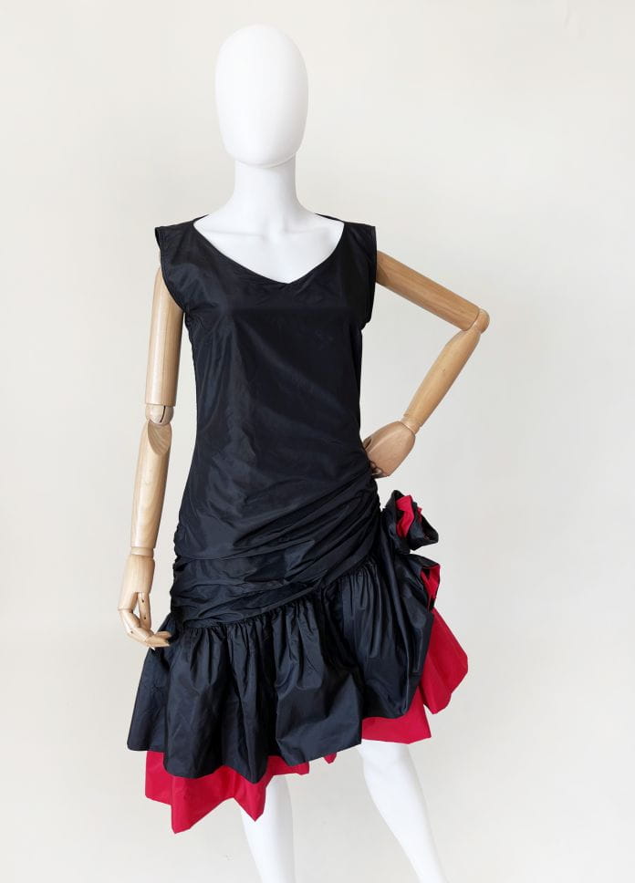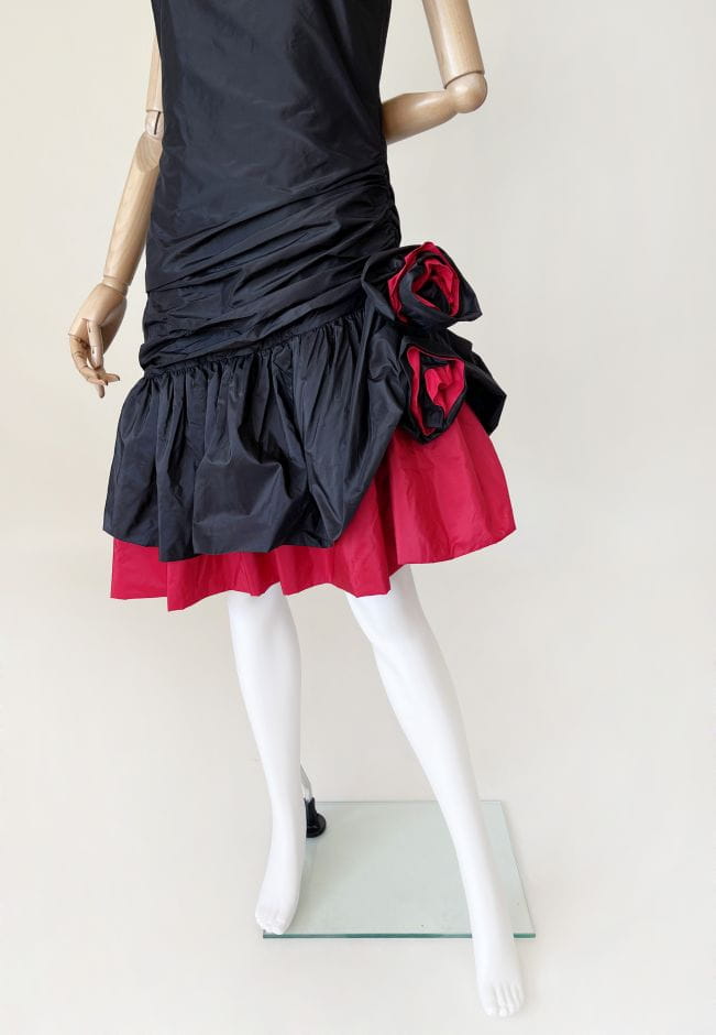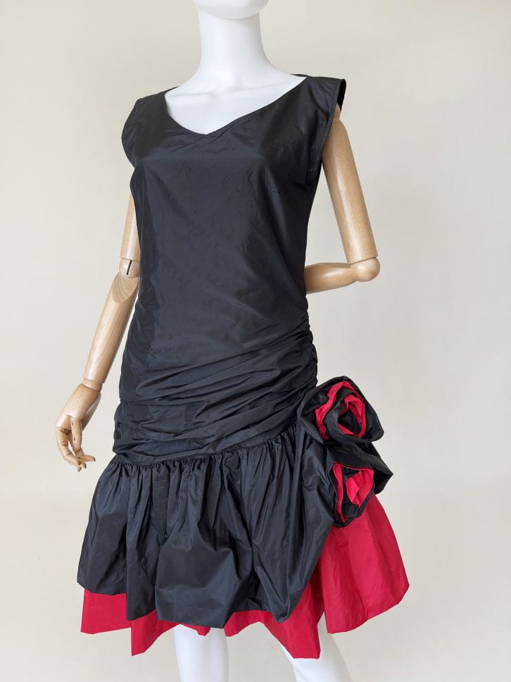 Wieczorowa sukienka vintage lata 80-te/90-te, z pracowni niemieckiej projektantki Beatrice Hympendahl. Wykonana z jedwabnej czarnej tafty. Dopasowana góra bez rękawów z dekoltem "V". Na wysokości pasa drapowana. Dół rozłożysty, falbaniasty z dodatkową warstwą czerwonej tkaniny pod spodem. Po bokach kwiatowe materiałowe aplikacje, które nadają jej klimatu flamenco.