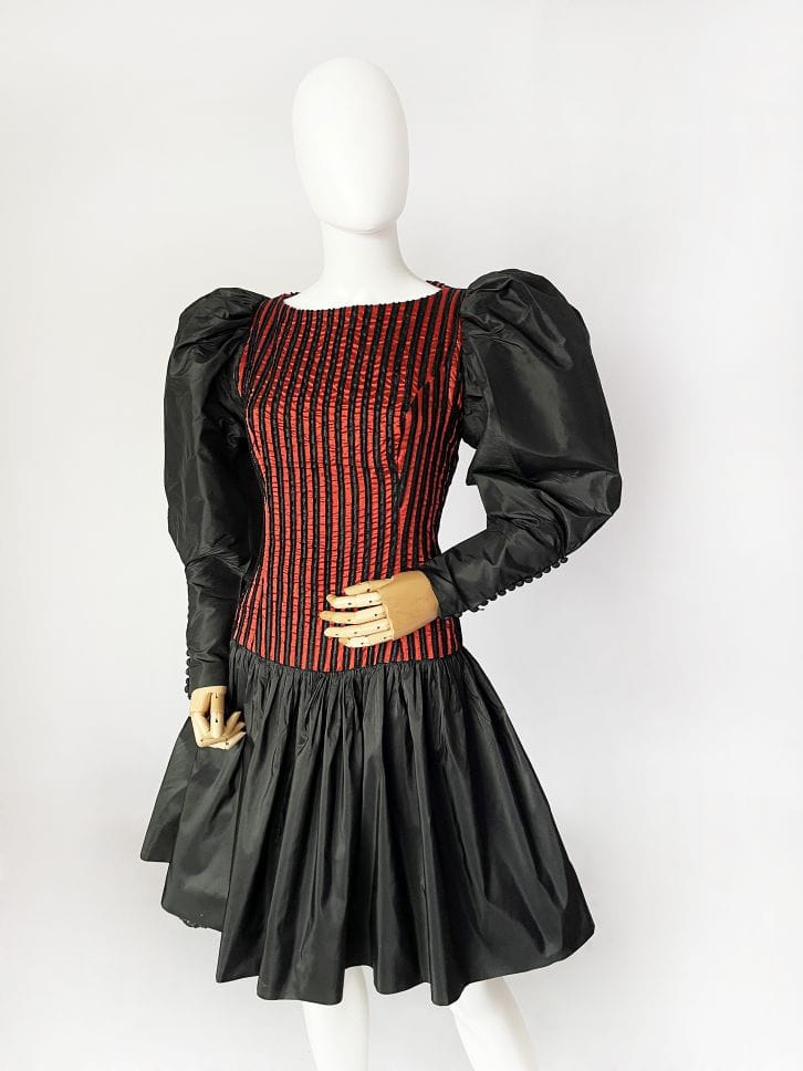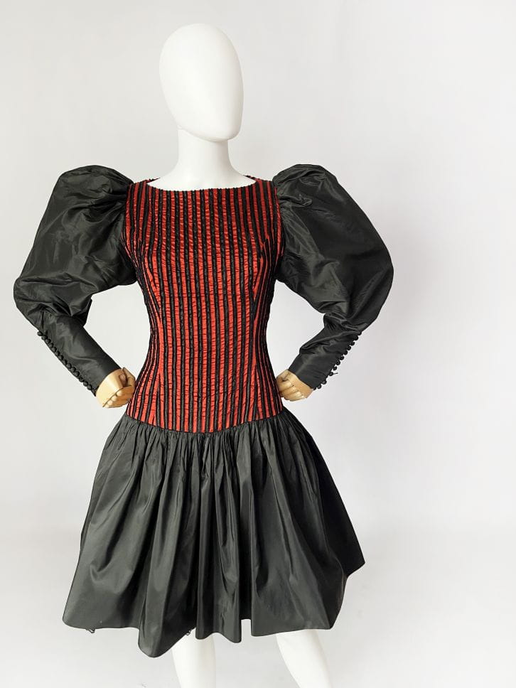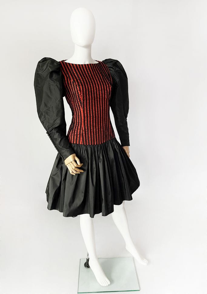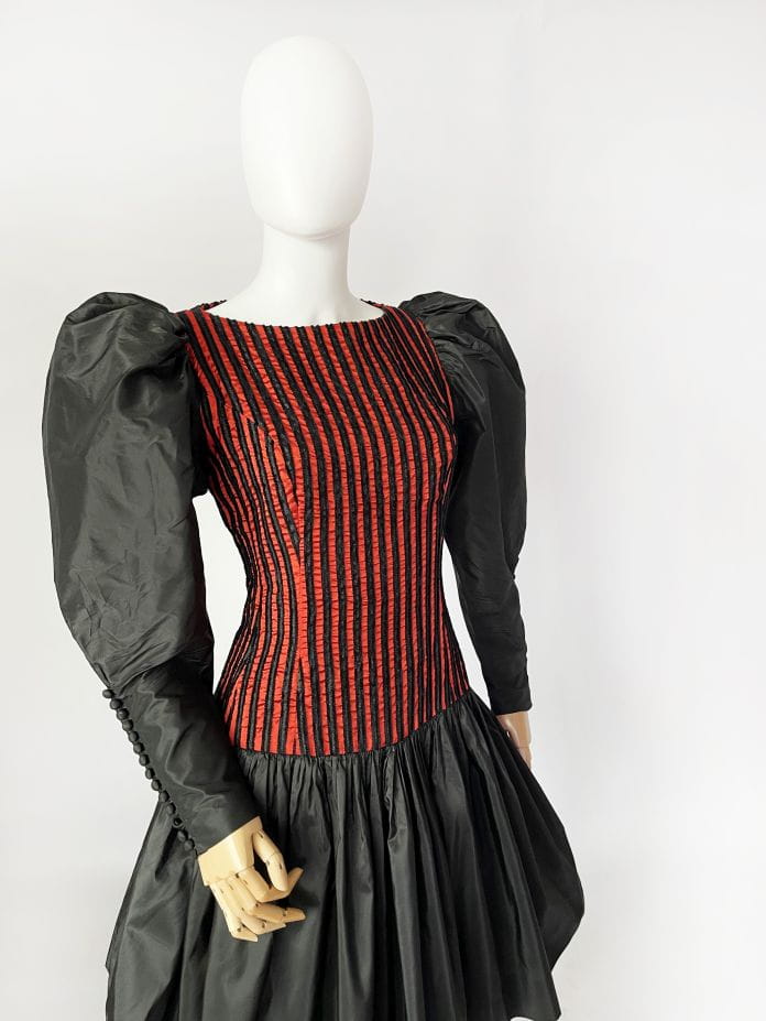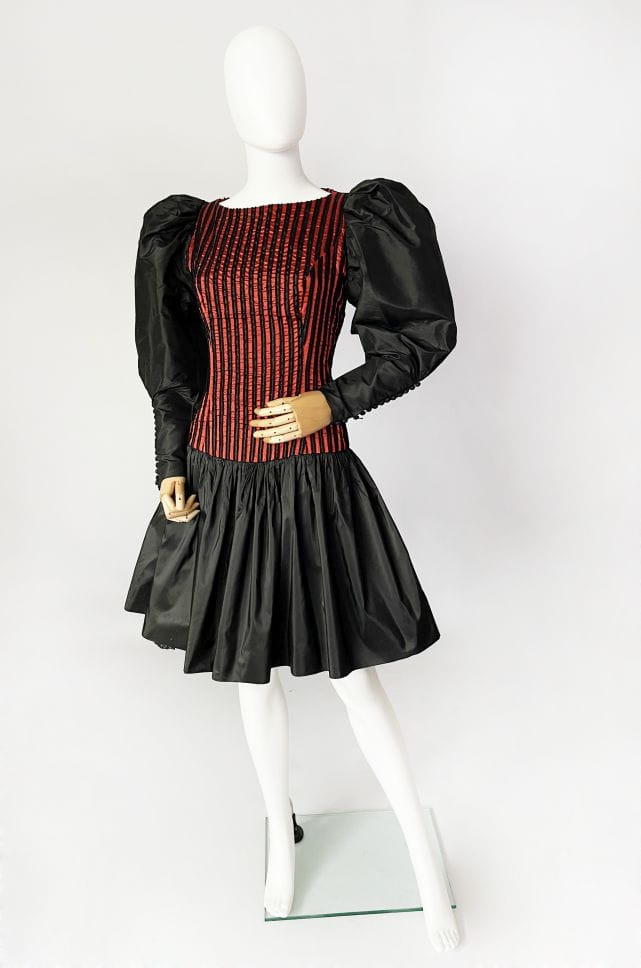 Zjawiskowa sukienka vintage z lat 80-tych z pracowni niemieckiej projektantki Beatrice Hympendahl. Wspaniały model, który jest doskonałą kwintesencją lat 80-tych. Gorsetowa taliowana góra w pionowe wyszywane pasy, w dolnej partii mocno rozkloszowana, pięknie unosi się za sprawą tiulowej podszewki. Podszewka została wykończona czarną koronką, która nieśmiało wygląda spod spódnicy. Uwagę zwracają spektakularne rękawy, bardzo mocno bufiaste w ramionach, a w nadgarstkach wąskie i dopasowane, wykończone ciągiem drobnych guzików. Sukienka została wykonana z dobrej gatunkowo tkaniny, w większości jedwabnej. Pomimo 40-letniego stażu, jest zachowana w doskonałej kondycji.