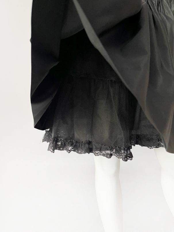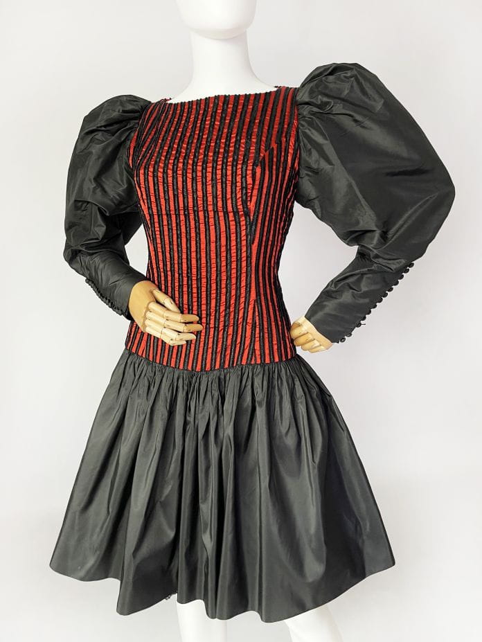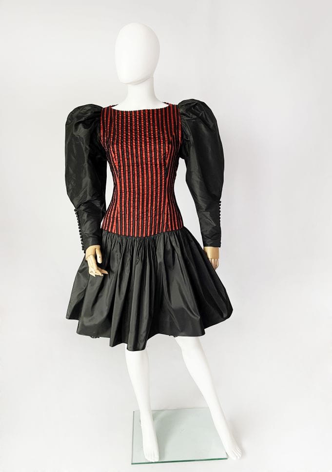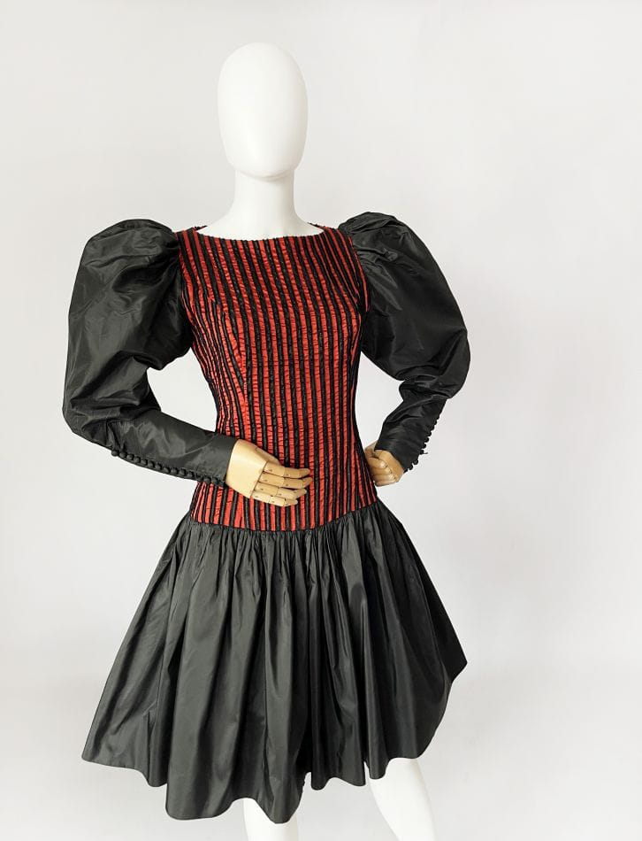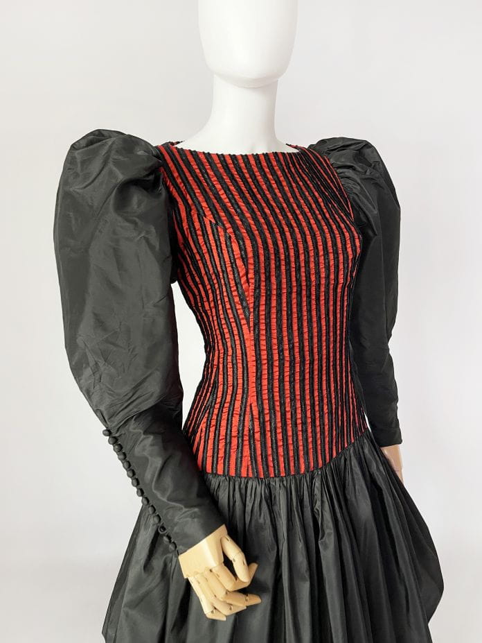 Zjawiskowa sukienka vintage z lat 80-tych z pracowni niemieckiej projektantki Beatrice Hympendahl. Wspaniały model, który jest doskonałą kwintesencją lat 80-tych. Gorsetowa taliowana góra w pionowe wyszywane pasy, w dolnej partii mocno rozkloszowana, pięknie unosi się za sprawą tiulowej podszewki. Podszewka została wykończona czarną koronką, która nieśmiało wygląda spod spódnicy. Uwagę zwracają spektakularne rękawy, bardzo mocno bufiaste w ramionach, a w nadgarstkach wąskie i dopasowane, wykończone ciągiem drobnych guzików. Sukienka została wykonana z dobrej gatunkowo tkaniny, w większości jedwabnej. Pomimo 40-letniego stażu, jest zachowana w doskonałej kondycji.