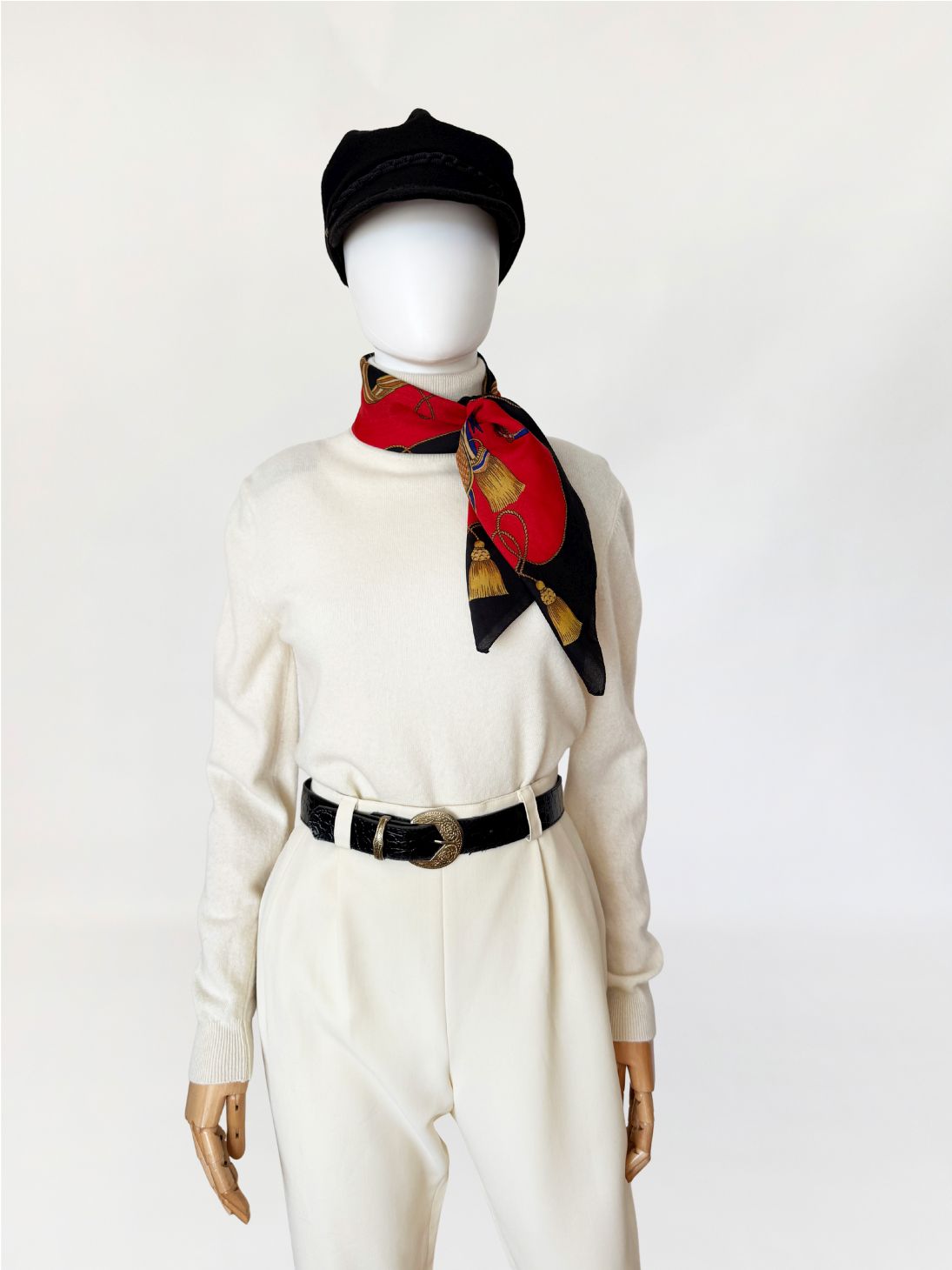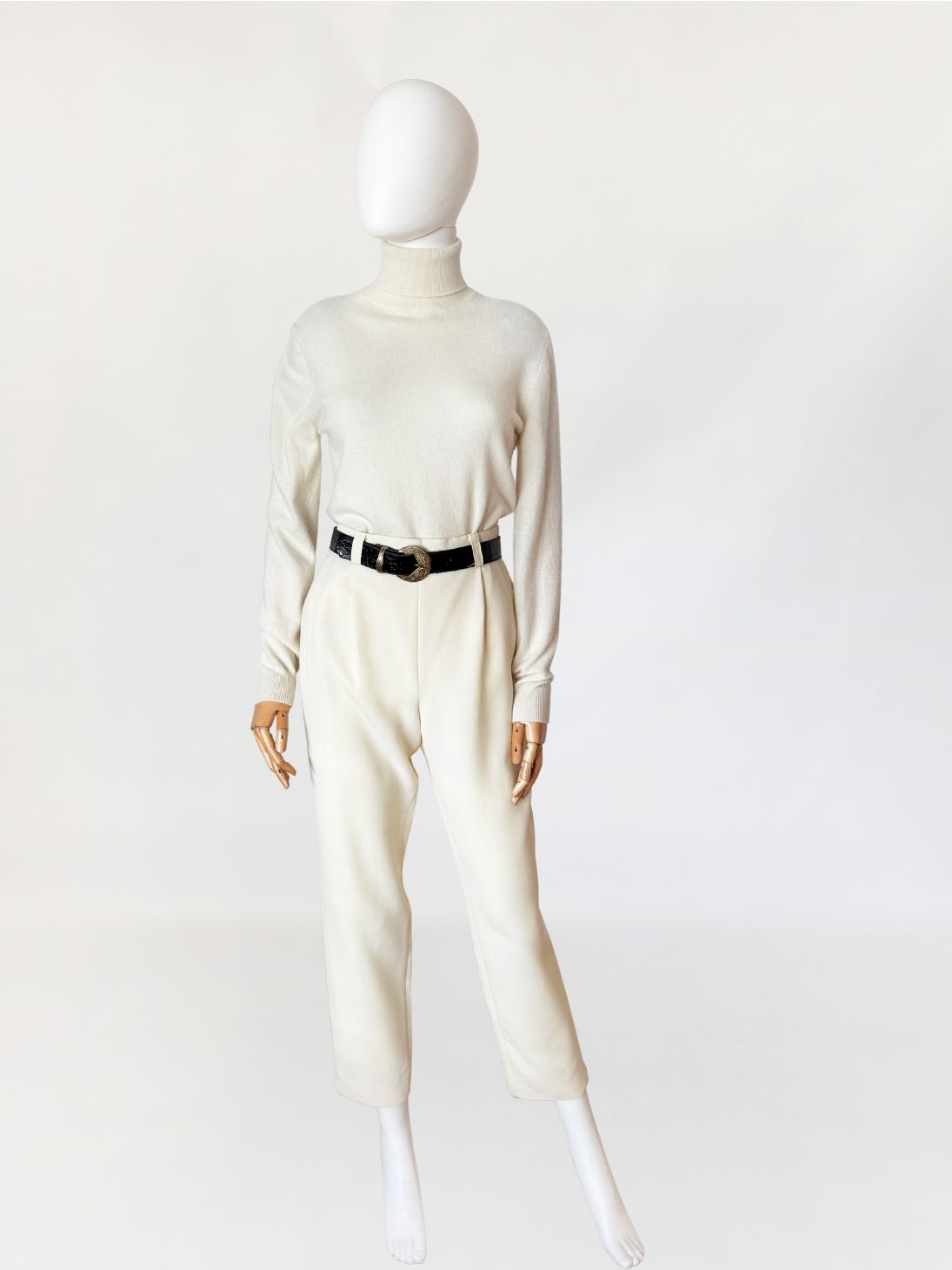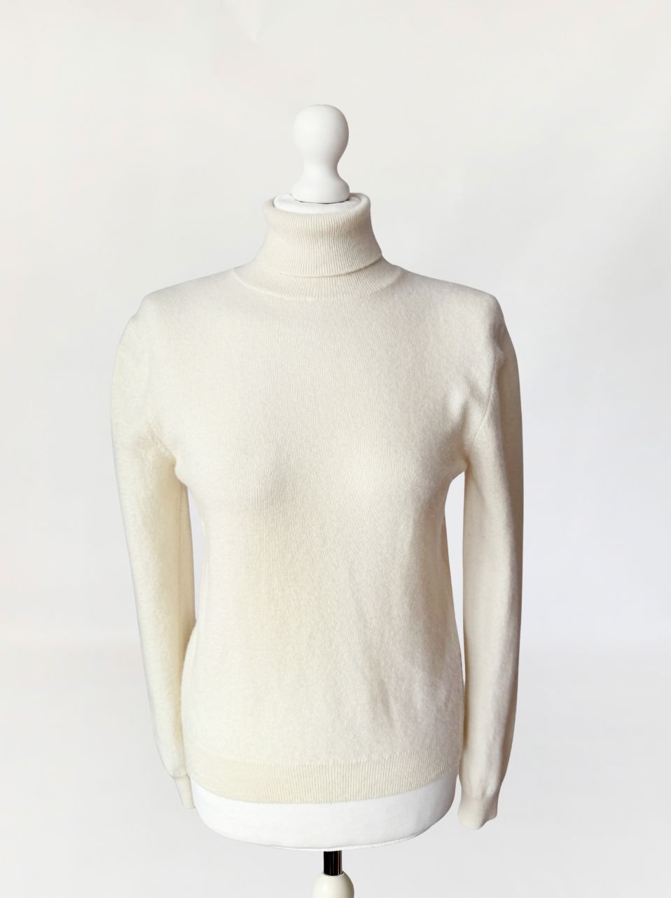 Minimalistyczny sweter marki Benetton wykonany z lekkiej wełnianej dzianiny w kolorze ecru. Dopasowany fason z wysokim golfem.
