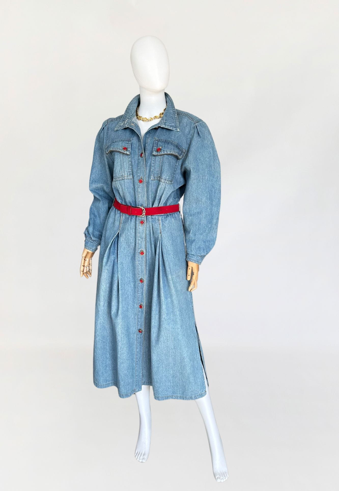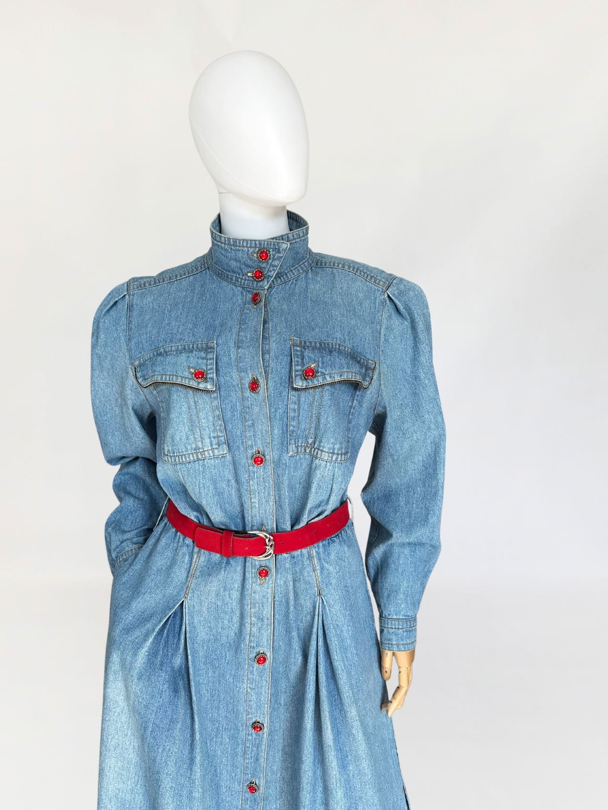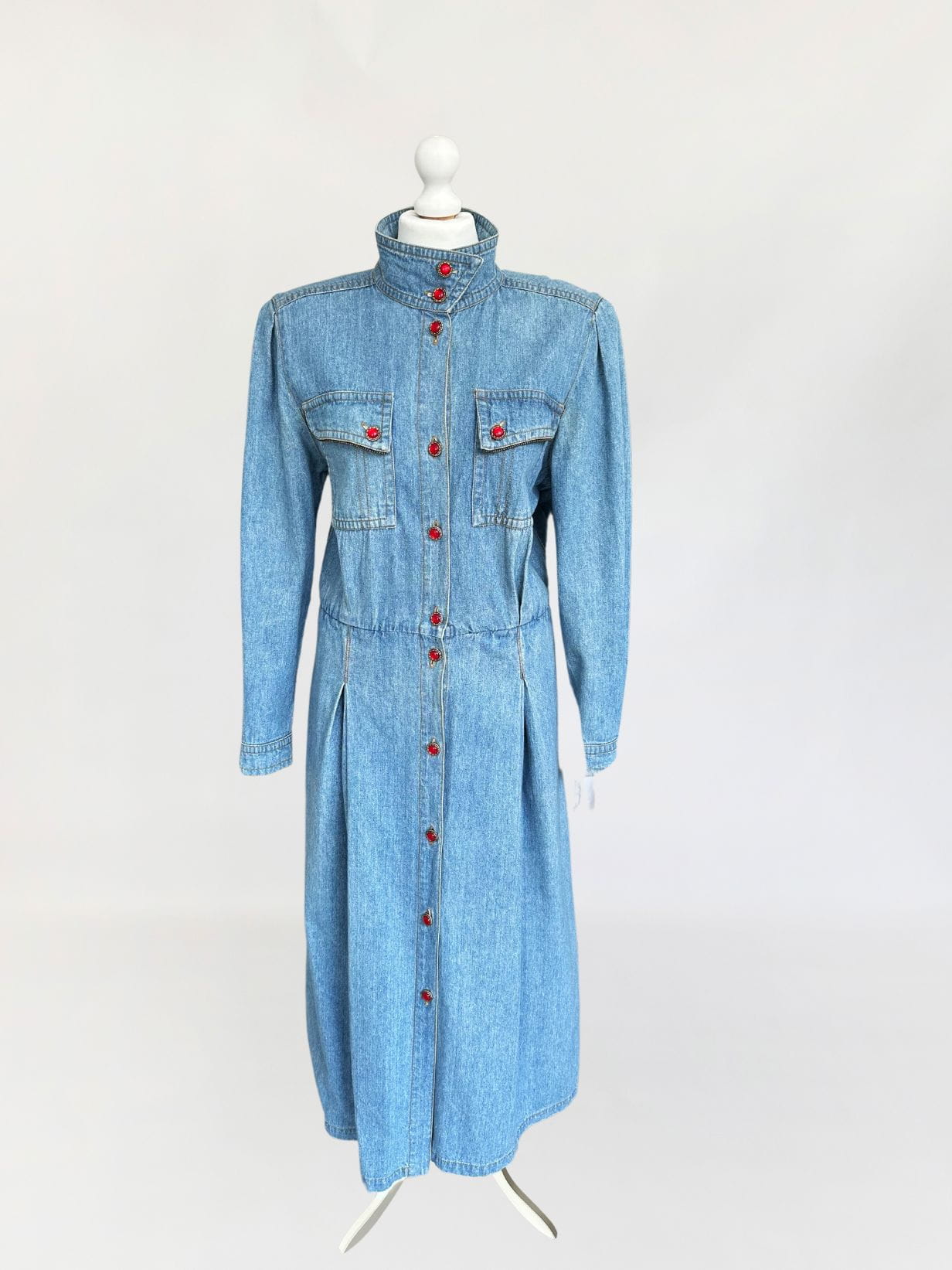 Obłędna maxi sukienka vintage z lat 80-tych projektu marki Betty Barclay. Ze względu na rozpinany fason i krój, doskonale sprawdzi się także jako okrycie wierzchnie. Wykonana w całości z porządnego jeansu, przepinana na biżuteryjny guziki. Góra koszulowa, z kołnierzem i kieszeniami. Spódnica o swobodnym, trapezowym fasonie z kontrafałdami od frontu. Po bokach wysokie rozporki.