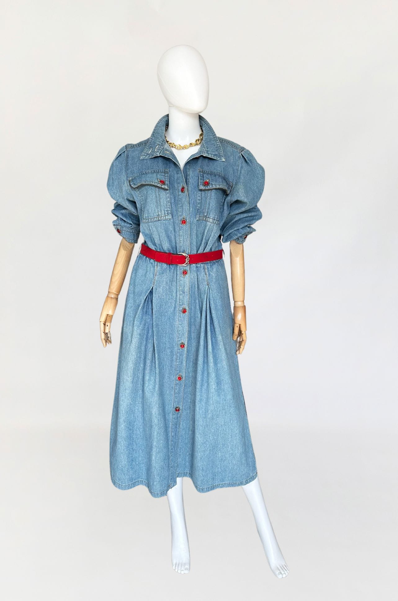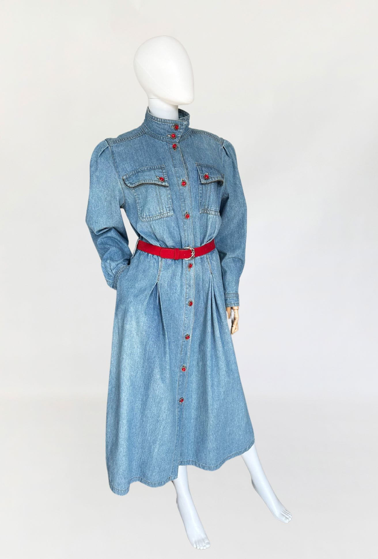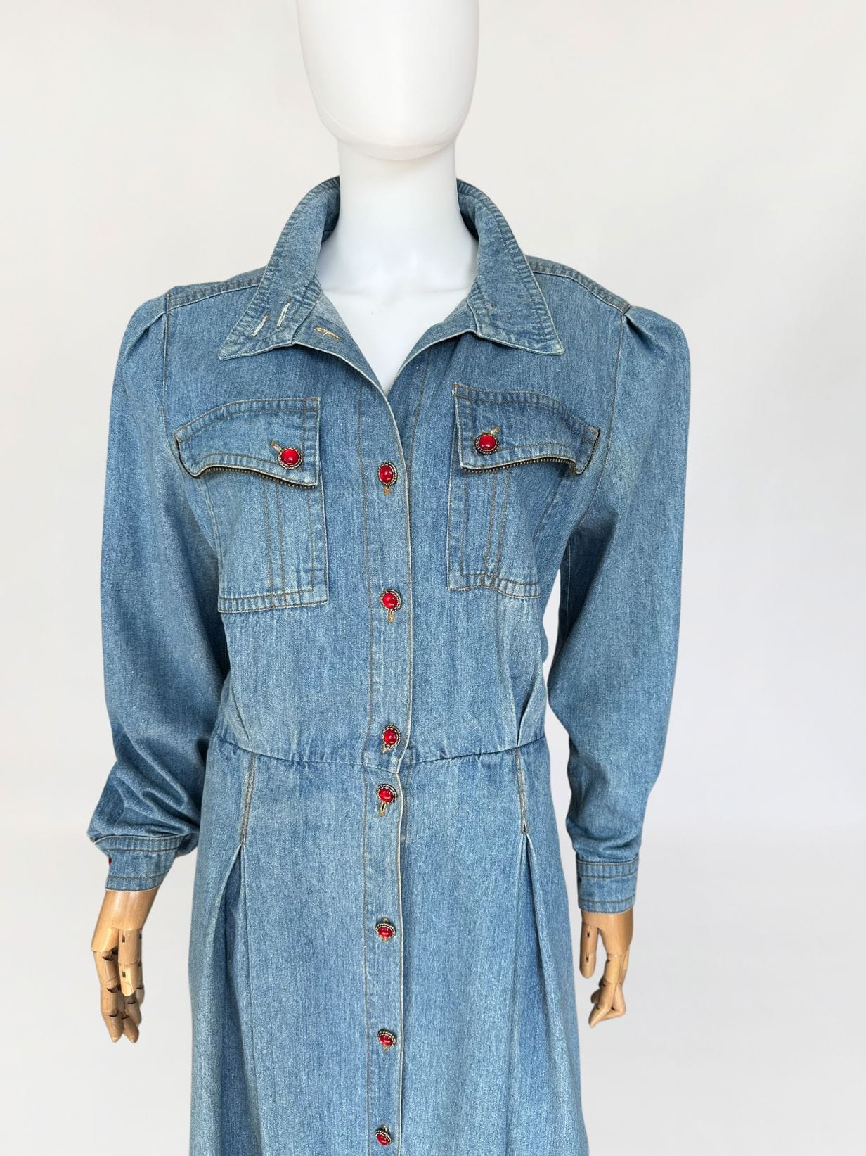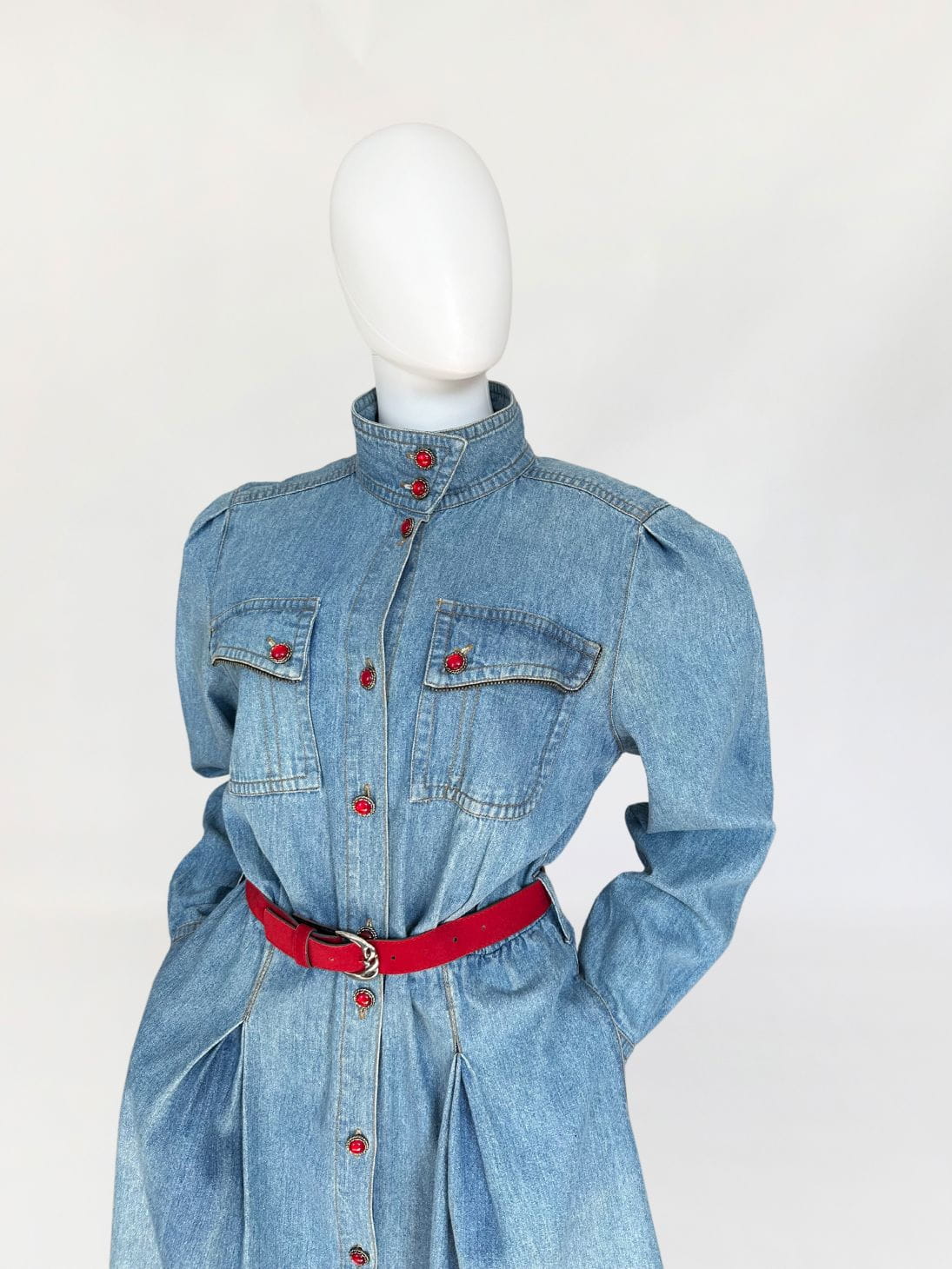 Obłędna maxi sukienka vintage z lat 80-tych projektu marki Betty Barclay. Ze względu na rozpinany fason i krój, doskonale sprawdzi się także jako okrycie wierzchnie. Wykonana w całości z porządnego jeansu, przepinana na biżuteryjny guziki. Góra koszulowa, z kołnierzem i kieszeniami. Spódnica o swobodnym, trapezowym fasonie z kontrafałdami od frontu. Po bokach wysokie rozporki.