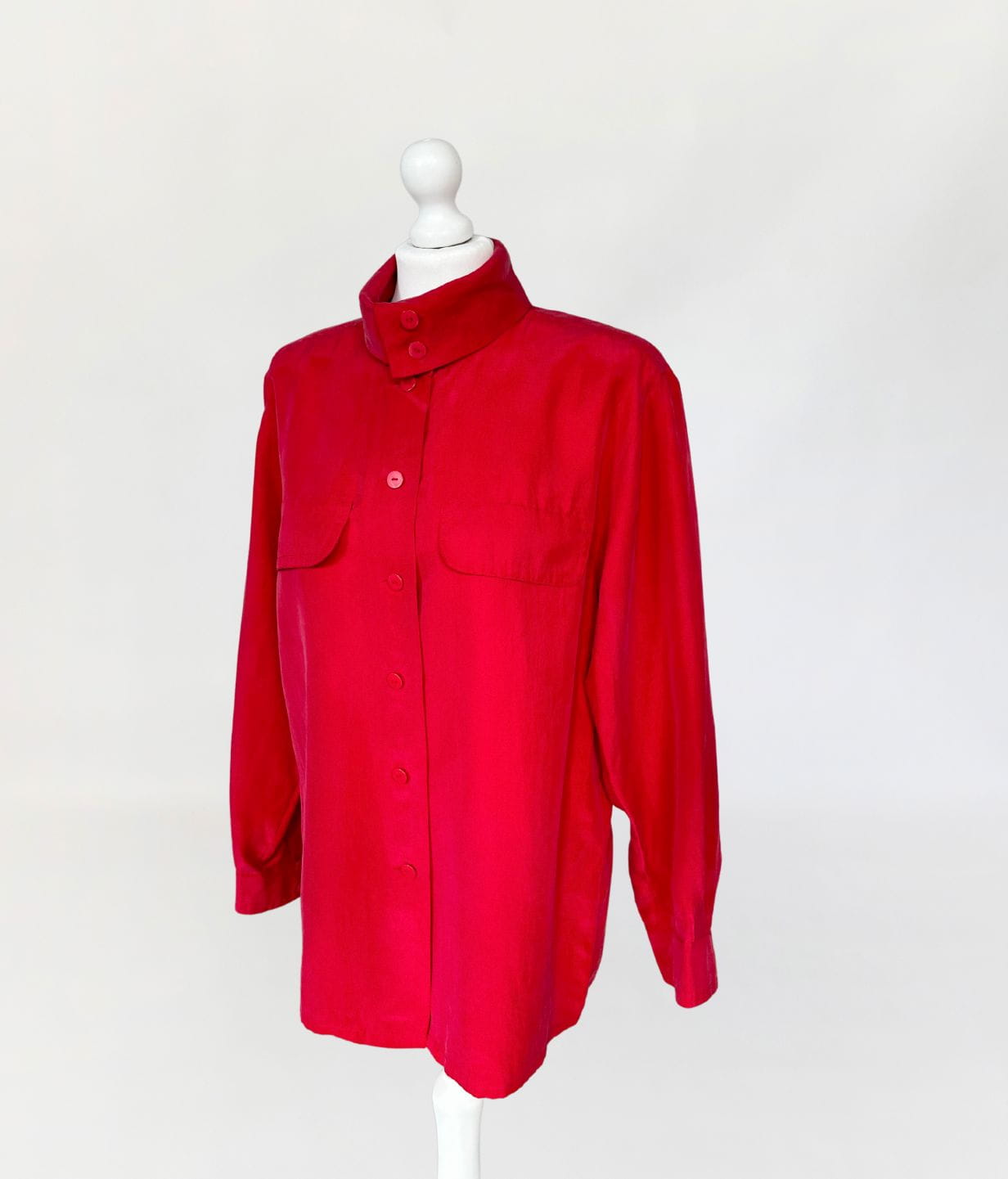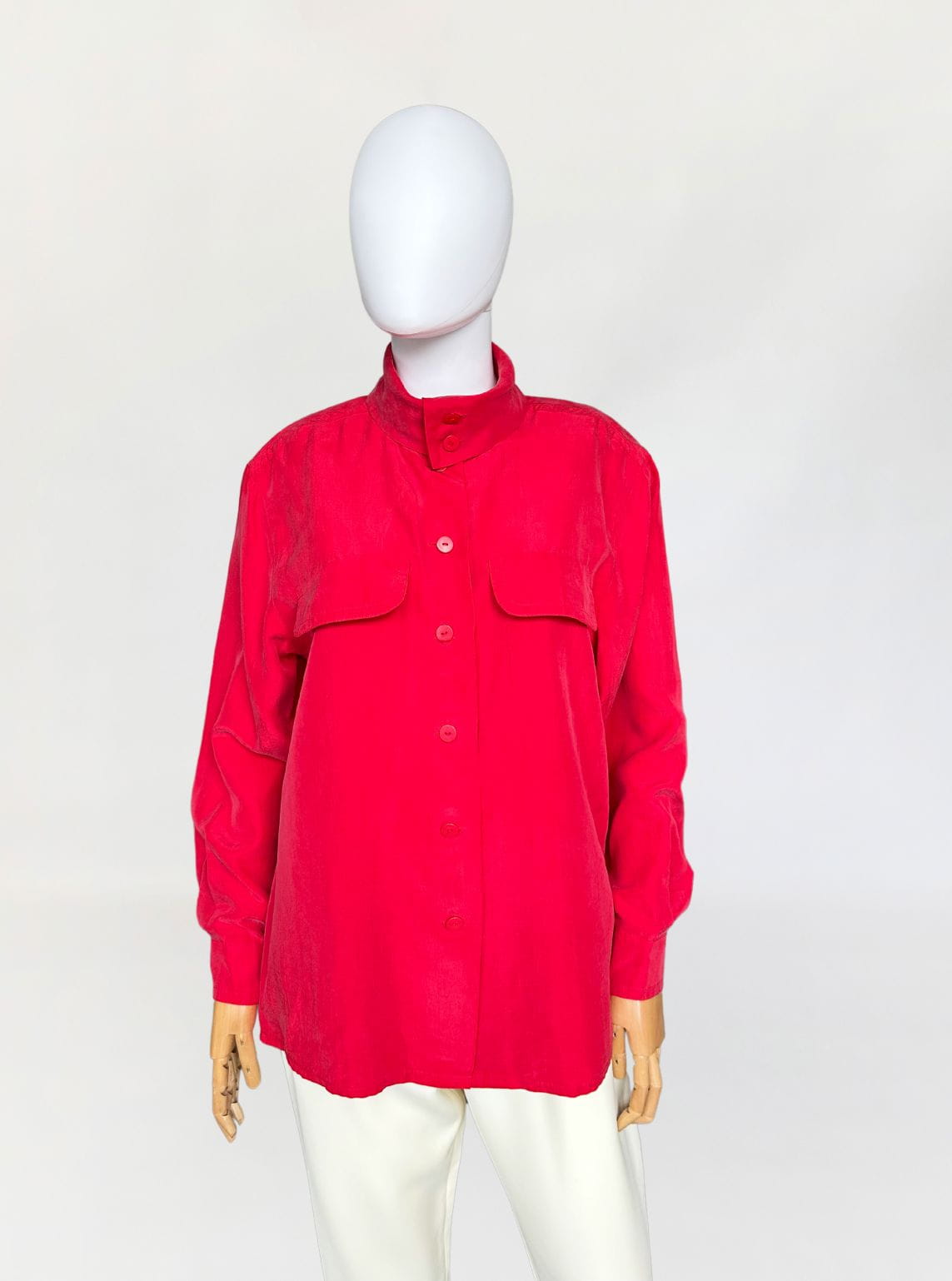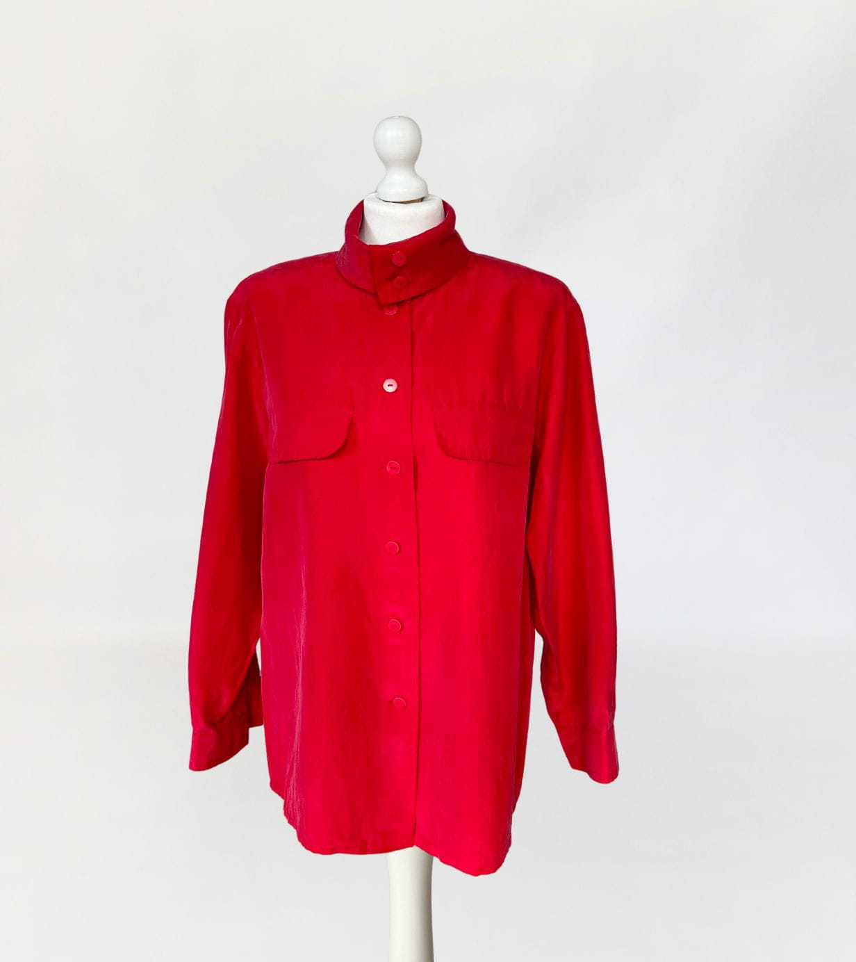 Koszula vintage marki Betty Barclay z lat 80-tych/90-tych. Uszyta z naturalnego jedwabiu w kolorze czerwonym. Klasyczny fason z wysoką stójką, długie rękawy. W biuście klapy imitujące kieszenie.