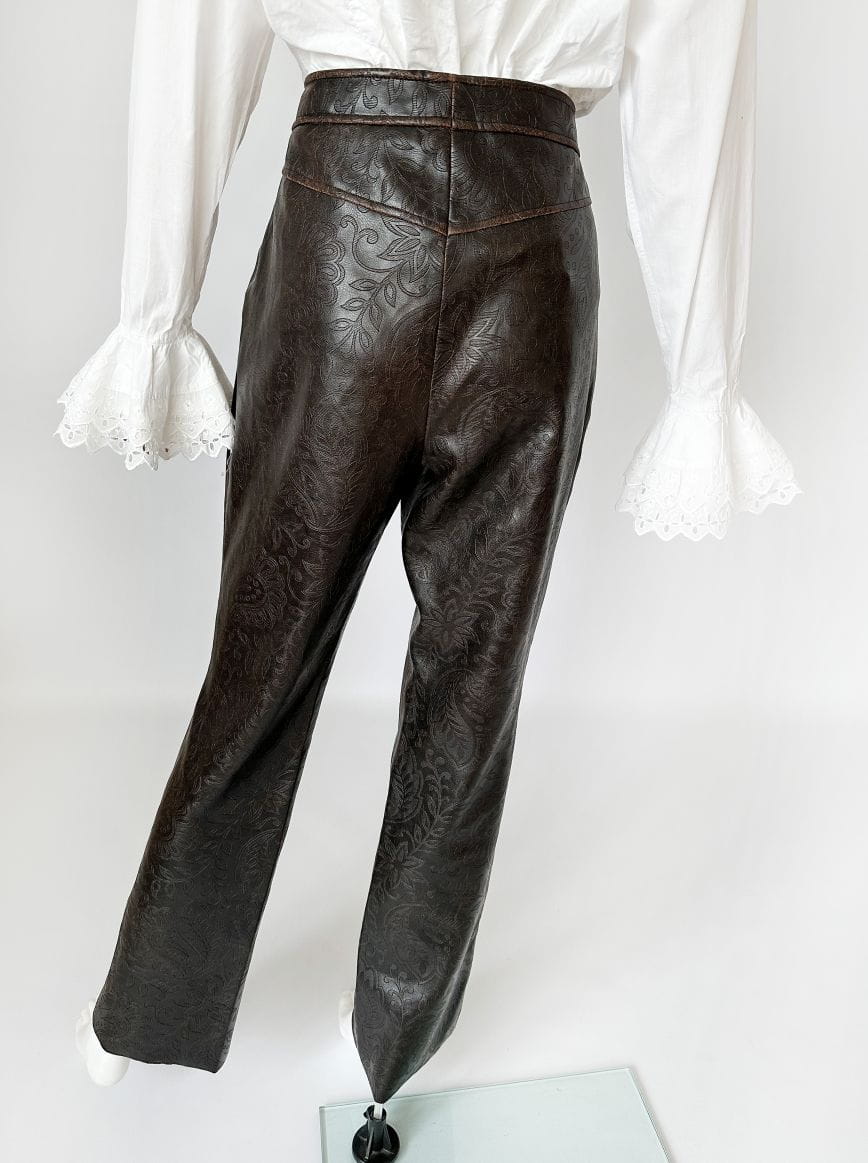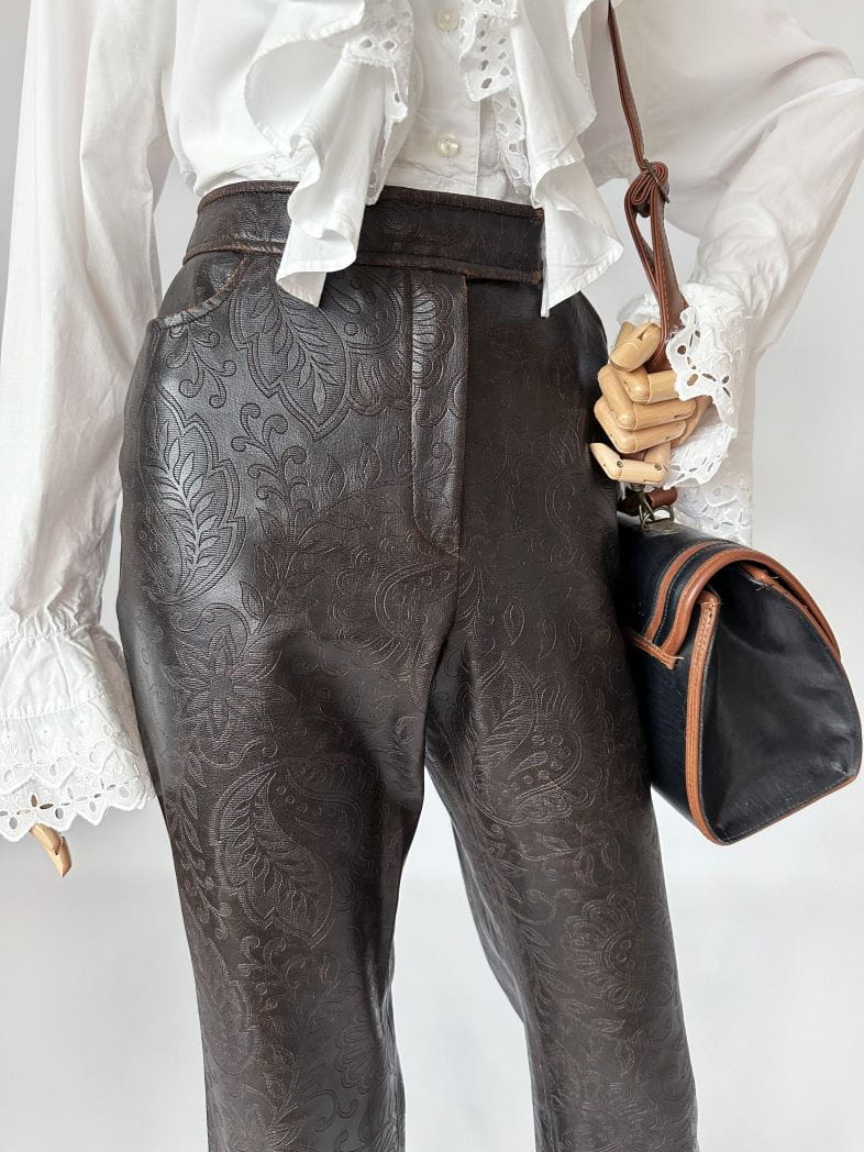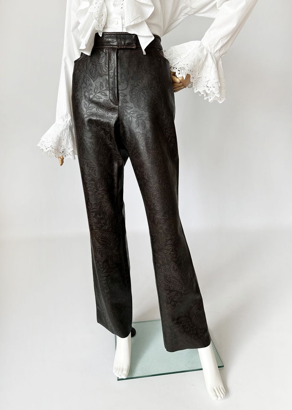 Spodnie projektu marki Betty barclay. Wykonane ze skóry ekologicznej w kolorze czekoladowym w wytłaczane wzory - arabeski i ornamenty. Długie proste nogawki. Od frontu w pasie wsuwane kieszenie.