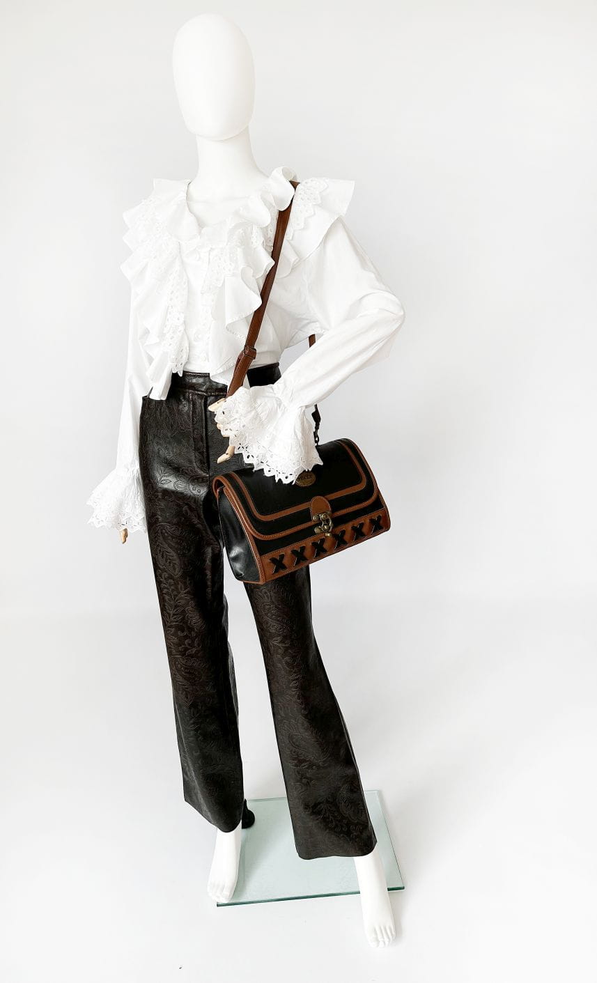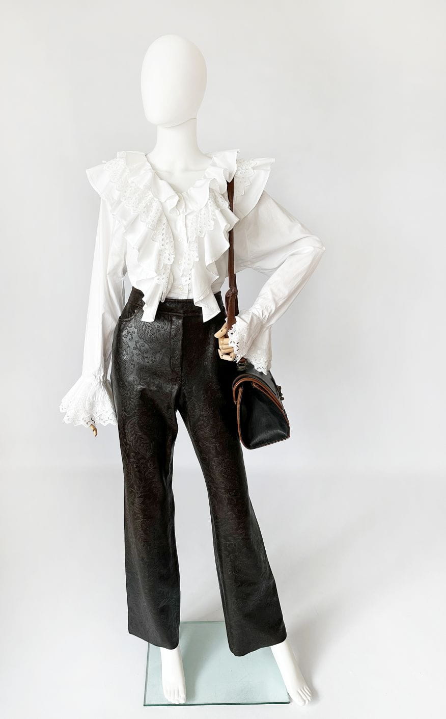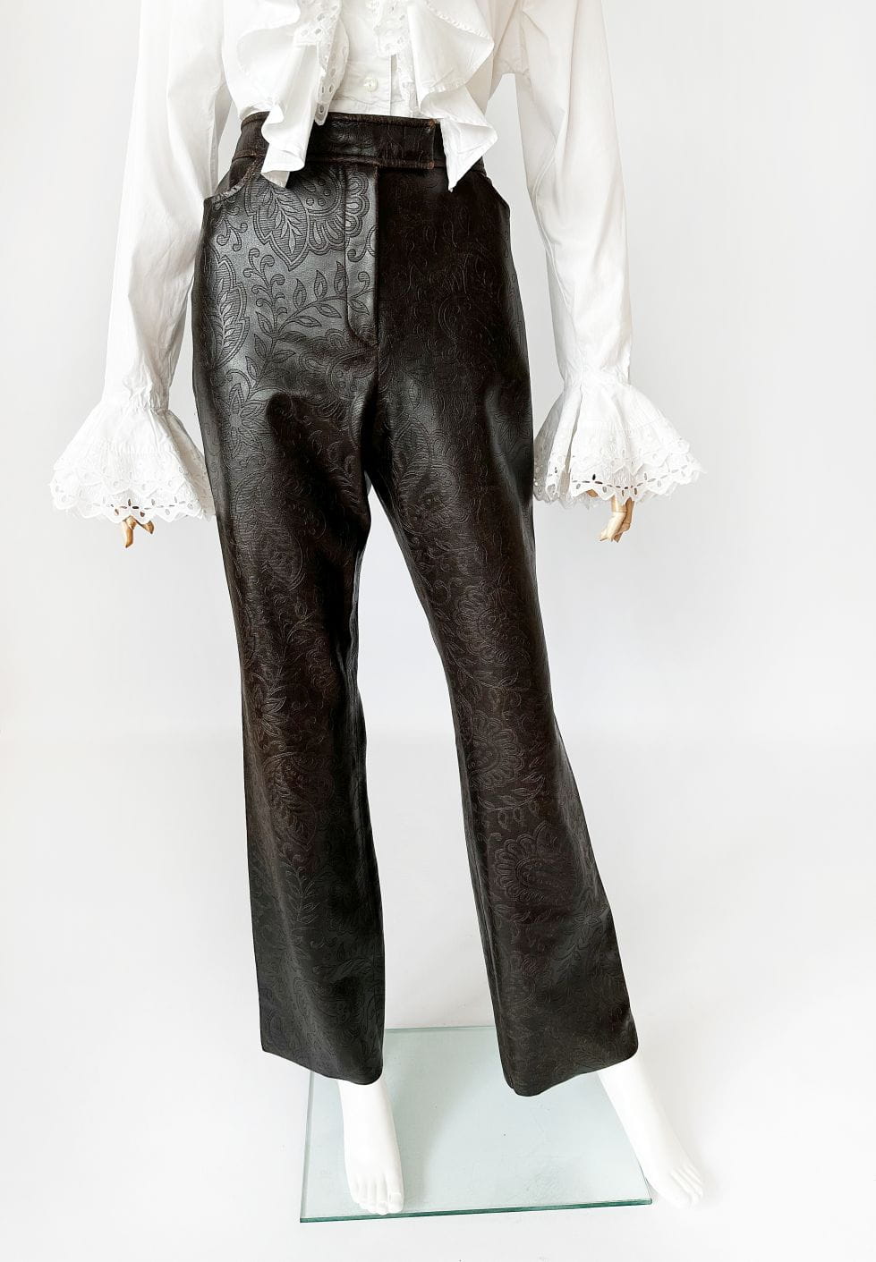 Spodnie projektu marki Betty barclay. Wykonane ze skóry ekologicznej w kolorze czekoladowym w wytłaczane wzory - arabeski i ornamenty. Długie proste nogawki. Od frontu w pasie wsuwane kieszenie.