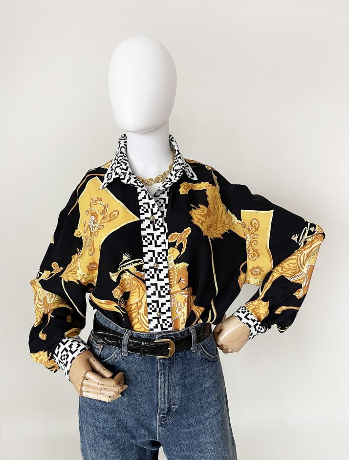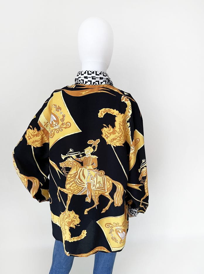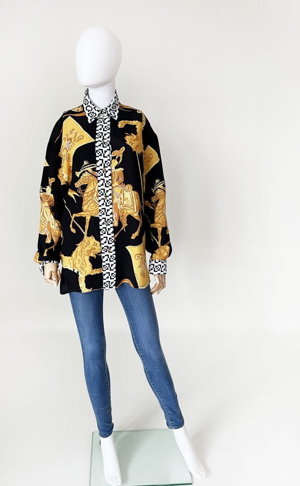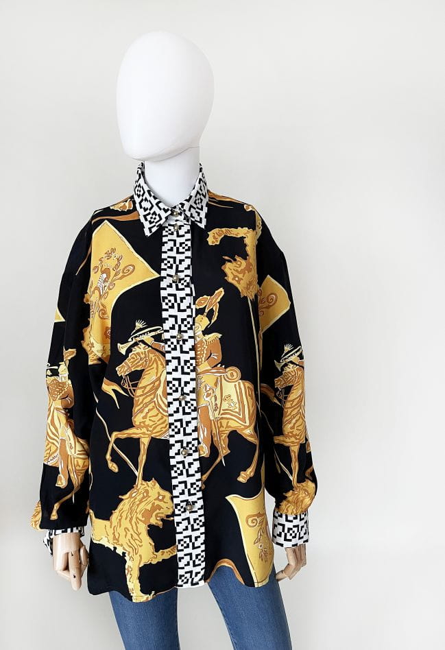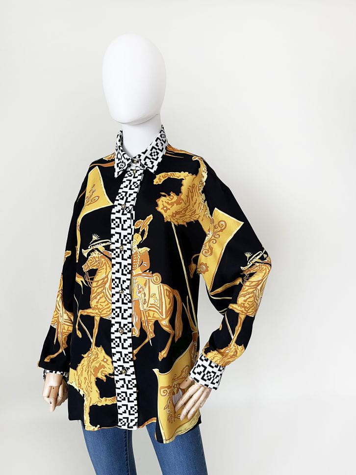 Koszula marki Betty Barclay, vintage lata 80-te/90-te. Wykonana z lekkiej tkaniny w okazale wzory heraldyczne/jeździeckie/zwierzęce. Listwa z guzikami i kołnierzyk w czaro-białe geometryczne znaczki. Świetna kolorystyka, całość zwraca uwagę.