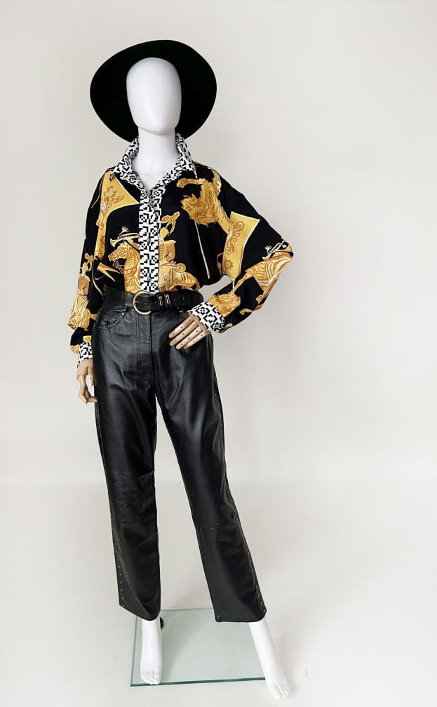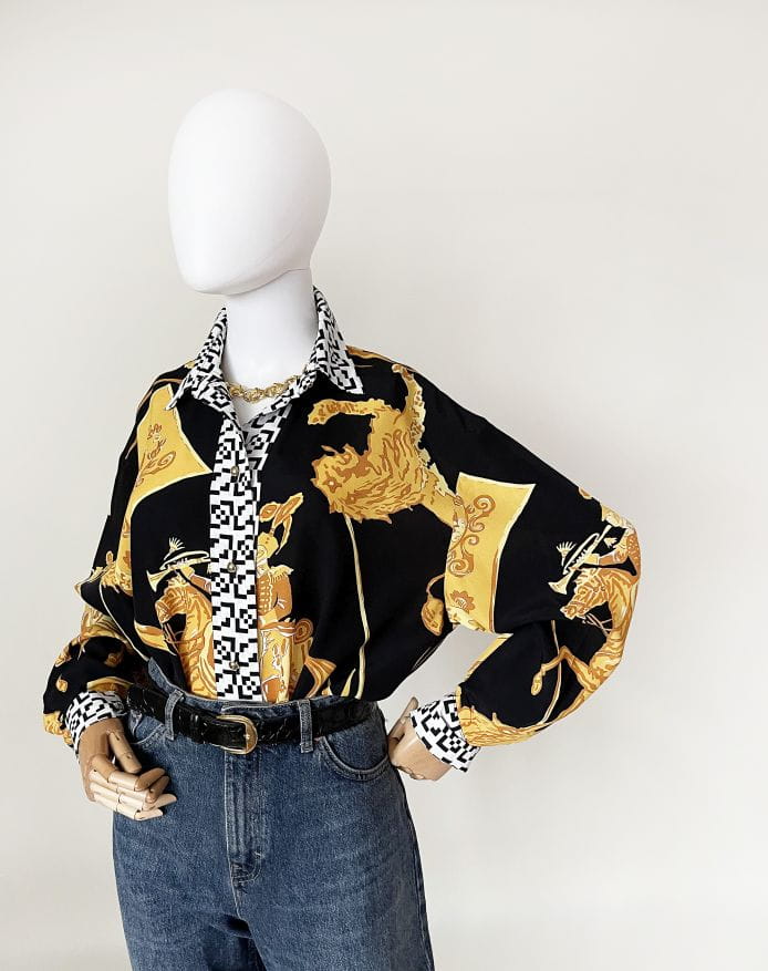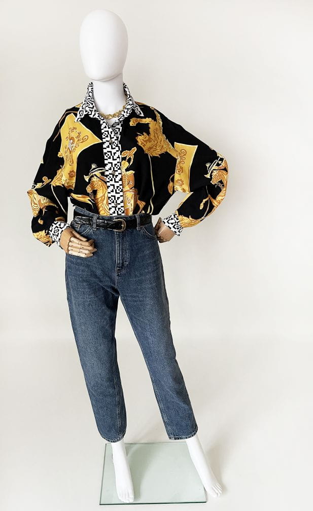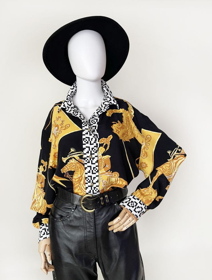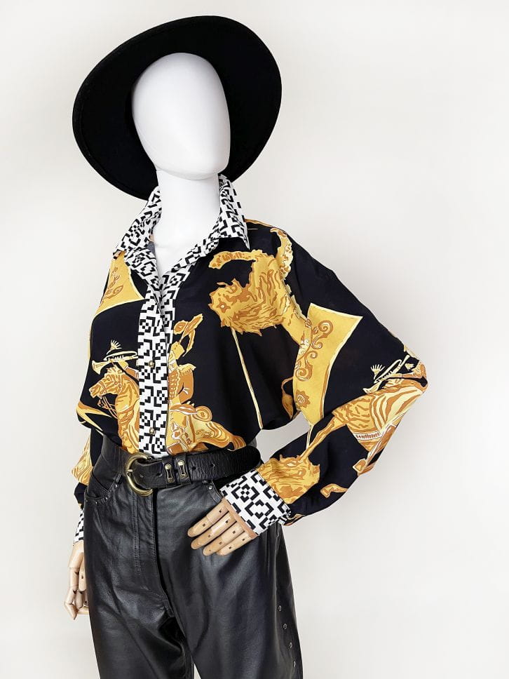 Koszula marki Betty Barclay, vintage lata 80-te/90-te. Wykonana z lekkiej tkaniny w okazale wzory heraldyczne/jeździeckie/zwierzęce. Listwa z guzikami i kołnierzyk w czaro-białe geometryczne znaczki. Świetna kolorystyka, całość zwraca uwagę.