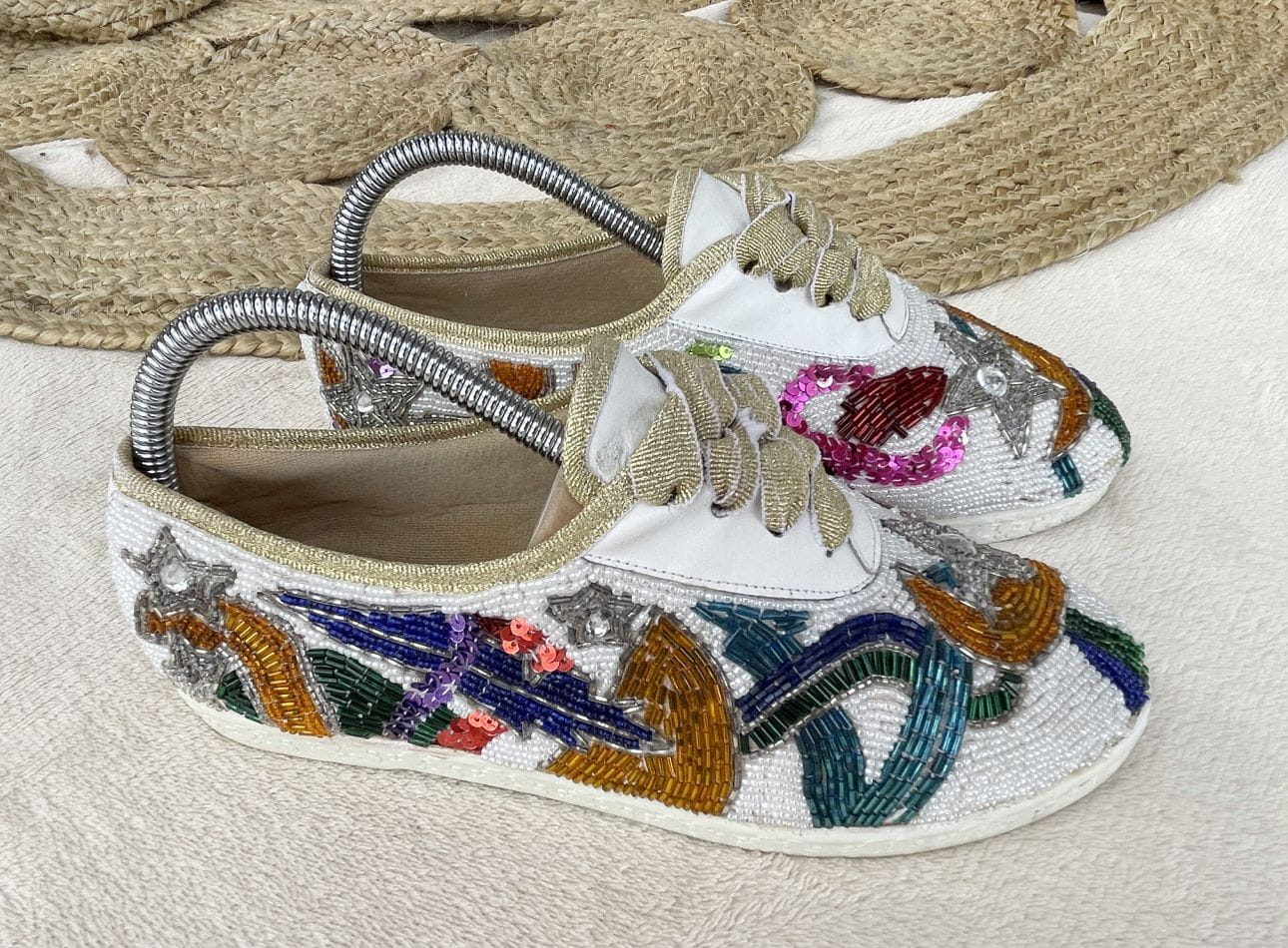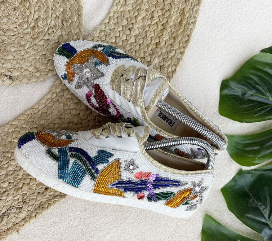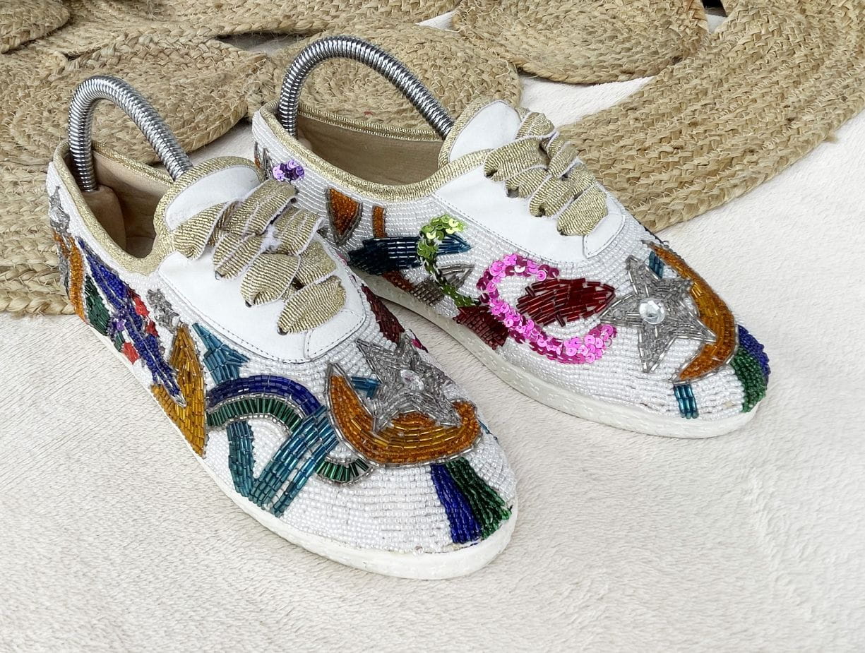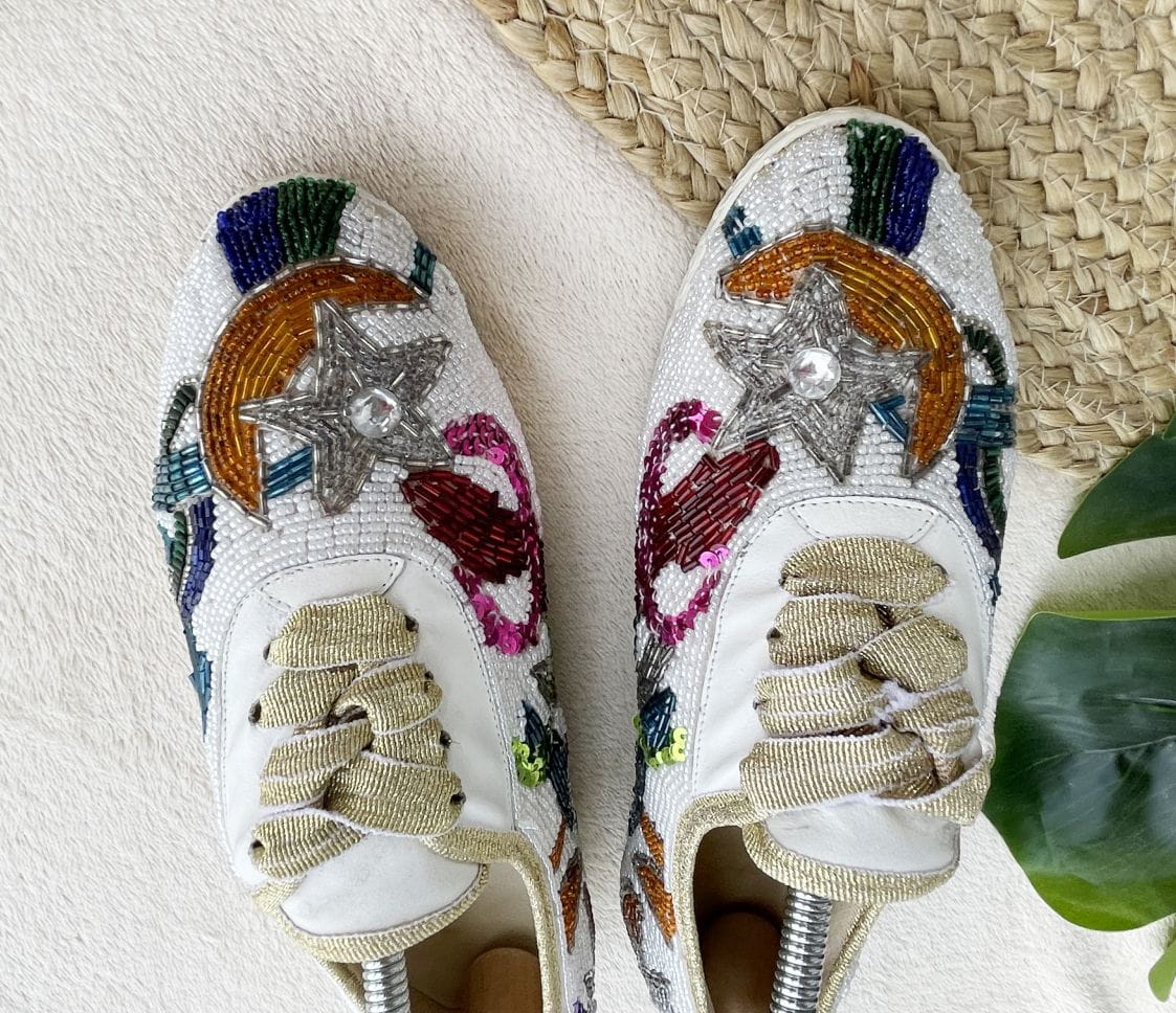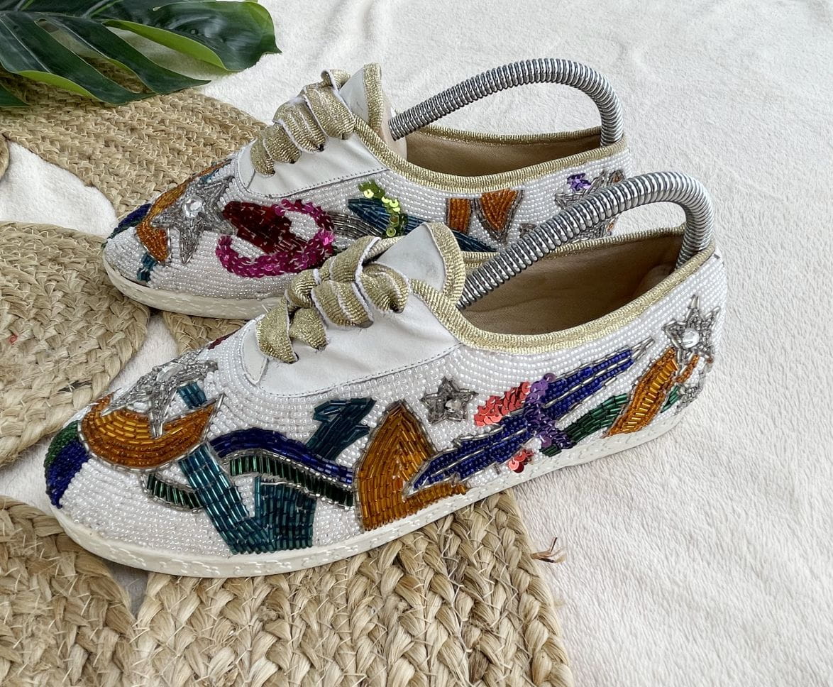 "To much is not enough" - jak głosi hasło z podeszwy tych obłędnych sneakers'ów - naszym zdaniem doskonale je opisuje. Wszystkiego jest tu dużo i wygląda to wyśmienicie. Buty to model vintage z lat 80-tych projektu marki Beverly Feldman. Cholewka została wykonana z dobrej jakości płótna, w całości wyszywanego biżuteryjnymi aplikacjami. Znajdziemy tu dużo koralików różnej wielkości, kształtu i koloru. Ale również cekiny i cyrkonie. Zdobienia układają się w (nie)przypadkowe wzory. Wszystko solidnie trzyma się na miejscu od lat. Całość jest wyjątkowo wygodna i lekka. Sznurówki to w oryginale rypsowe złote tasiemki, które doskonale pasują do takiej samej lamówki, którą wykończono cholewki. Buty mają bardzo zgrabny fason z okrągłymi noskami, świetnie wysmuklają nogę.