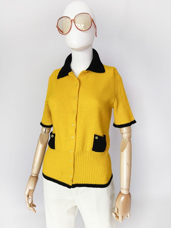 Bluzka vintage z lat 70-tych, wykonana z tkaniny a'la frotte w kolorze kurkumy z kontrastowym kołnierzem i małymi kieszeniami u dołu. Tkanina jest elastyczna. Rozpinany model z krótkimi rękawami. U dołu wysoki ściągacz.