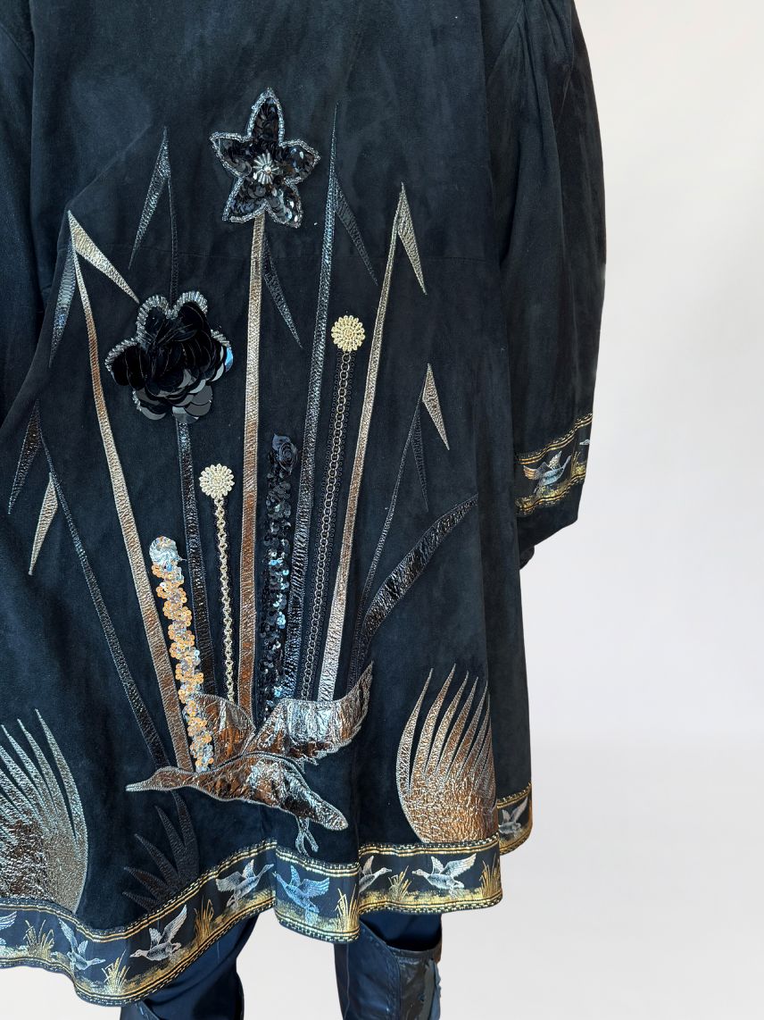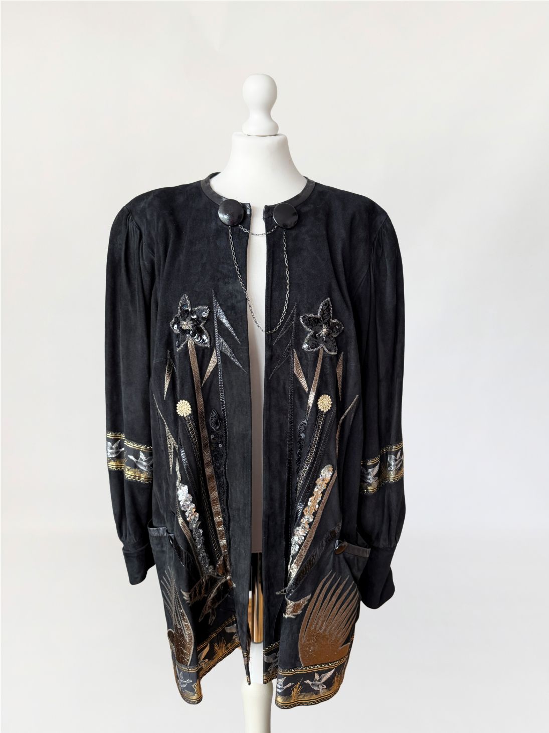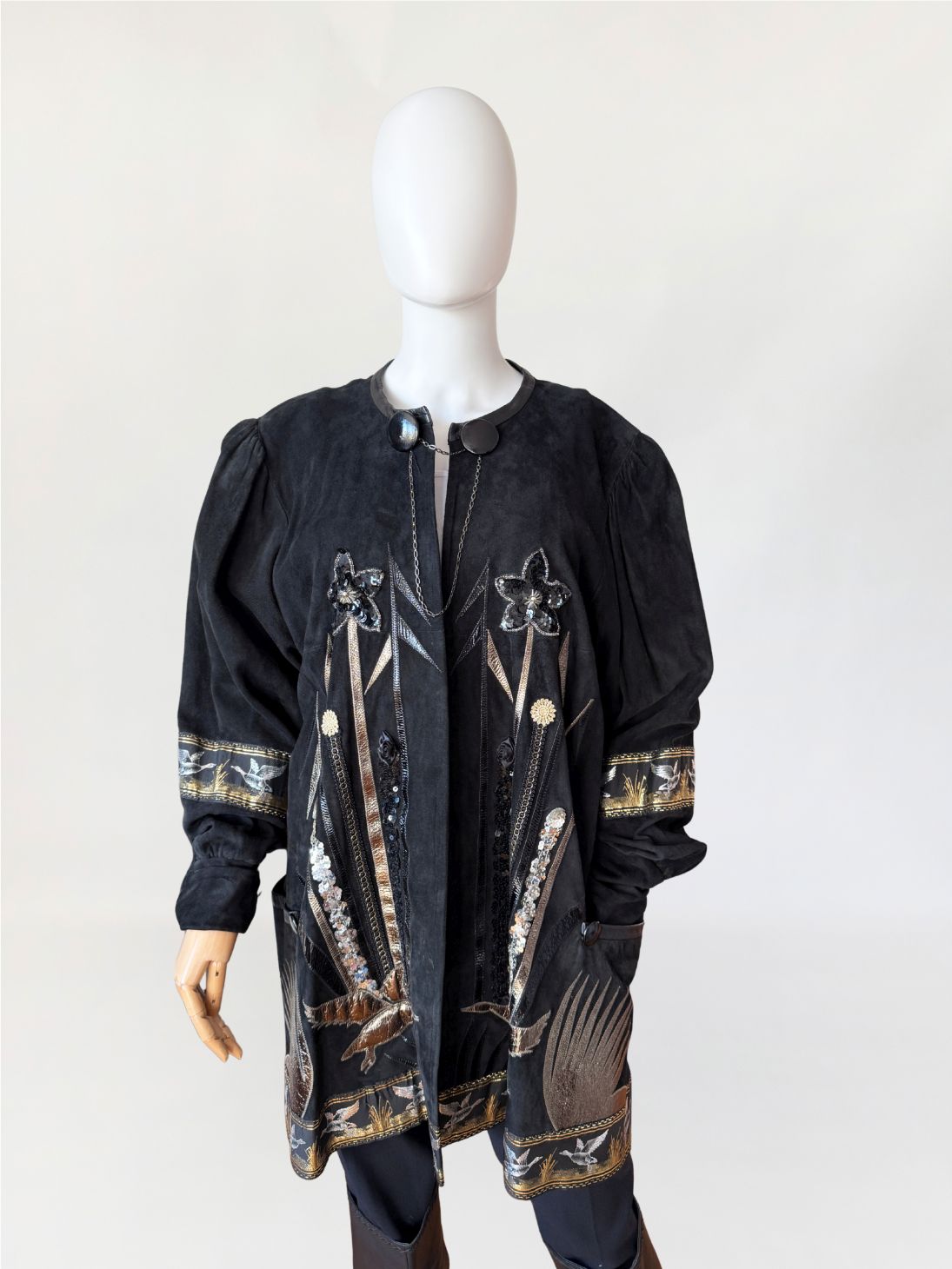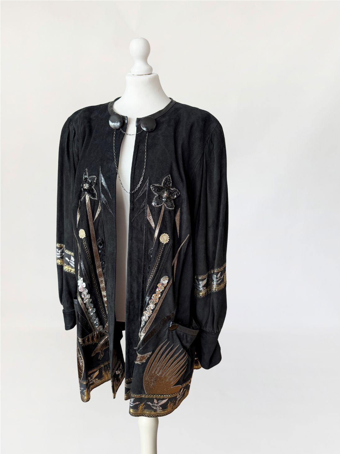 Unikatowy kolekcjonerski egzemplarz. Płaszcz/długa kurtka vintage z lat 80-tych wykonana z miękkiego czarnego naturalnego zamszu. Przód i tył zdobiony efektownymi biżuteryjnymi aplikacjami i haftami w metalicznych odcieniach złota, srebra i miedzi. Motywy florystyczne i ptasie uzupełnione cekinami i tłoczonymi elementami skórzanymi. Dekoracyjna żakardowa lamówka z motywem ptaków biegnie wzdłuż dołu kurtki oraz na rękawach. Swobodny, dłuższy fason z długimi rękawami, ramiona bufowane. Zapięcie u góry na dwa ozdobne guziki połączone krótkim łańcuszkiem.