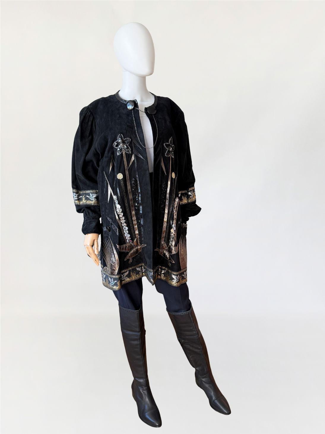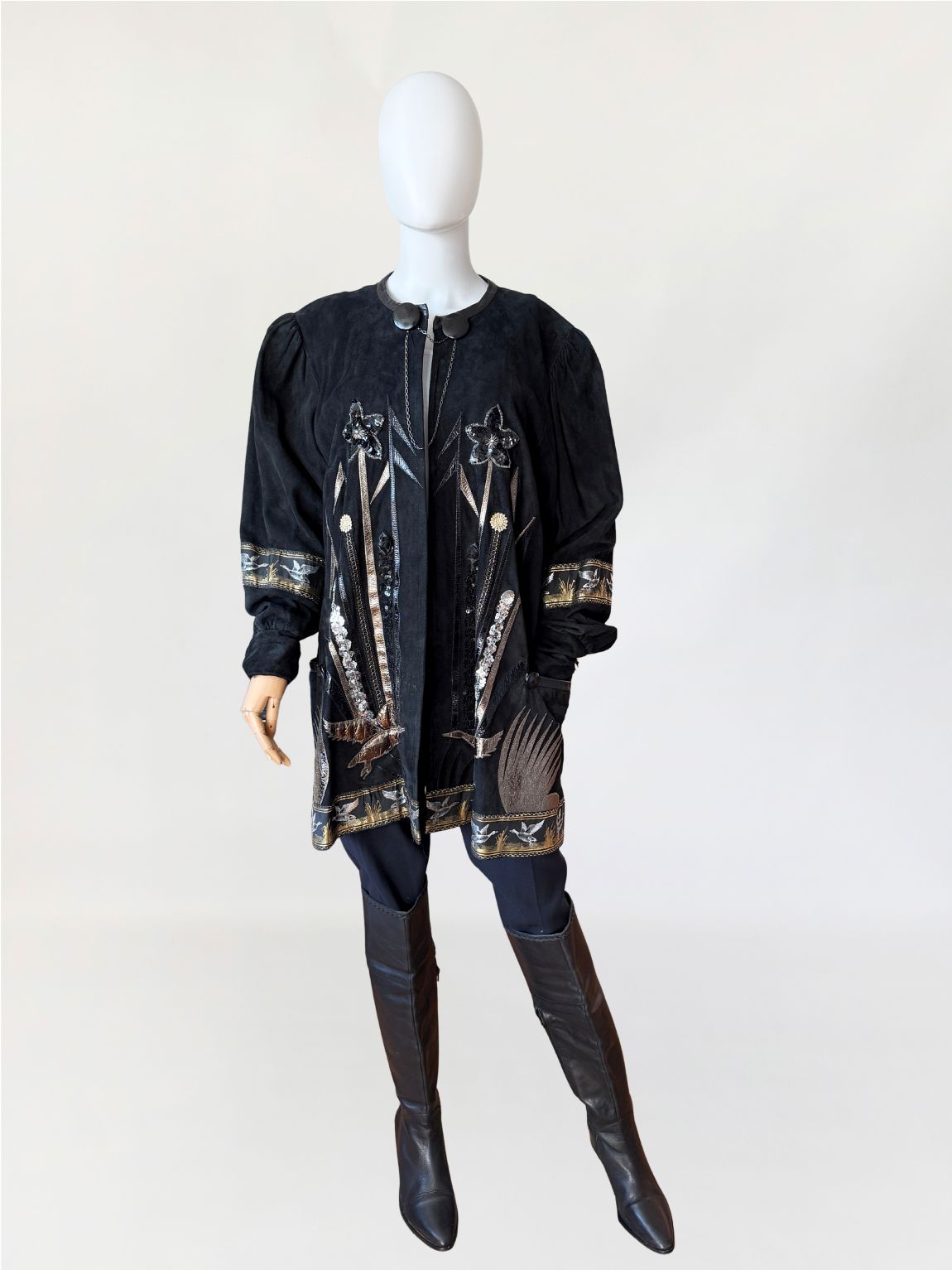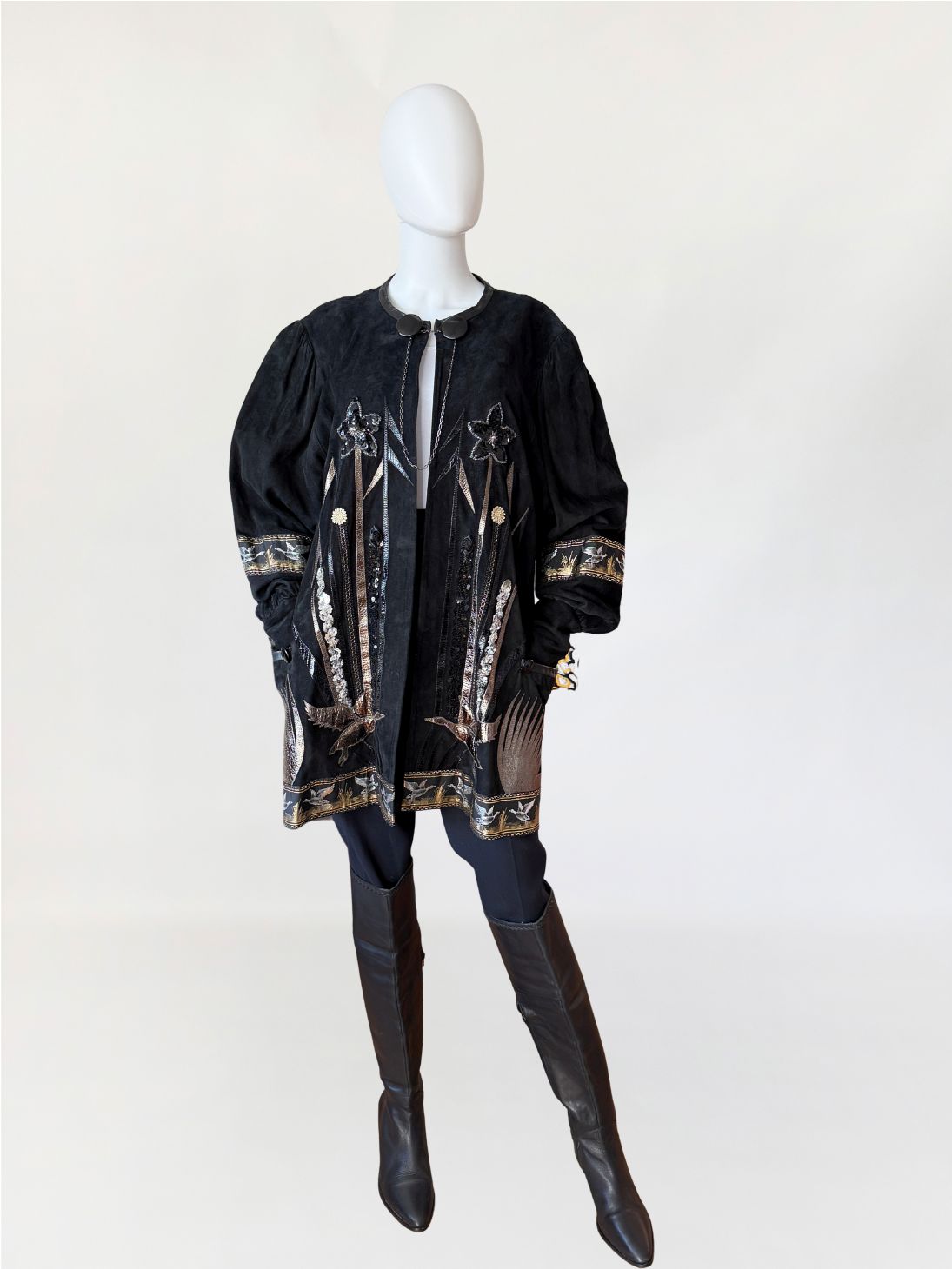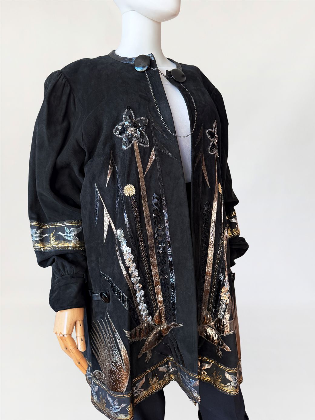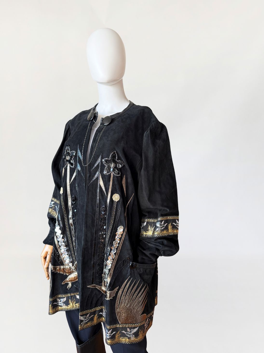 Unikatowy kolekcjonerski egzemplarz. Płaszcz/długa kurtka vintage z lat 80-tych wykonana z miękkiego czarnego naturalnego zamszu. Przód i tył zdobiony efektownymi biżuteryjnymi aplikacjami i haftami w metalicznych odcieniach złota, srebra i miedzi. Motywy florystyczne i ptasie uzupełnione cekinami i tłoczonymi elementami skórzanymi. Dekoracyjna żakardowa lamówka z motywem ptaków biegnie wzdłuż dołu kurtki oraz na rękawach. Swobodny, dłuższy fason z długimi rękawami, ramiona bufowane. Zapięcie u góry na dwa ozdobne guziki połączone krótkim łańcuszkiem.