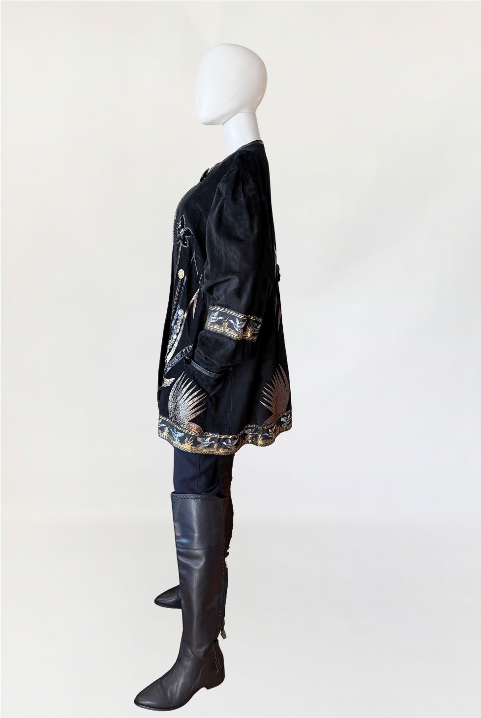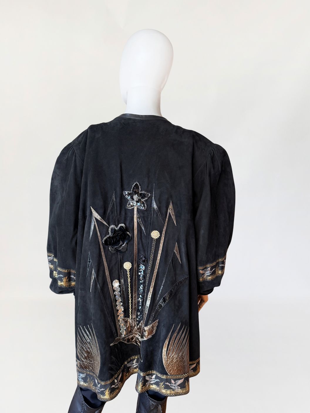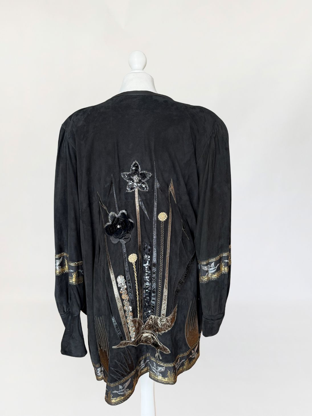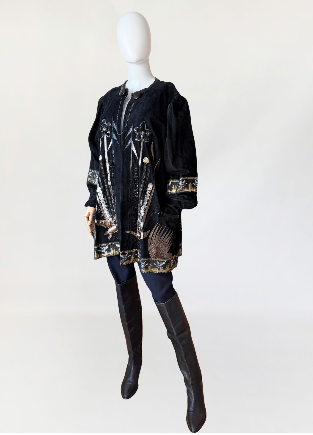 Unikatowy kolekcjonerski egzemplarz. Płaszcz/długa kurtka vintage z lat 80-tych wykonana z miękkiego czarnego naturalnego zamszu. Przód i tył zdobiony efektownymi biżuteryjnymi aplikacjami i haftami w metalicznych odcieniach złota, srebra i miedzi. Motywy florystyczne i ptasie uzupełnione cekinami i tłoczonymi elementami skórzanymi. Dekoracyjna żakardowa lamówka z motywem ptaków biegnie wzdłuż dołu kurtki oraz na rękawach. Swobodny, dłuższy fason z długimi rękawami, ramiona bufowane. Zapięcie u góry na dwa ozdobne guziki połączone krótkim łańcuszkiem.