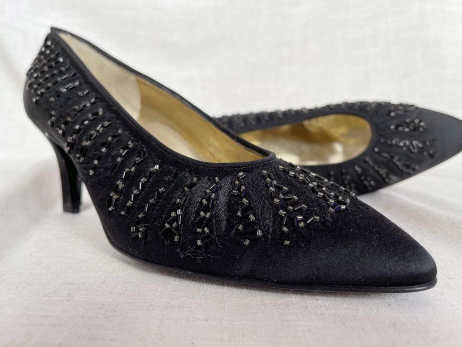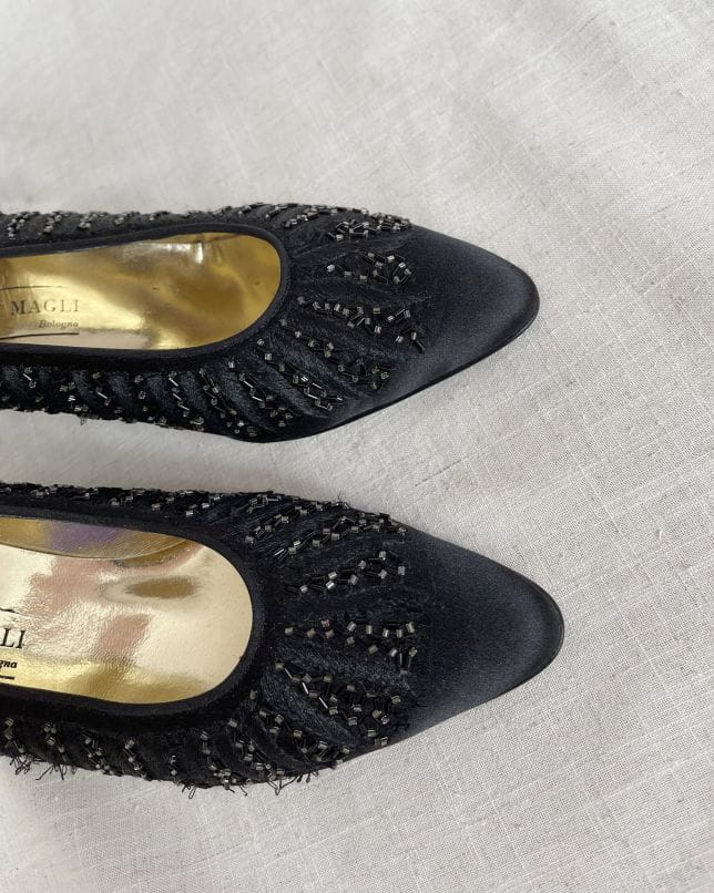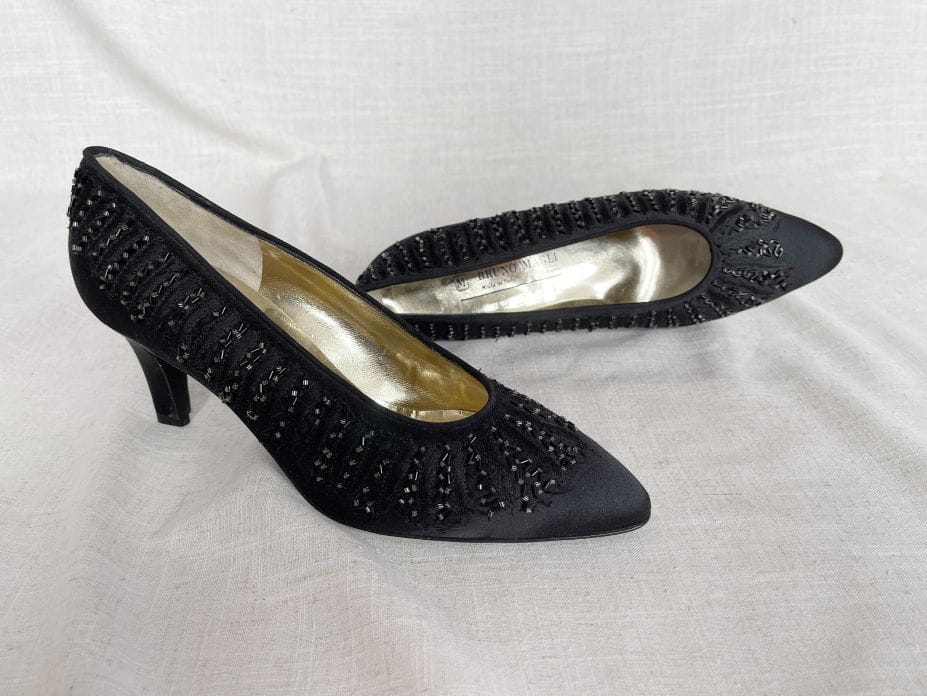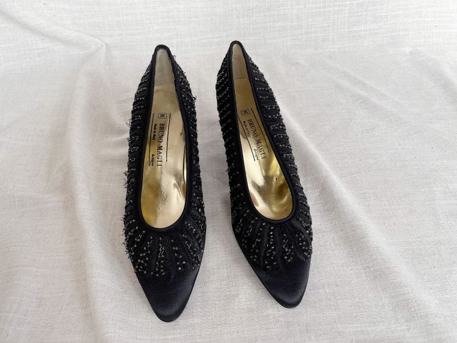 Włoskie czarne koktajlowe czółenka renomowanej marki Bruno Magli. Klasyczny model z czarnej satyny, przełamany haftowanymi aplikacjami i dyskretnymi koralikami na całości cholewki. Nieduży stabilny obcas. Wybrakowane ozdoby.