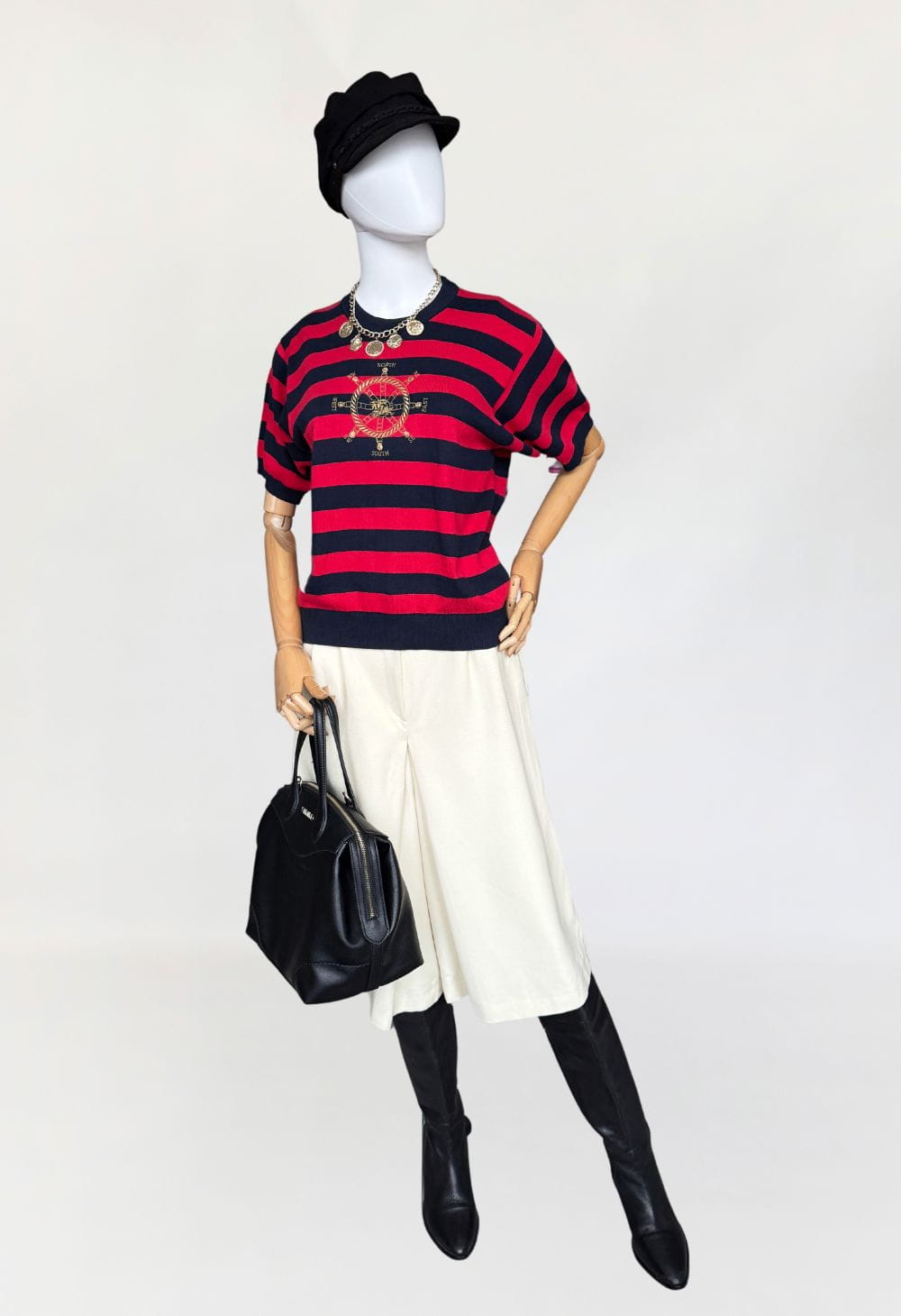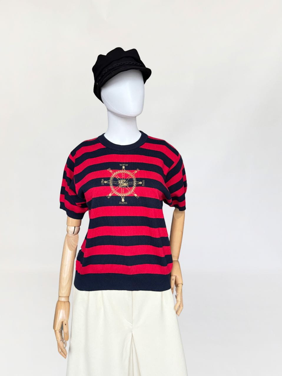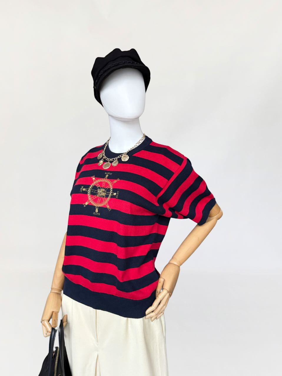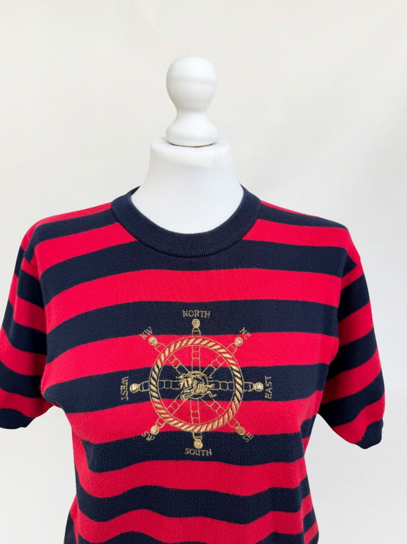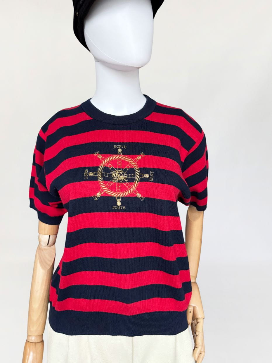 Casual'owy sweter vintage z lat 90-tych marki Burberry (z czasy kiedy marka używała nazwy Burberrys). Wykonany z lekkiej (naszym zdaniem) bawełnianej dzianiny. Model w marynistycznym stylu ze złotą haftowaną aplikacją od frontu.