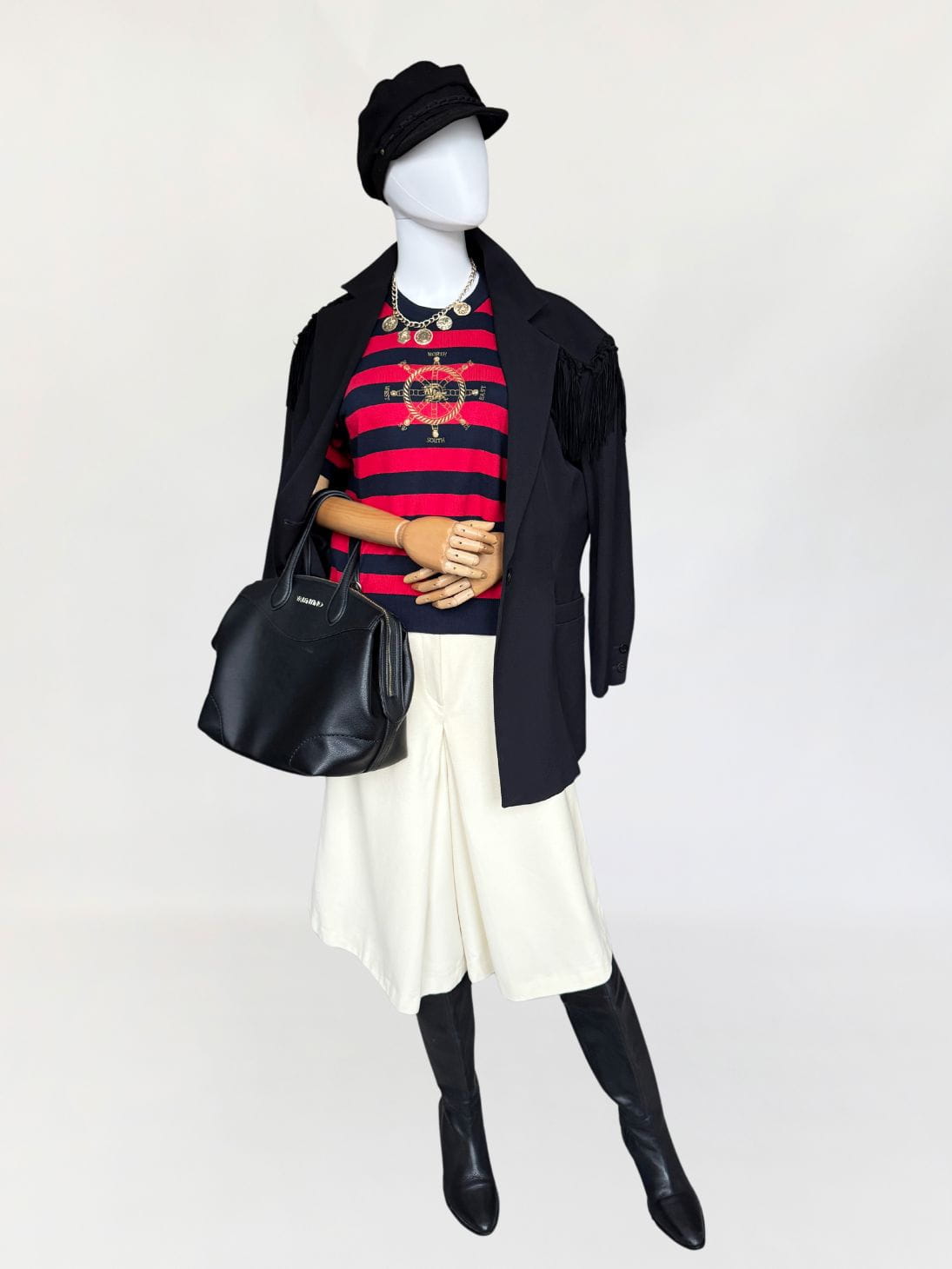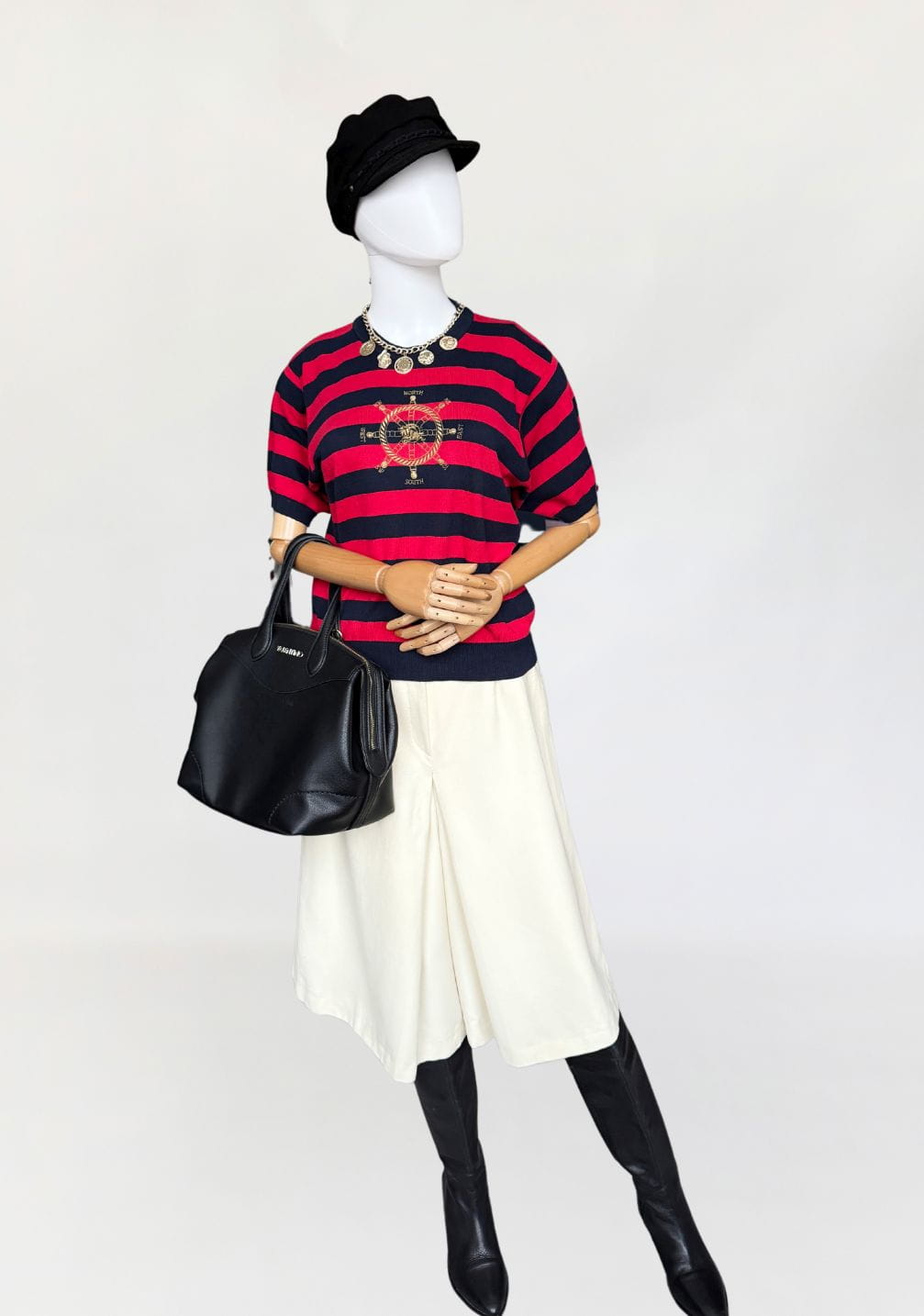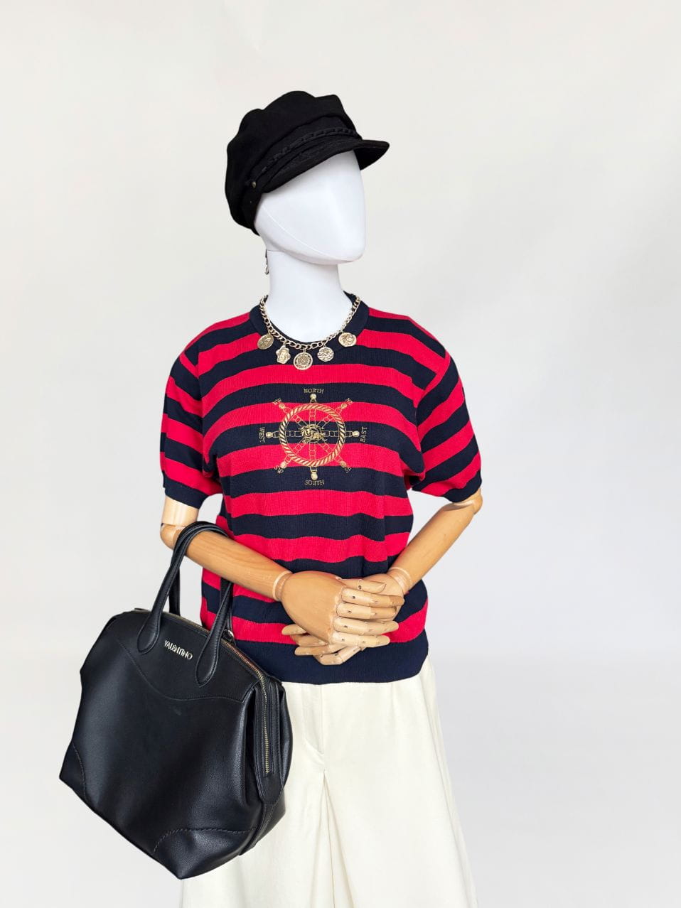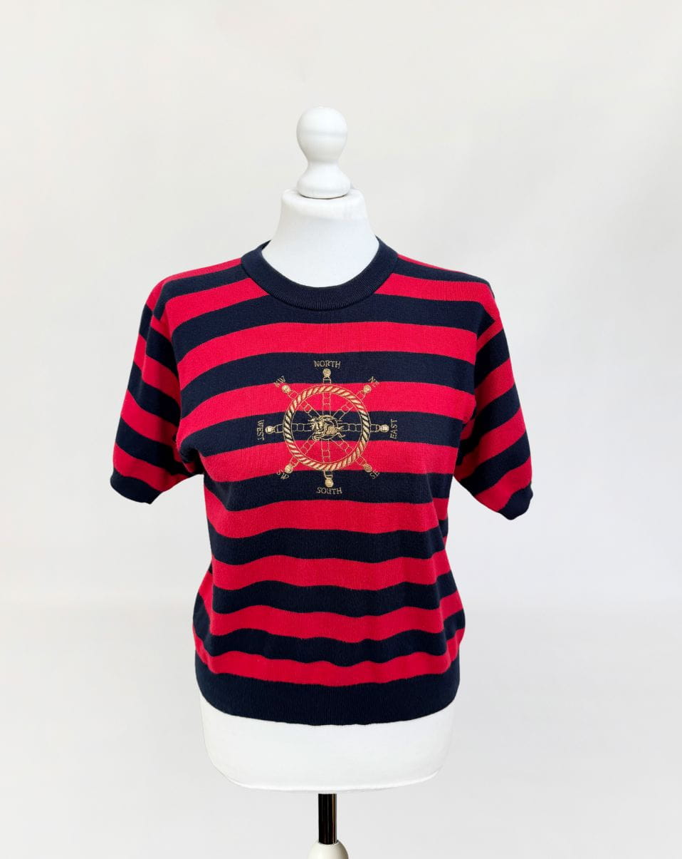 Casual'owy sweter vintage z lat 90-tych marki Burberry (z czasy kiedy marka używała nazwy Burberrys). Wykonany z lekkiej (naszym zdaniem) bawełnianej dzianiny. Model w marynistycznym stylu ze złotą haftowaną aplikacją od frontu.