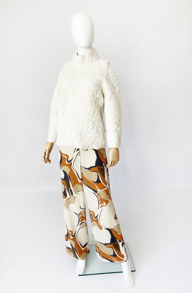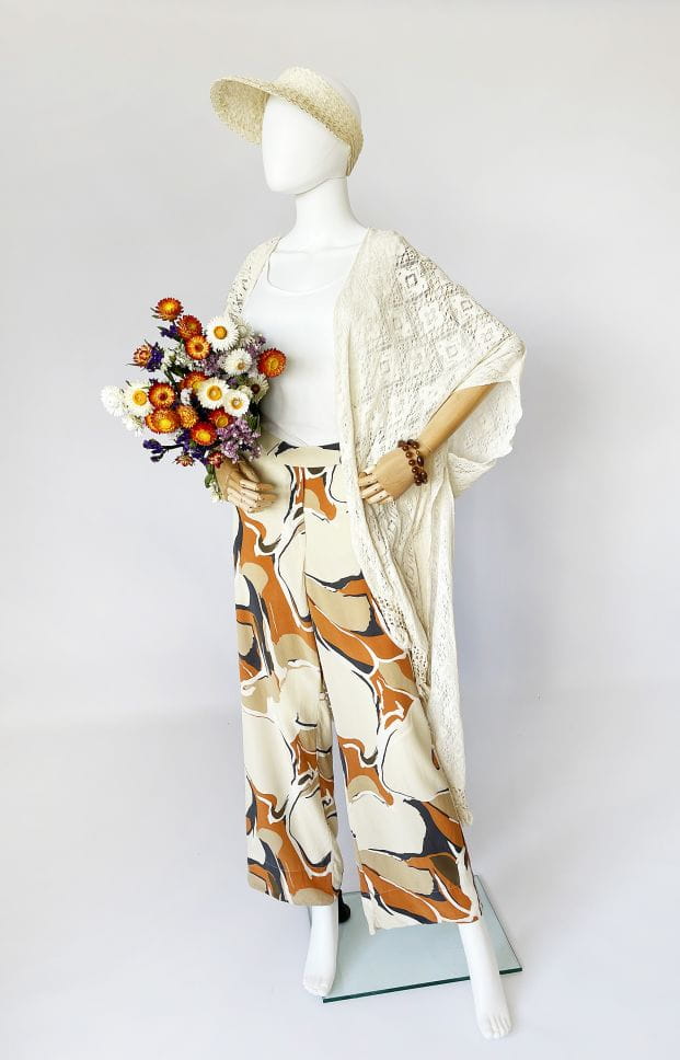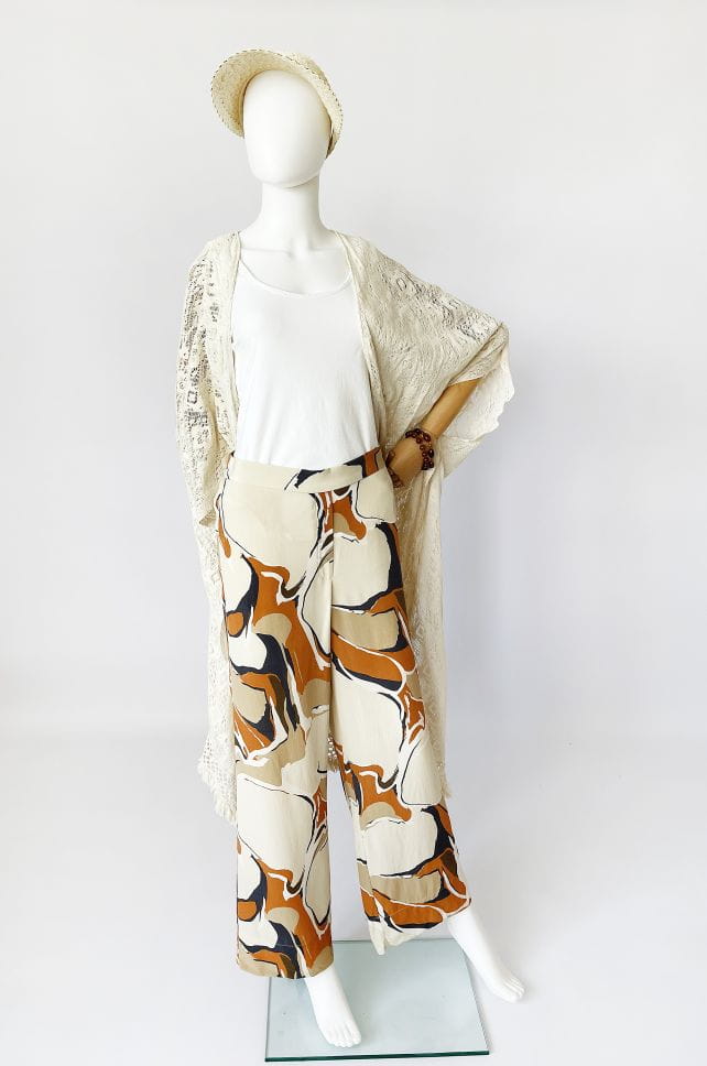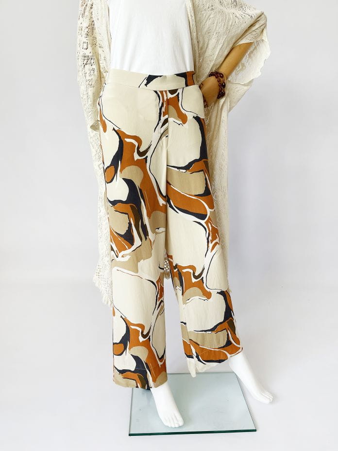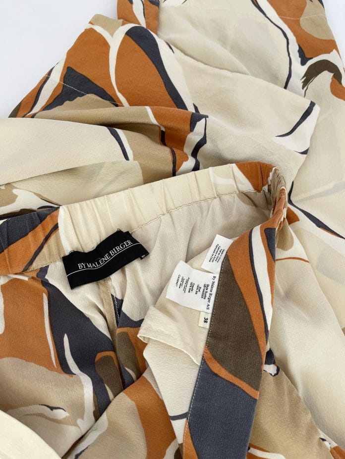 Lekkie spodnie w modernistycznym stylu, projektu renomowanej marki By Malene Birger. Wykonane z naturalnego jedwabiu w artystyczne wzory o stonowanych barwach ziemi. Długie szerokie nogawki. Pas częściowo na gumie. U góry wsuwane kieszenie. Cena sklepowa nowych ok 1300 zł