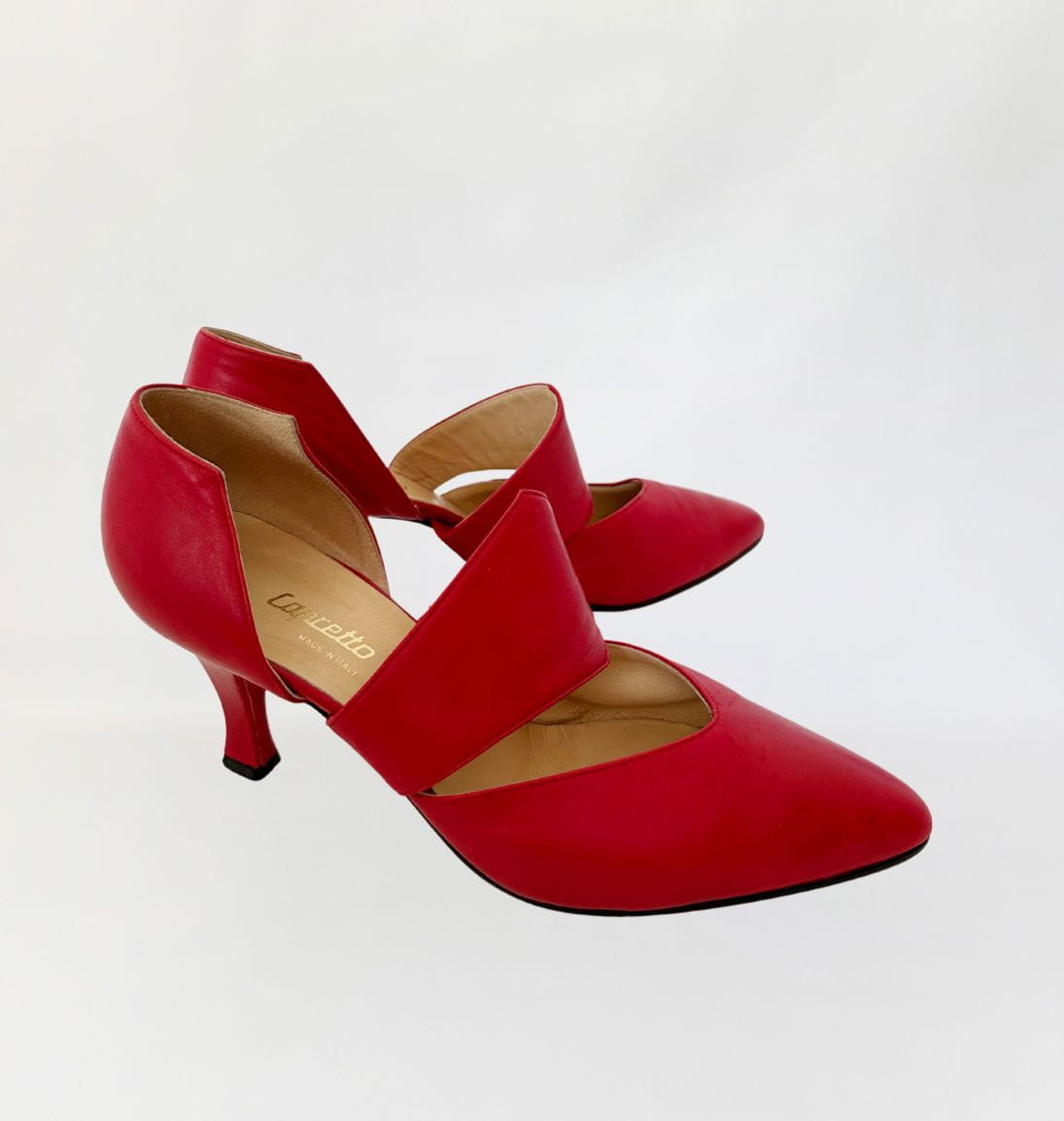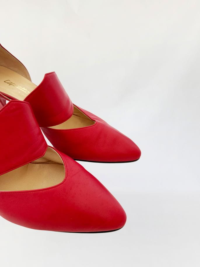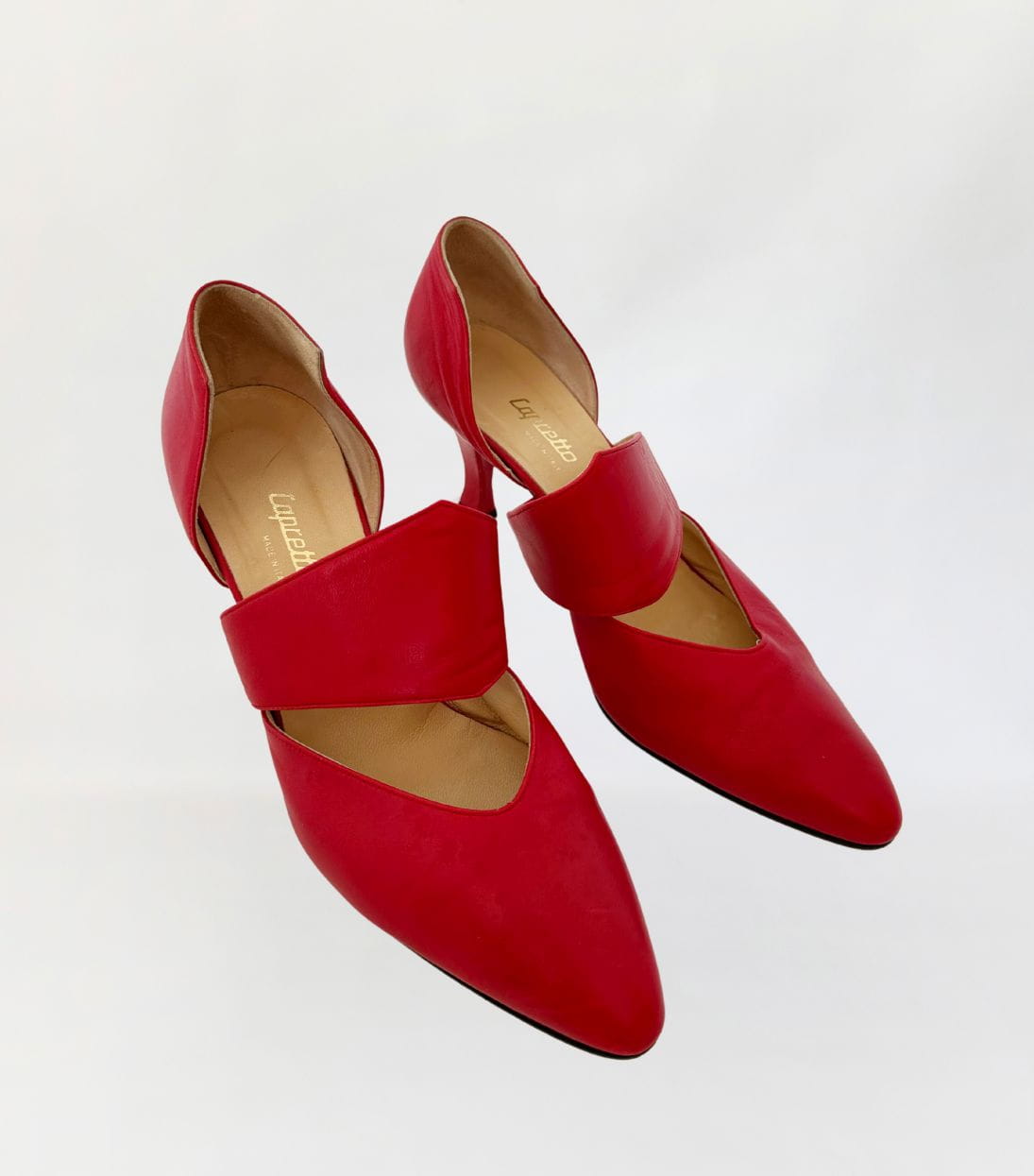 Włoskie czółenka marki Capretto wykonane z miękkiej naturalnej skóry w kolorze czerwonym. Nieduży stabilny obcas, migdałowe noski.