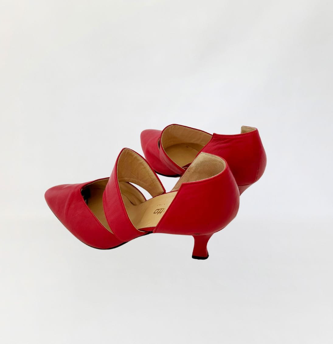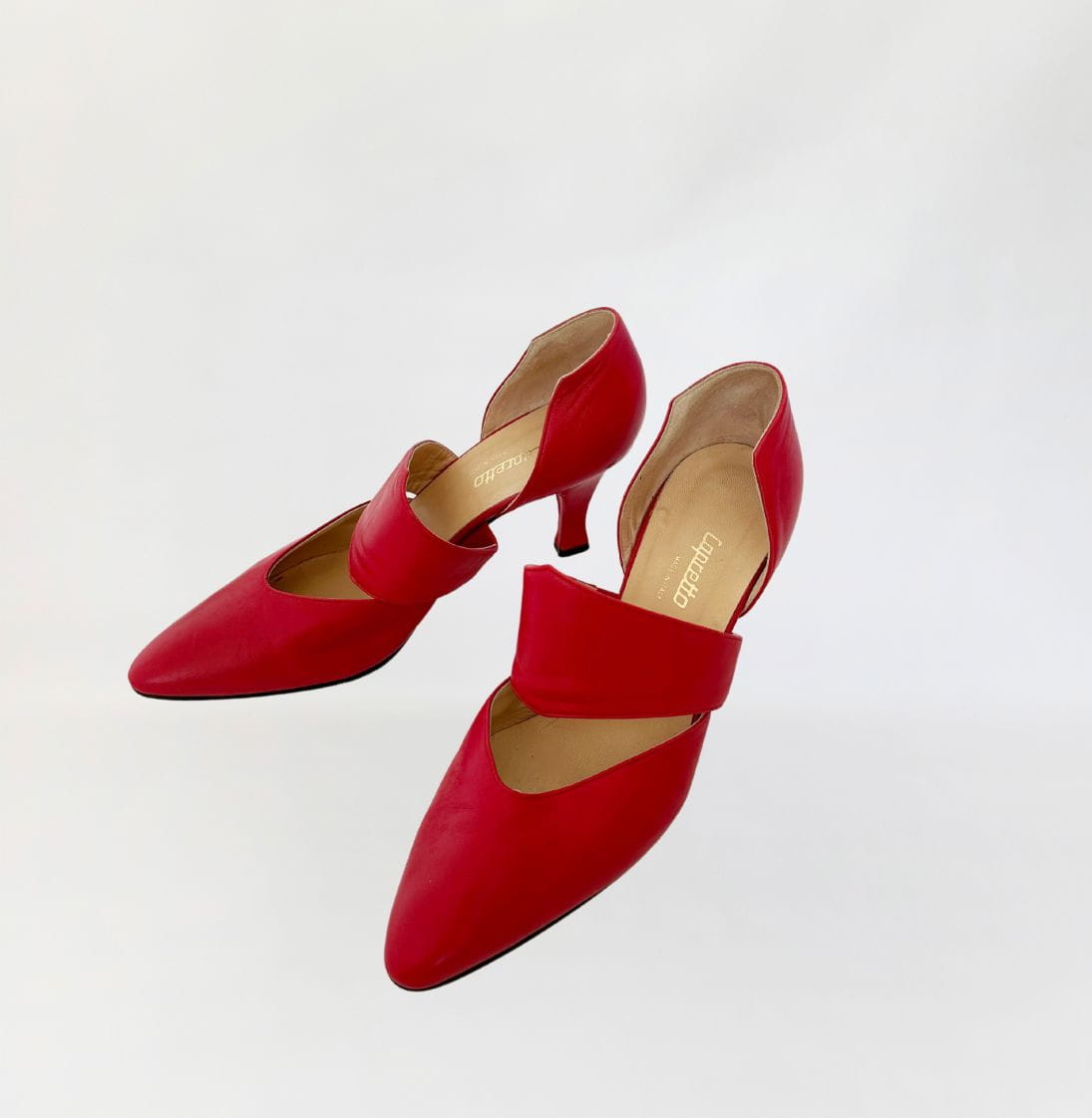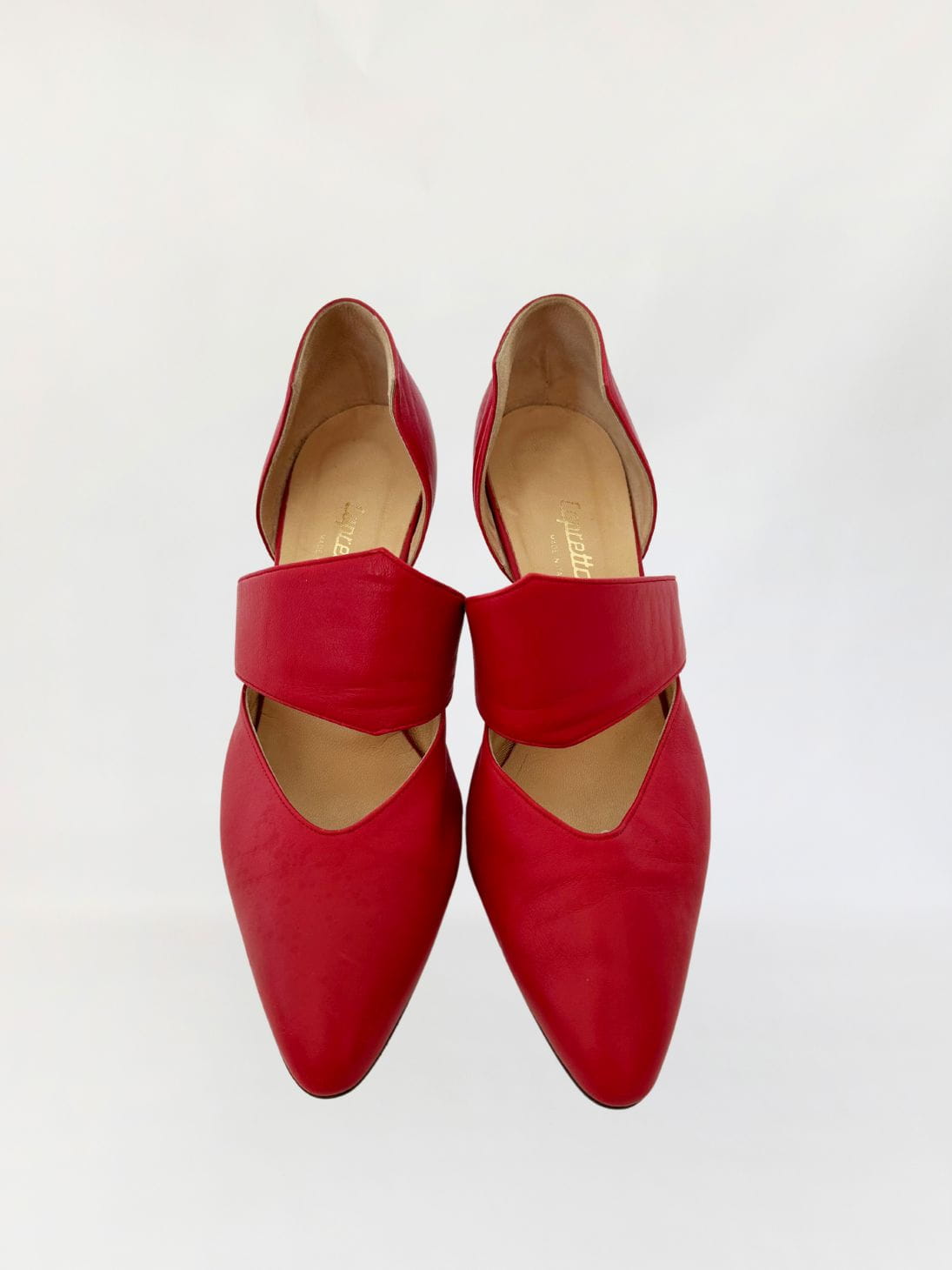 Włoskie czółenka marki Capretto wykonane z miękkiej naturalnej skóry w kolorze czerwonym. Nieduży stabilny obcas, migdałowe noski.