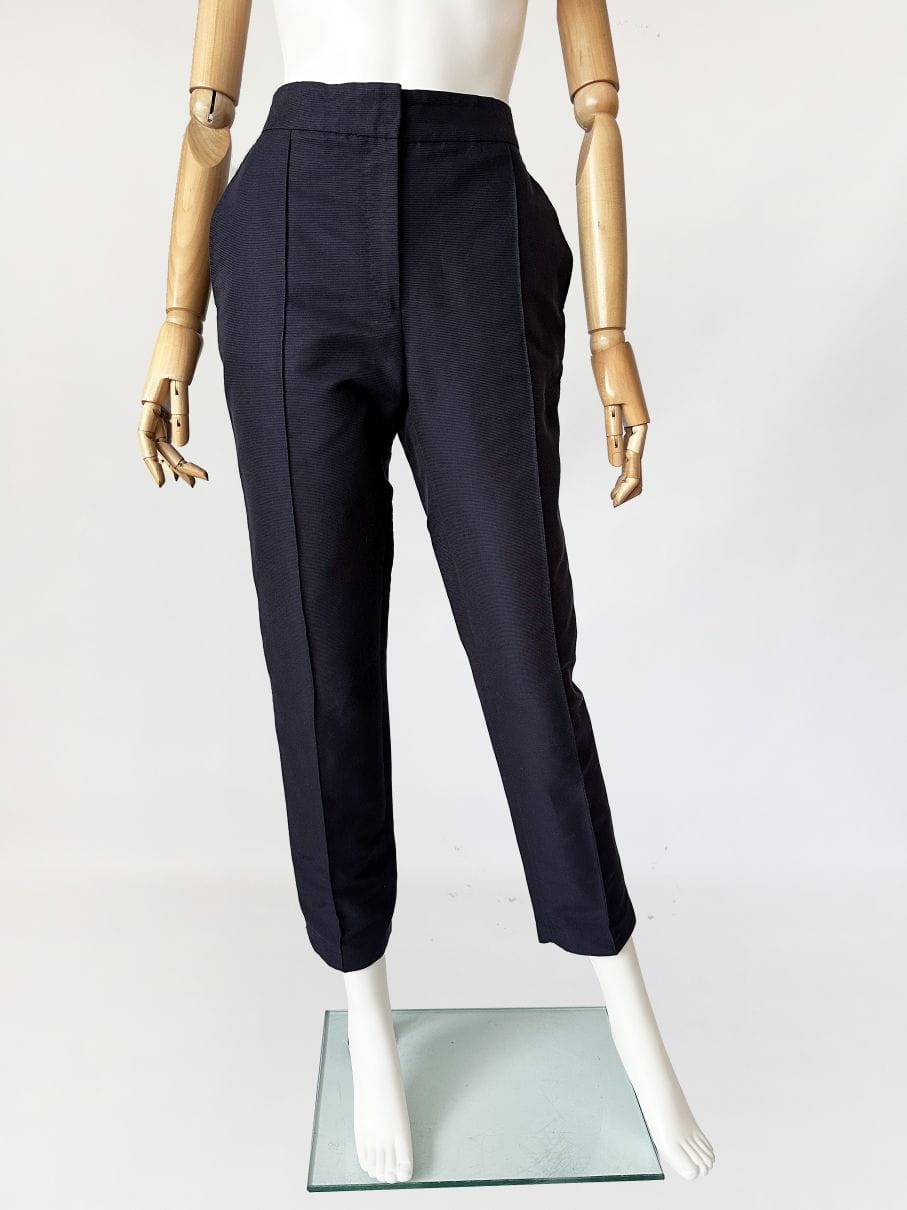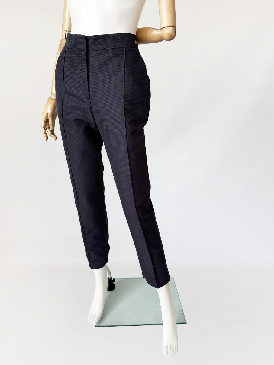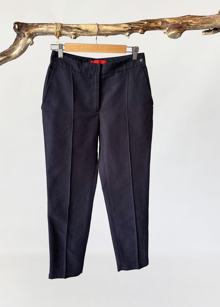Oryginalne spodnie luksusowej marki Carolina Herrera. Wykonane z dobrej jakości tkaniny o rypsowym splocie, jest to bawełna z dodatkiem jedwabiu w kolorze old navy. Model z nieco wyższym stanem i długimi nogawkami o lekko zwężanym fasonie. Przez środek nogawek poprowadzone pionowe szwy, tworzące efekt kantu. W pasie wsuwane kieszenie, a po boku złota naszywka z inicjałami projektantki. Model w typie cygaretek, doskonałe jako smart casual, casual biznes. Gwarantujemy, że pokochasz je od pierwszego założenia :-)