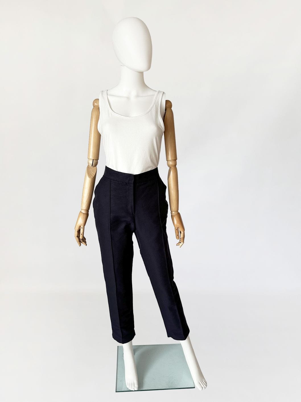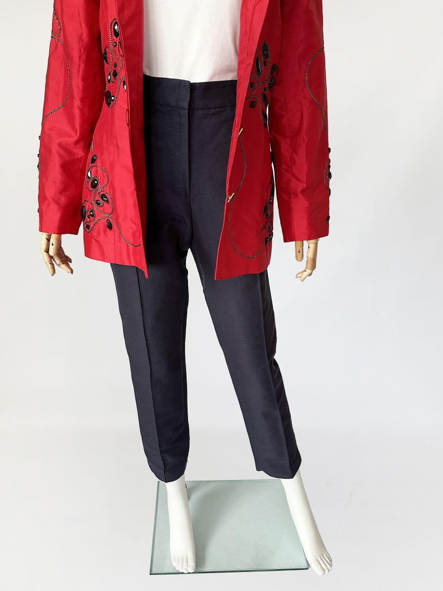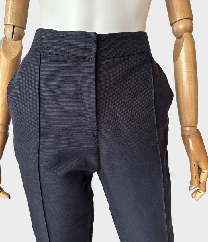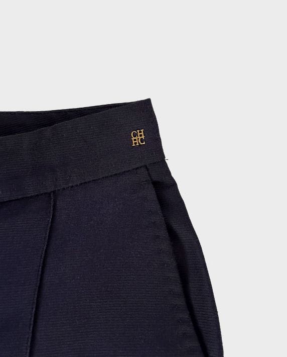 Oryginalne spodnie luksusowej marki Carolina Herrera. Wykonane z dobrej jakości tkaniny o rypsowym splocie, jest to bawełna z dodatkiem jedwabiu w kolorze old navy. Model z nieco wyższym stanem i długimi nogawkami o lekko zwężanym fasonie. Przez środek nogawek poprowadzone pionowe szwy, tworzące efekt kantu. W pasie wsuwane kieszenie, a po boku złota naszywka z inicjałami projektantki. Model w typie cygaretek, doskonałe jako smart casual, casual biznes. Gwarantujemy, że pokochasz je od pierwszego założenia :-)